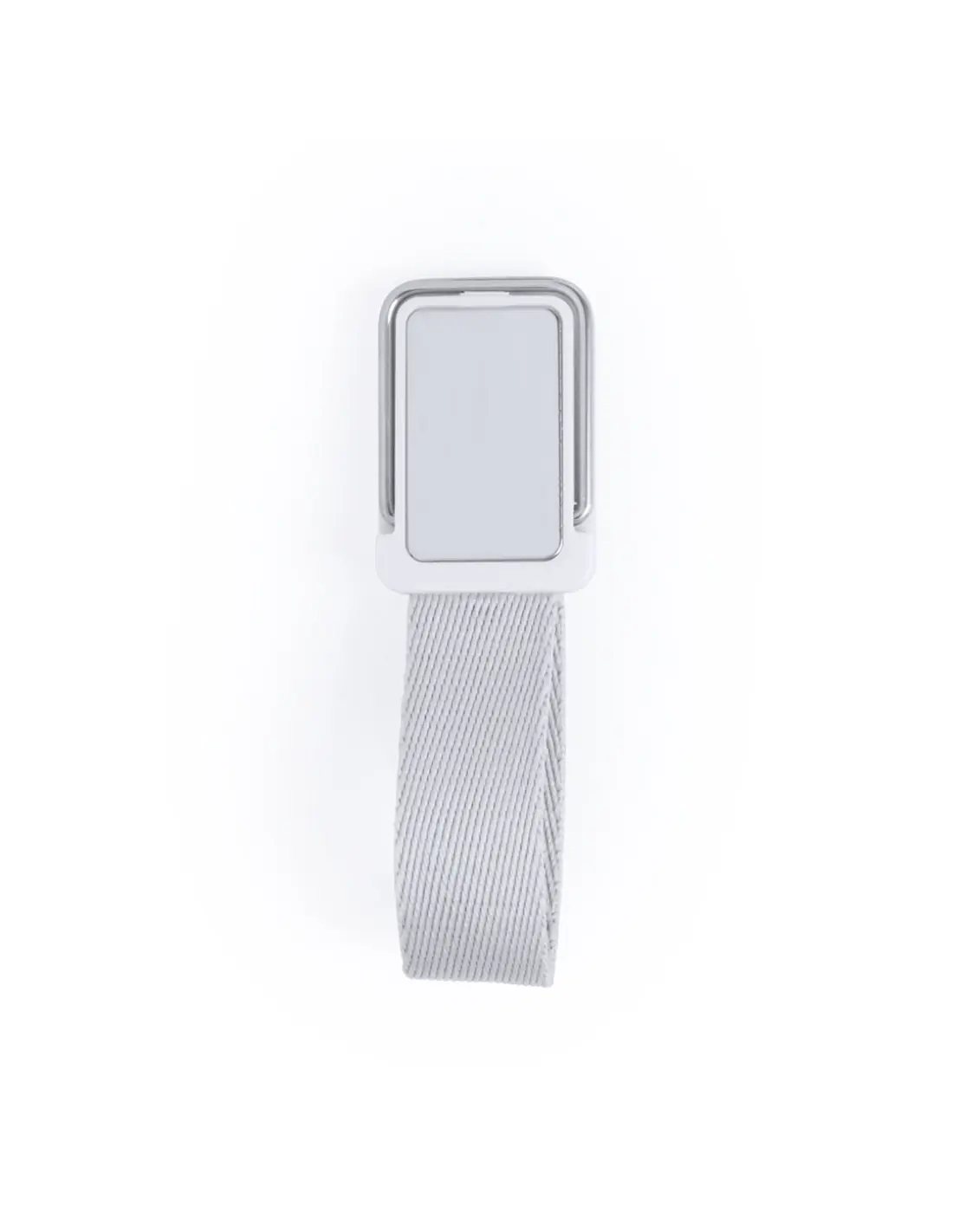 Original soporte adhesivo para smartphone con cinta para selfies en resistente poliéster y pastilla central para marcaje. Con soporte metálico y presentado en atractiva bolsita de diseño.