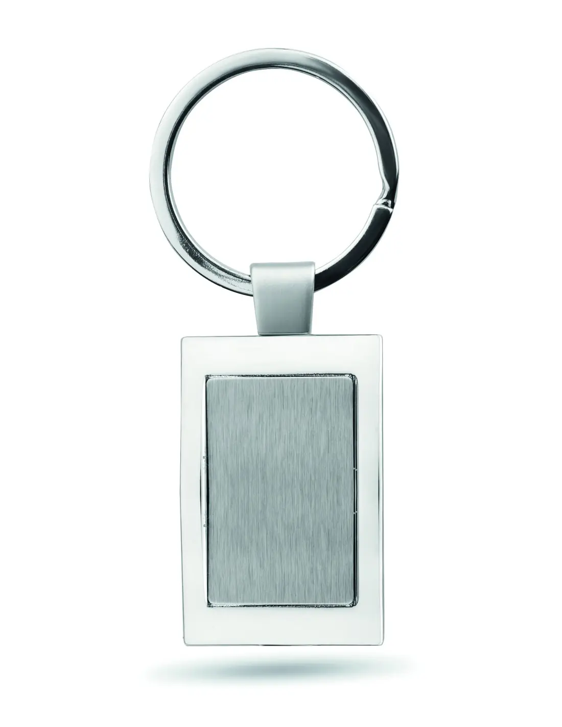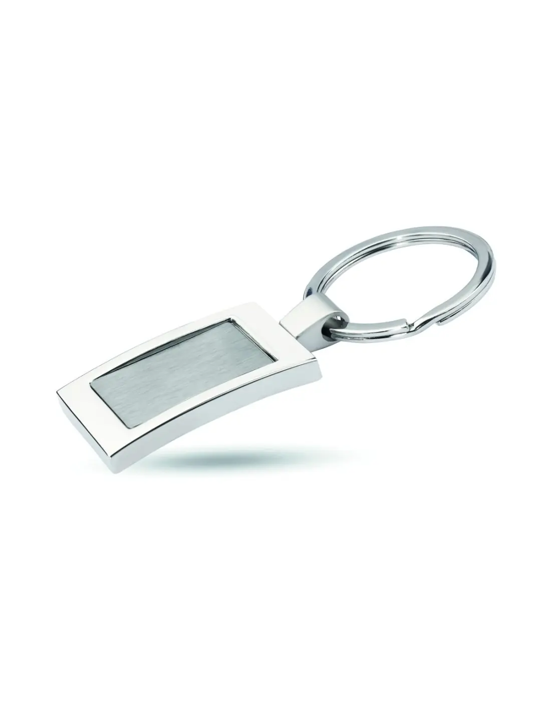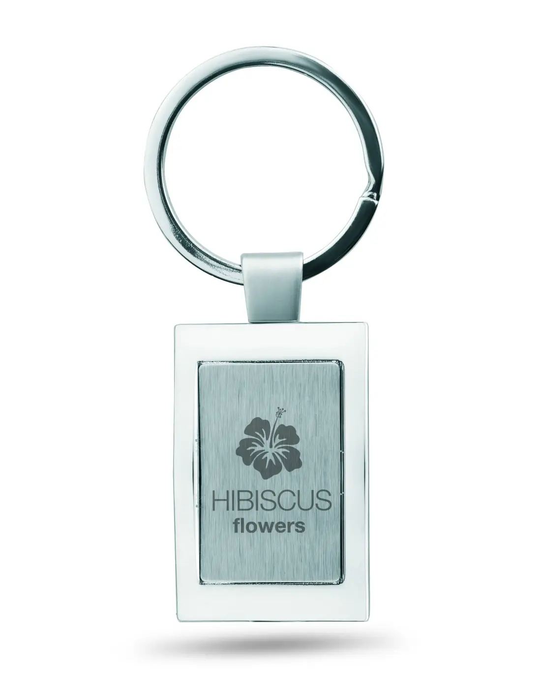 Lujoso llavero rectangular de aleación de zinc cromado. Presentado en caja de regalo individual.