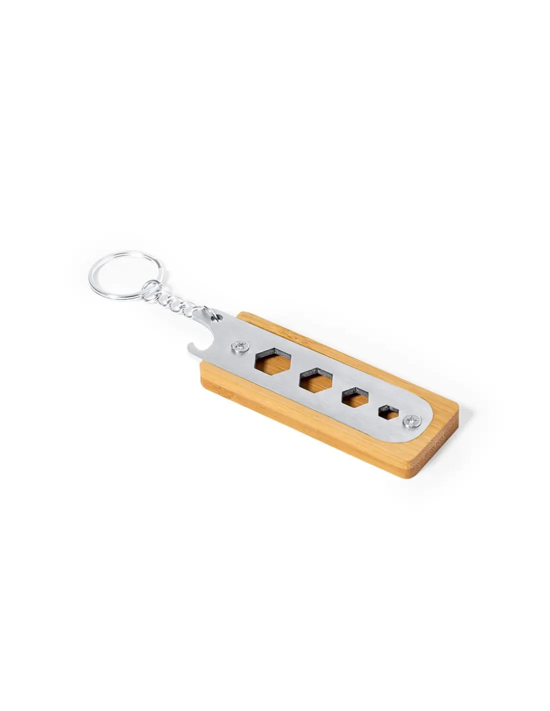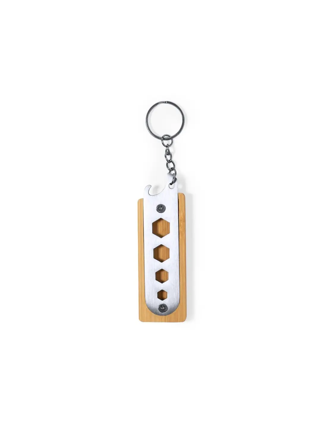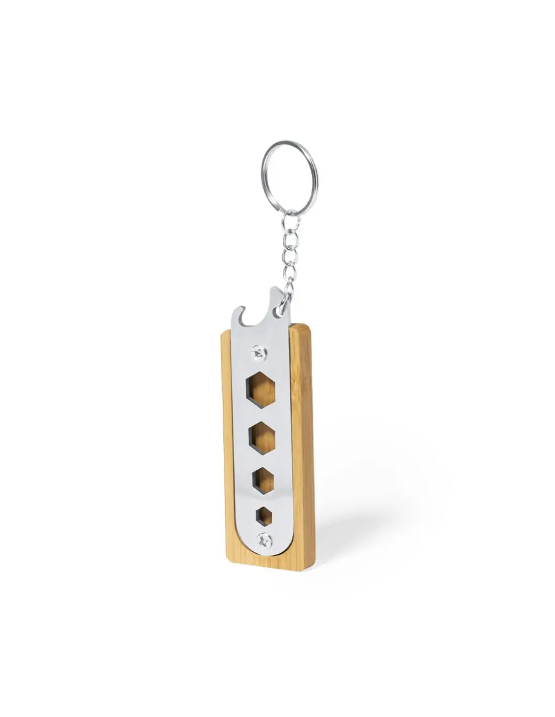 Llavero multiherramienta fabricado en resistente acero inox y bambú. Con práctico conjunto de 4 llaves fijas hexagonales troqueladas y abrebotellas. Presentado en caja individual de diseño kraft.