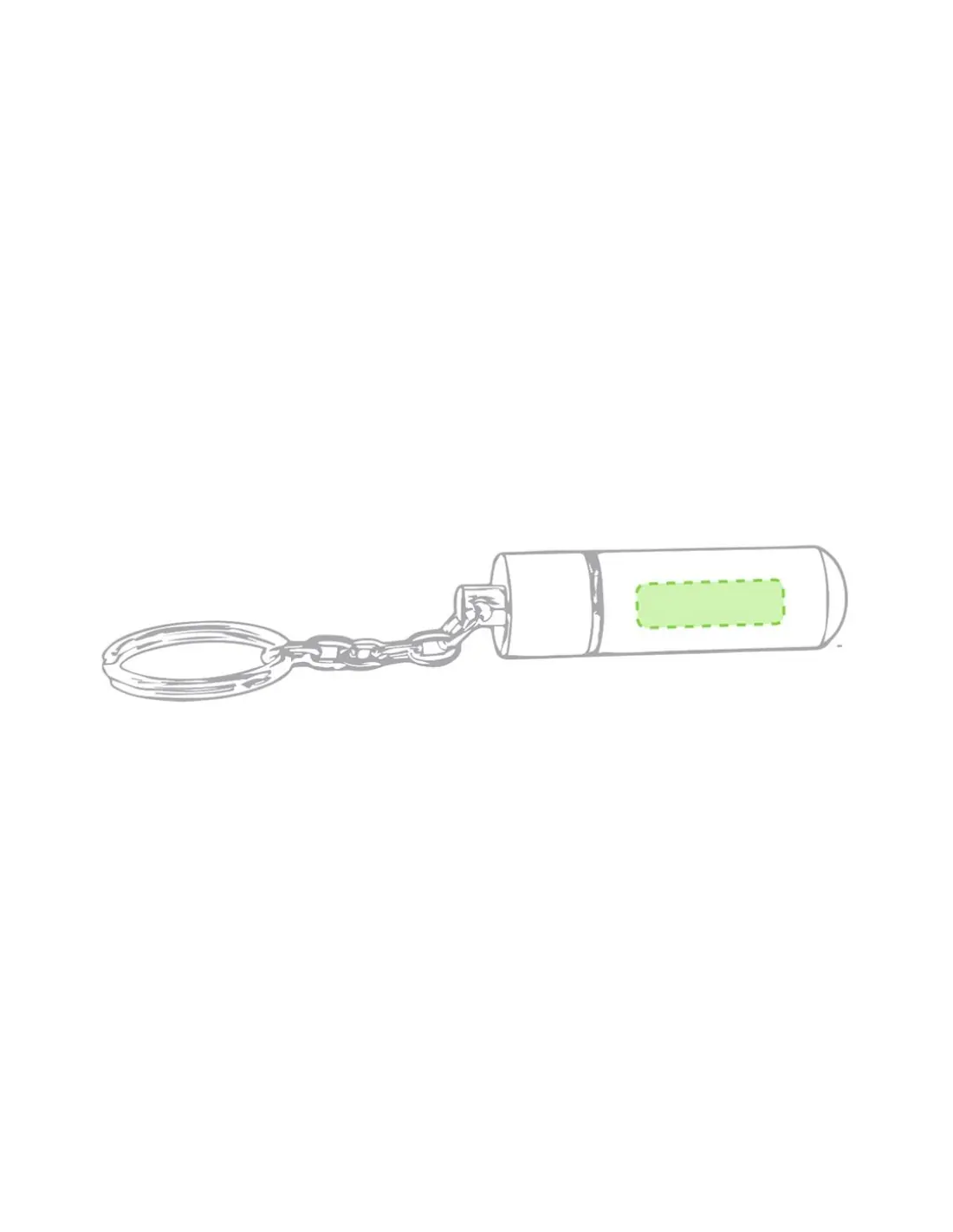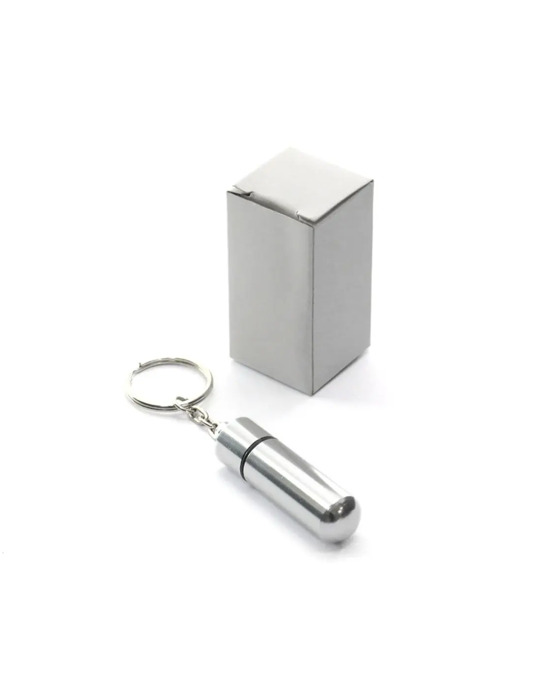 Llavero pastillero de discreto diseño con cuerpo en aluminio de acabado brillante y cierre a rosca.