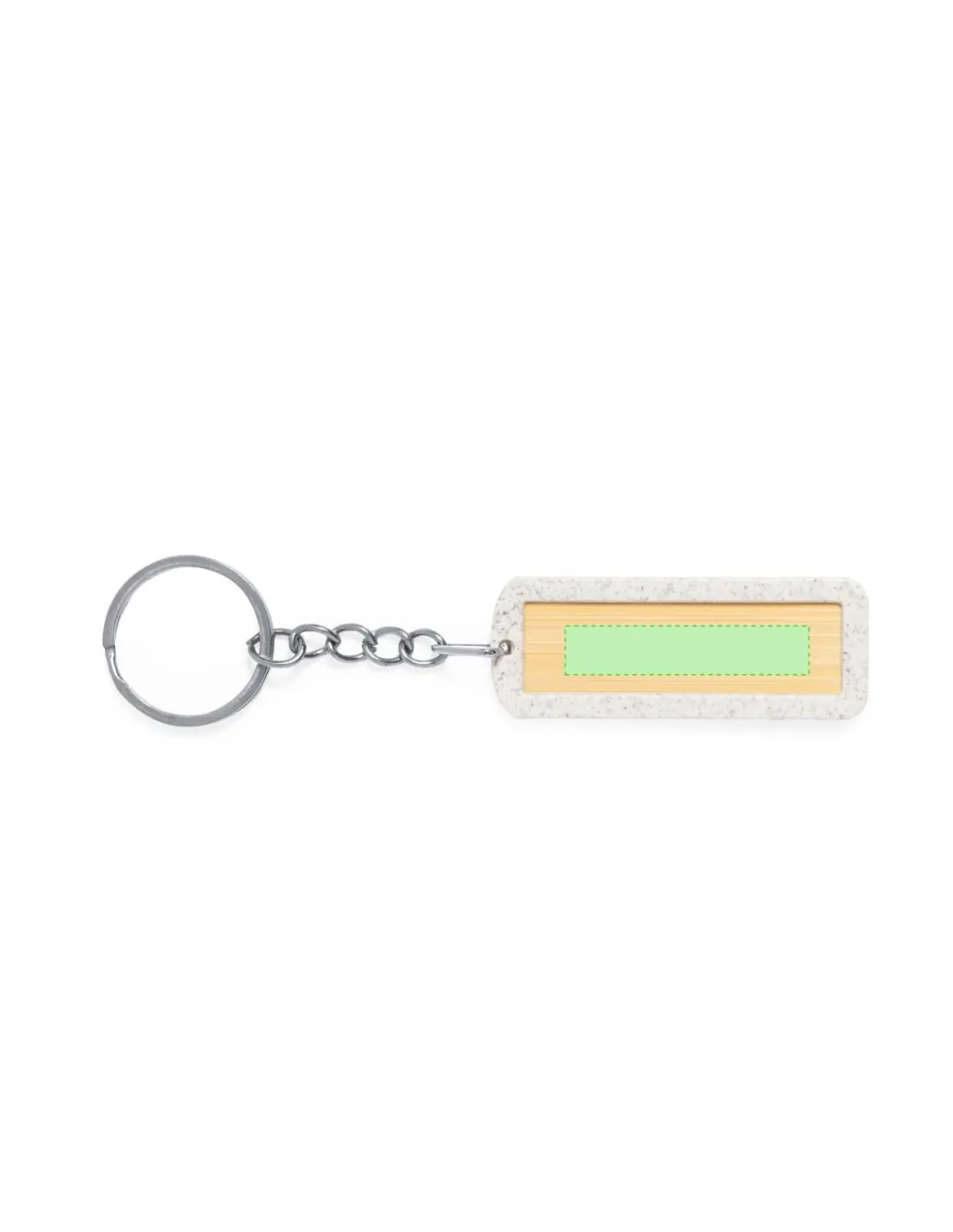 Llavero eco fabricado en bambú con marco en caña de trigo. De forma rectangular y con amplia zona de marcaje. La caña de trigo fomenta la utilización de materias primas naturales, reduciendo así las emisiones contaminantes.