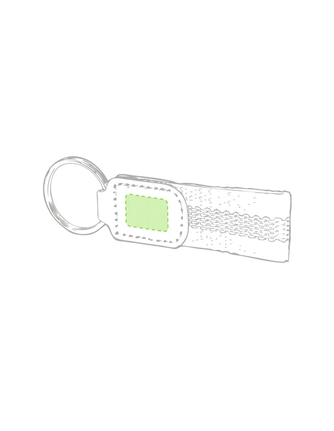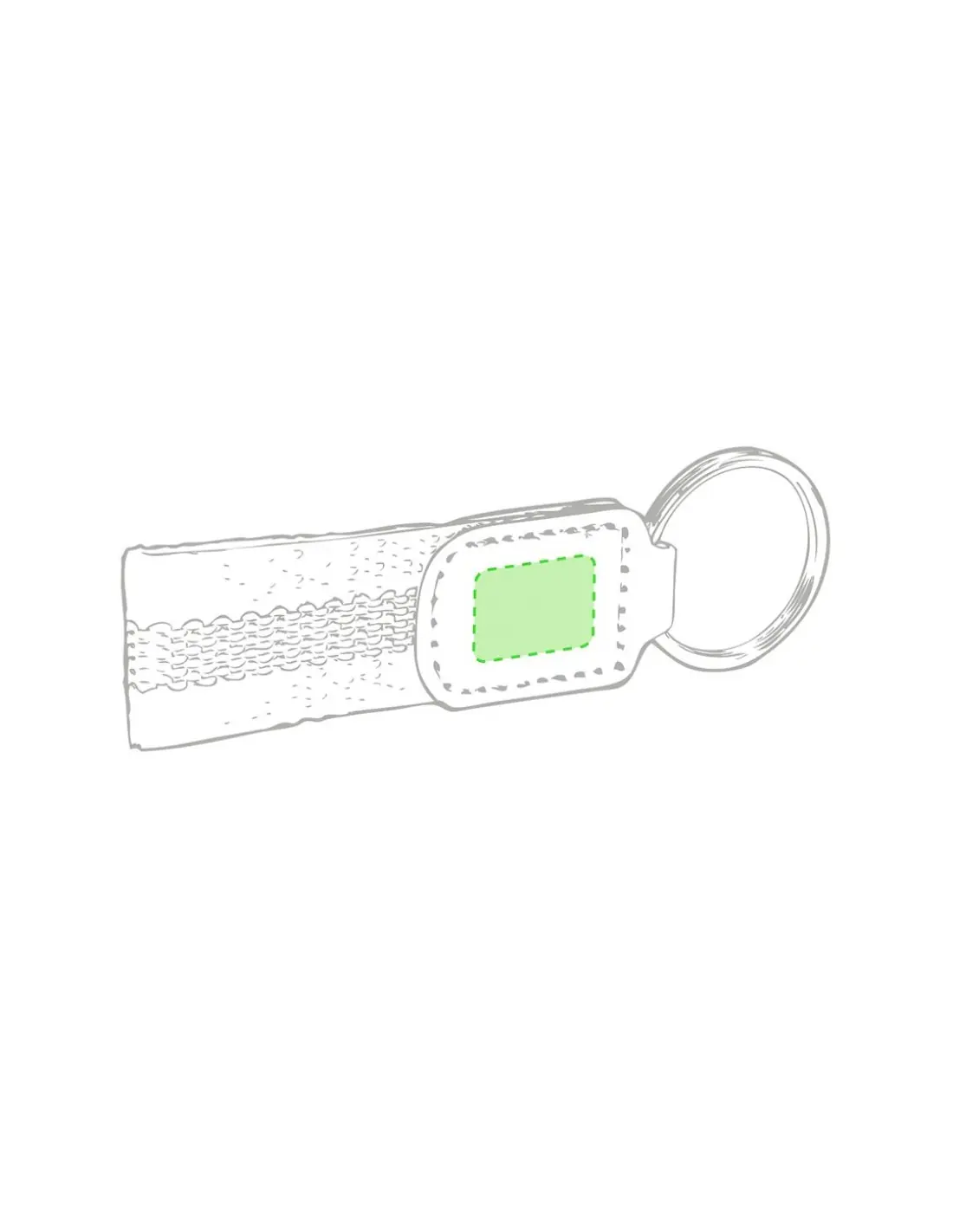Llavero de poliéster con accesorios de bandera española en la cinta y refuerzo en polipiel de color marrón.