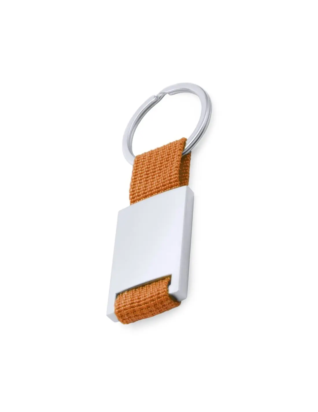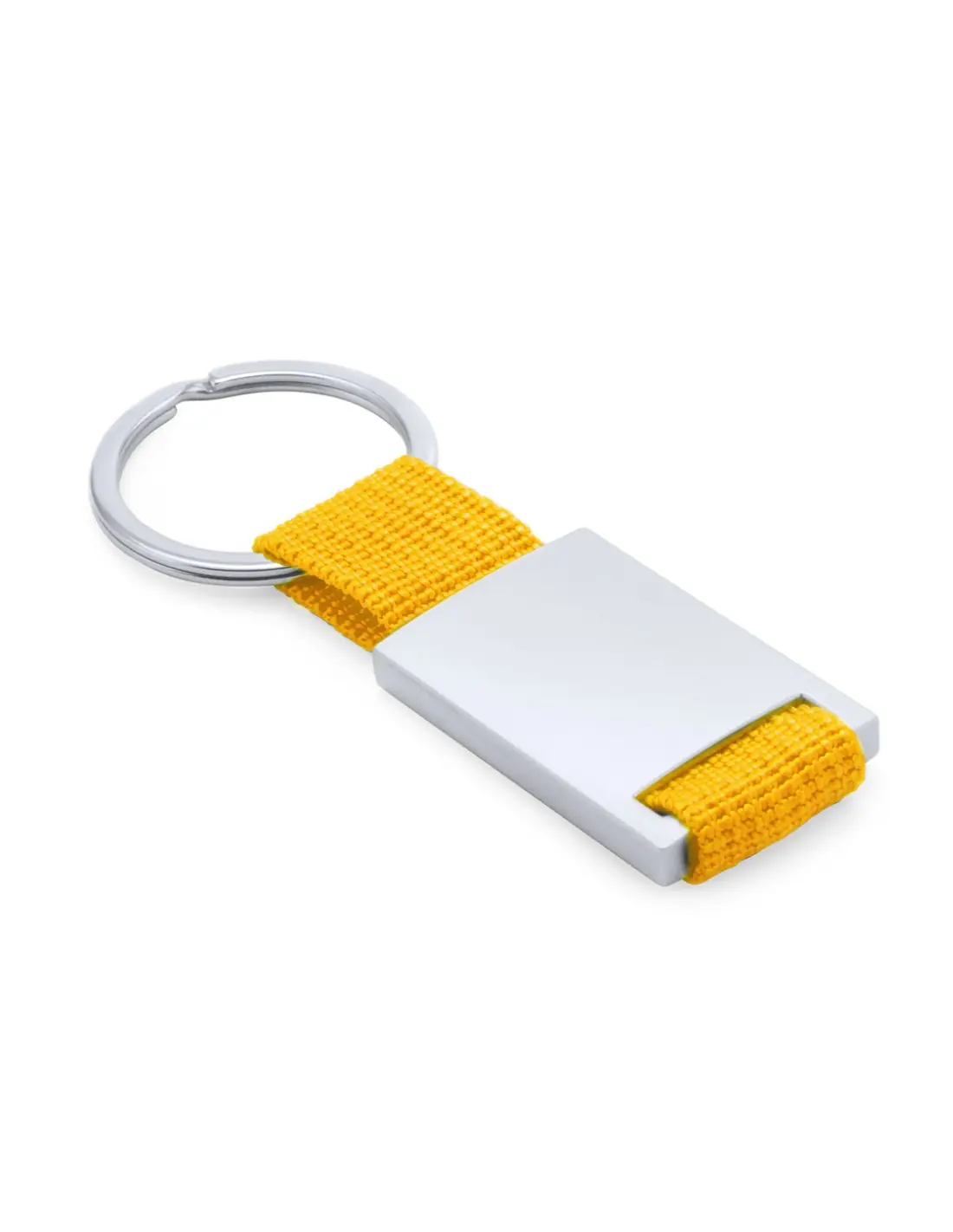 Llavero de divertido diseño con cinta de poliéster de variados y vivos colores. Con cuerpo metálico especialmente diseñado para marcaje en láser.