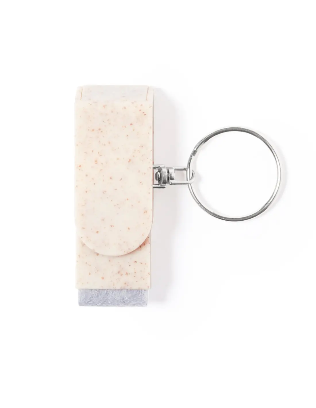 Llavero soporte para smartphone de línea nature, fabricado en caña de trigo. Con mecanismo giratorio y accesorio limpiapantallas incluido. Anilla...