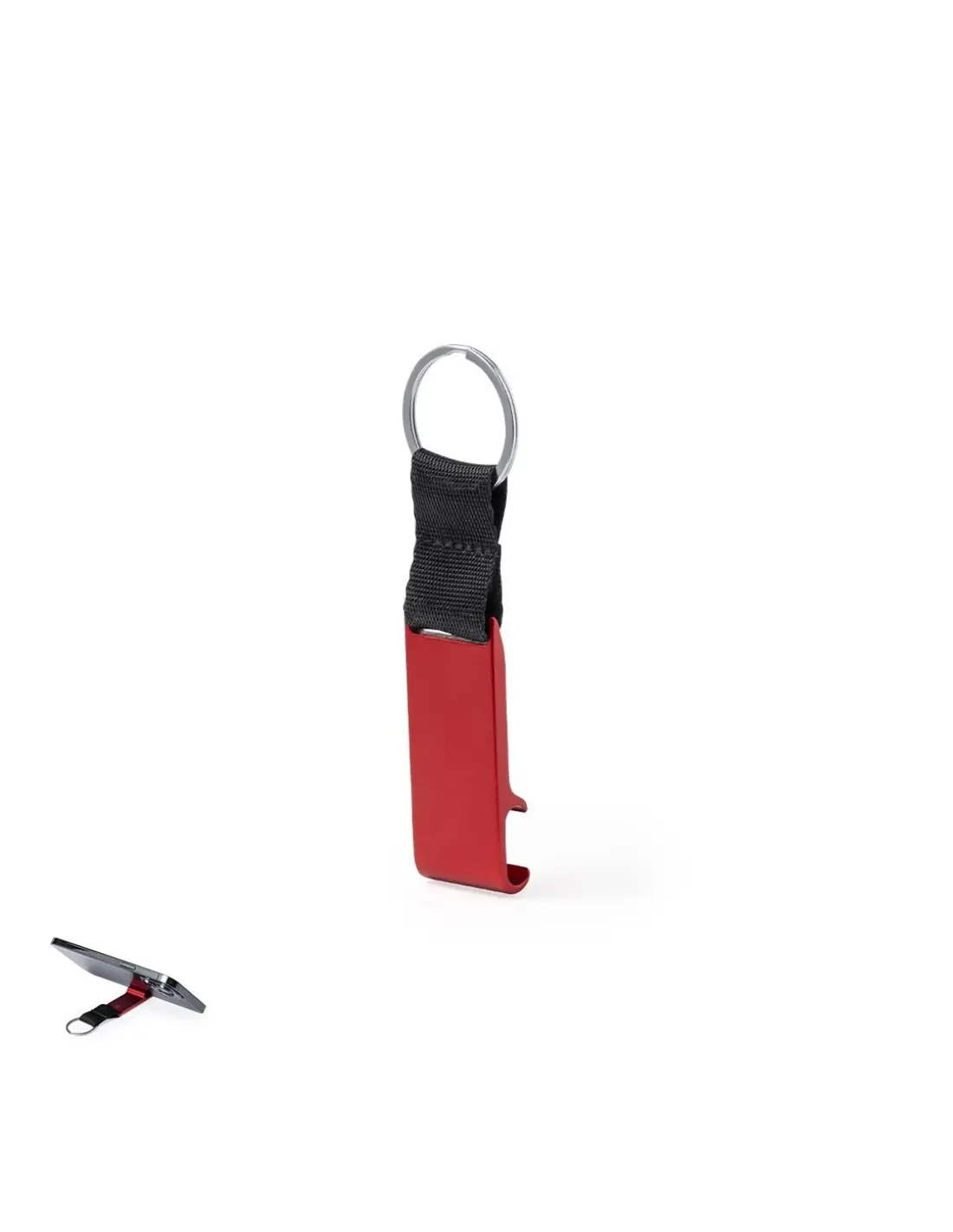 Llavero soporte fabricado en Aluminio Reciclado, especialmente diseñado para smartphone y tablet. De acabado mate, con cinta en nylon de color negro...