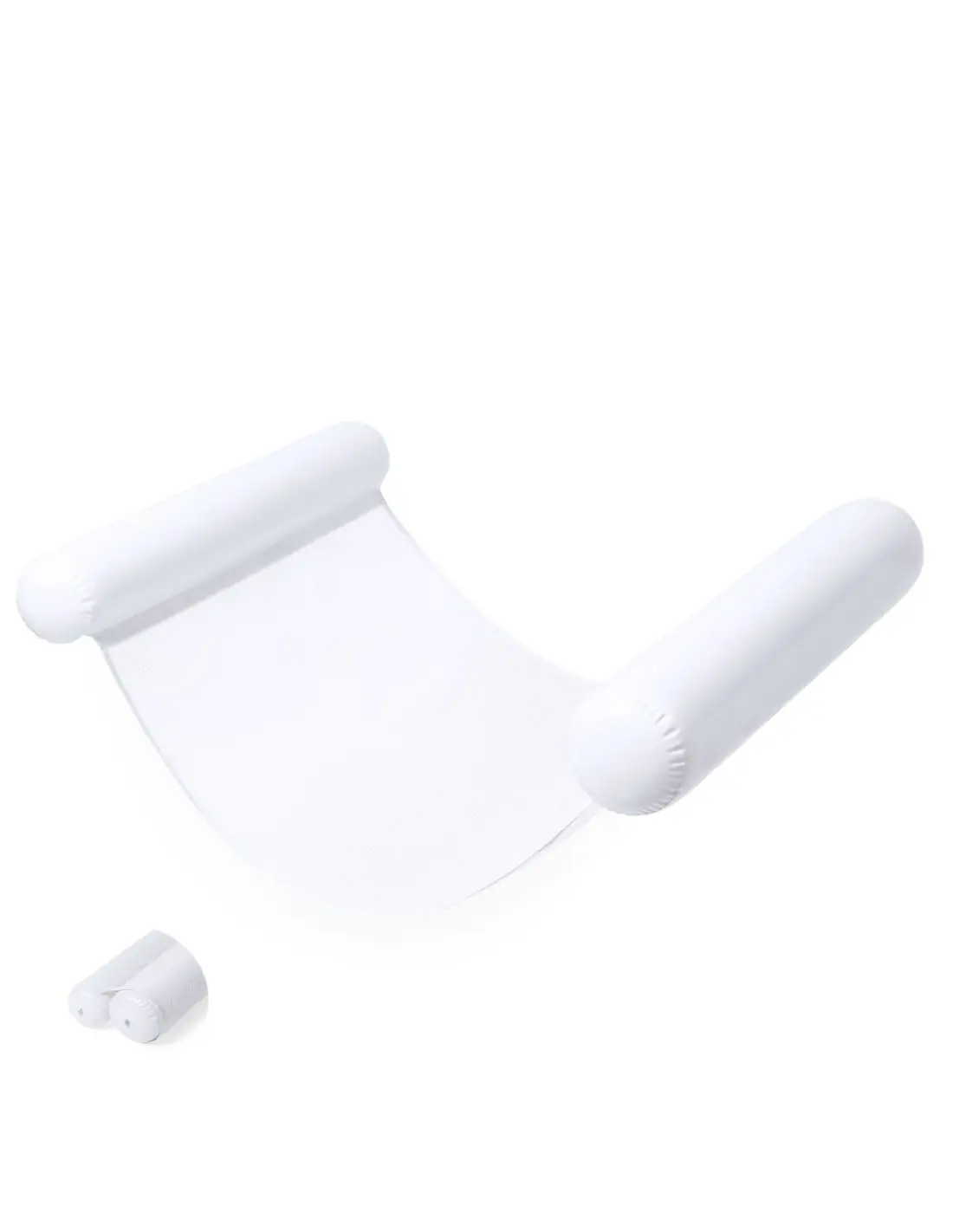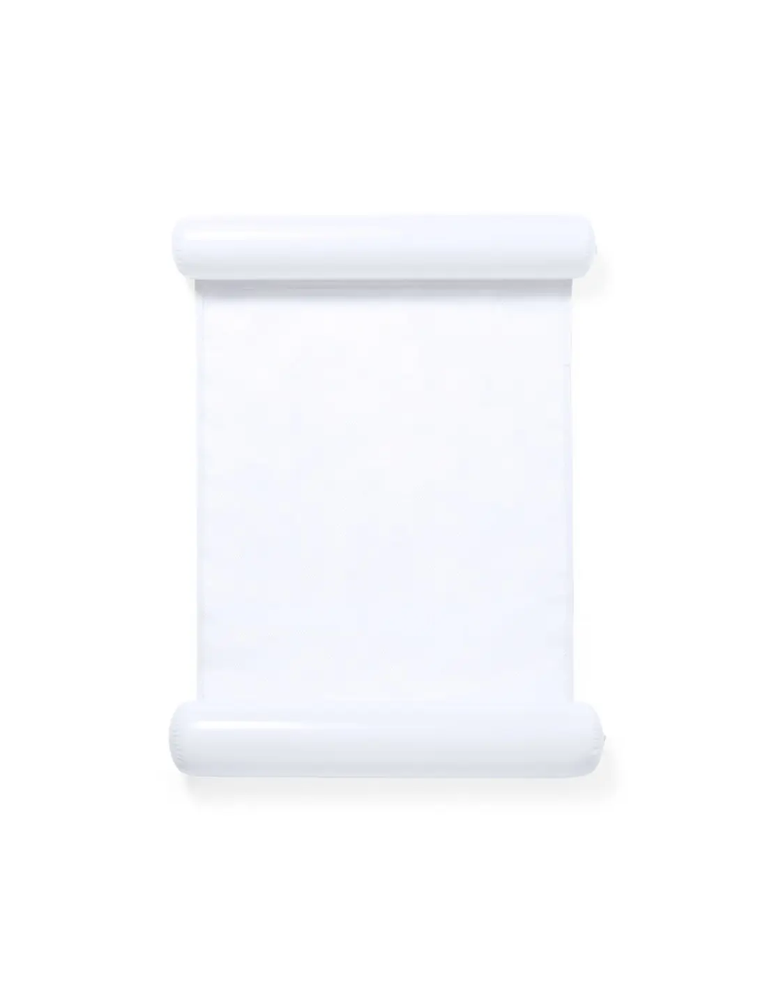 Original colchoneta con extremos hinchables en resistente PVC. Enrollable y con resistente redecilla central de 80x70 cm en poliéster de color blanco. Con plegado especial para fácil impresión y disponible en variada gama de colores.
