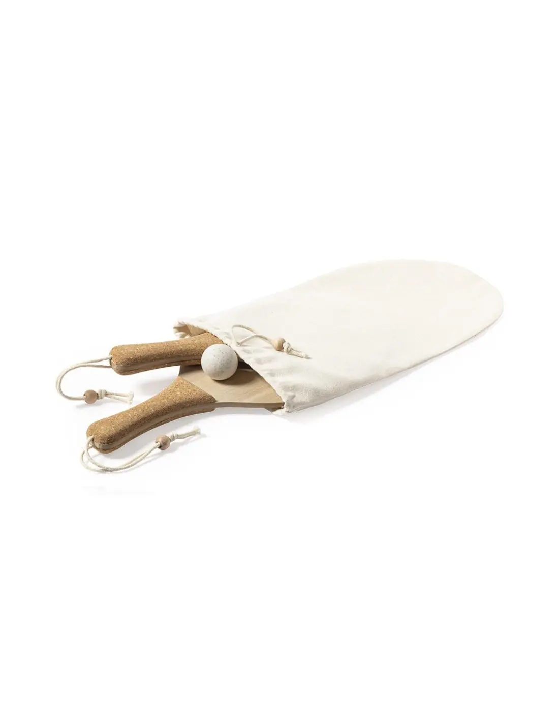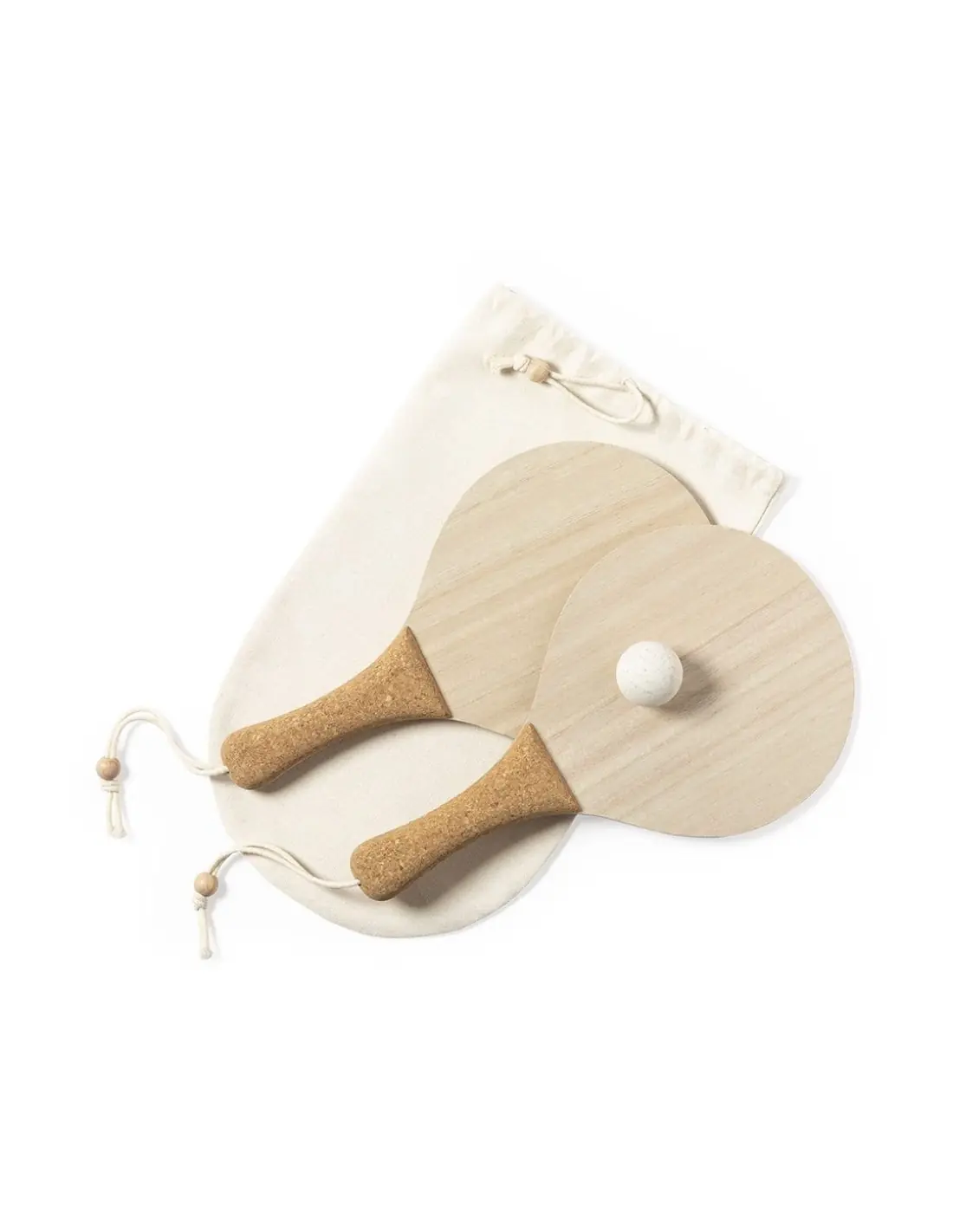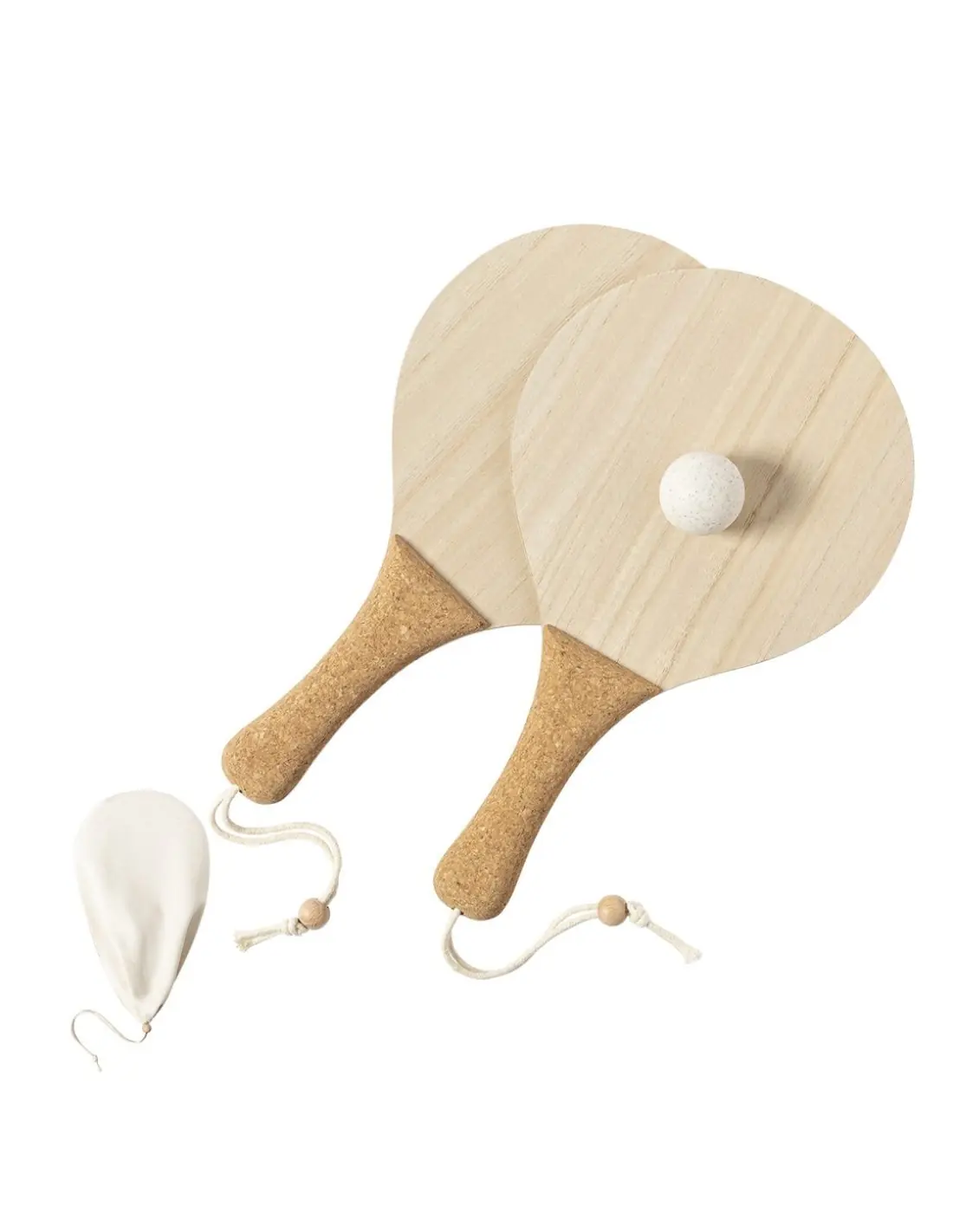 Par de palas de playa de línea nature. Fabricadas en madera, con mango reforzado en corcho natural y cintas para muñeca con ajustador. Presentadas en bolsa de algodón natural con cierre de cordón y pelota en caña de trigo.