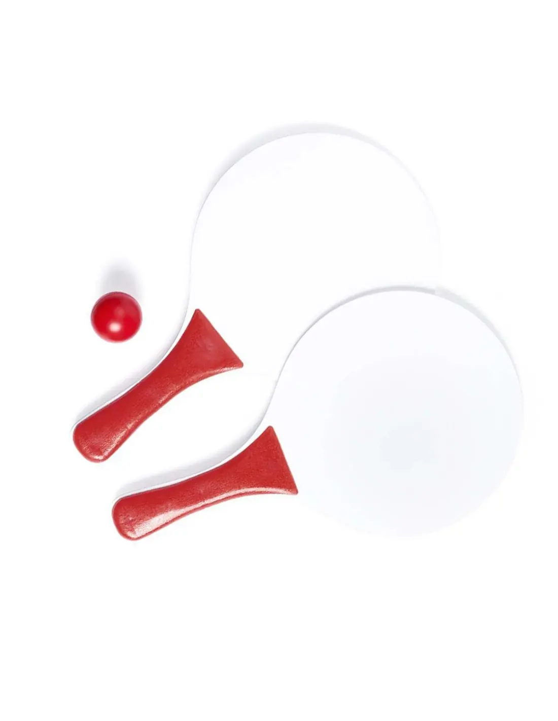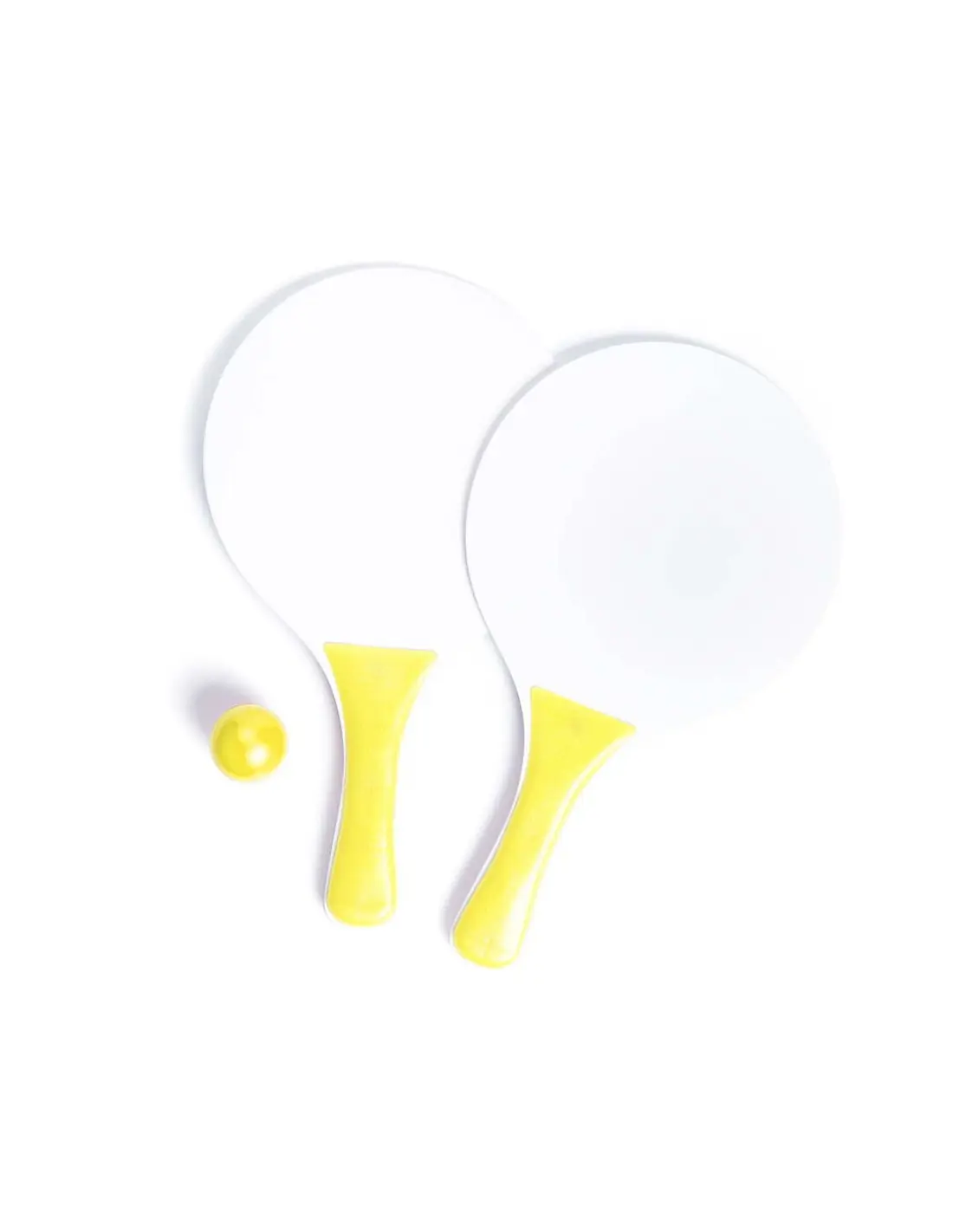 Par de palas de playa en madera natural con mango reforzado en variada gama de vivos colores. Presentadas en bolsa redecilla con pelota a juego.