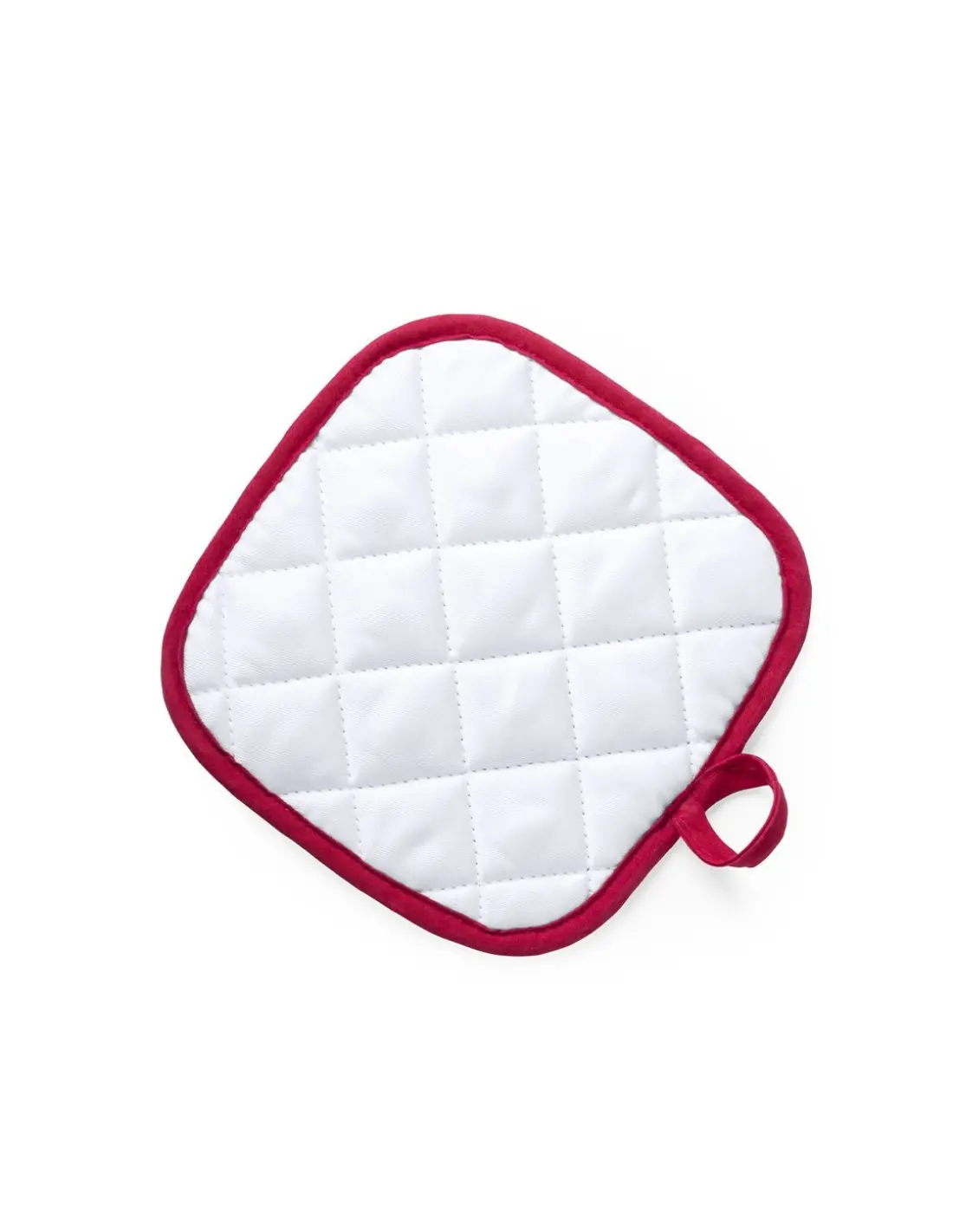 Agarrador de cocina en suave material 100% poliéster de suave acabado en color blanco y con bordes en vivos colores. Con una cara lisa especialmente diseñada para sublimación y cinta para colgar.