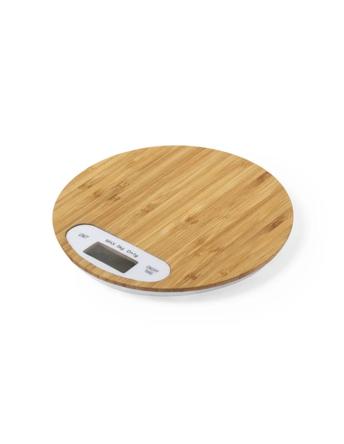 Báscula de cocina de línea nature en bambú pulido. Display digital, con funciones de apagado automático, tara y selección de unidad de pesaje. Alimentación a pilas (de botón incluidas) y peso máximo 5kg. Presentada en atractiva caja de diseño eco.