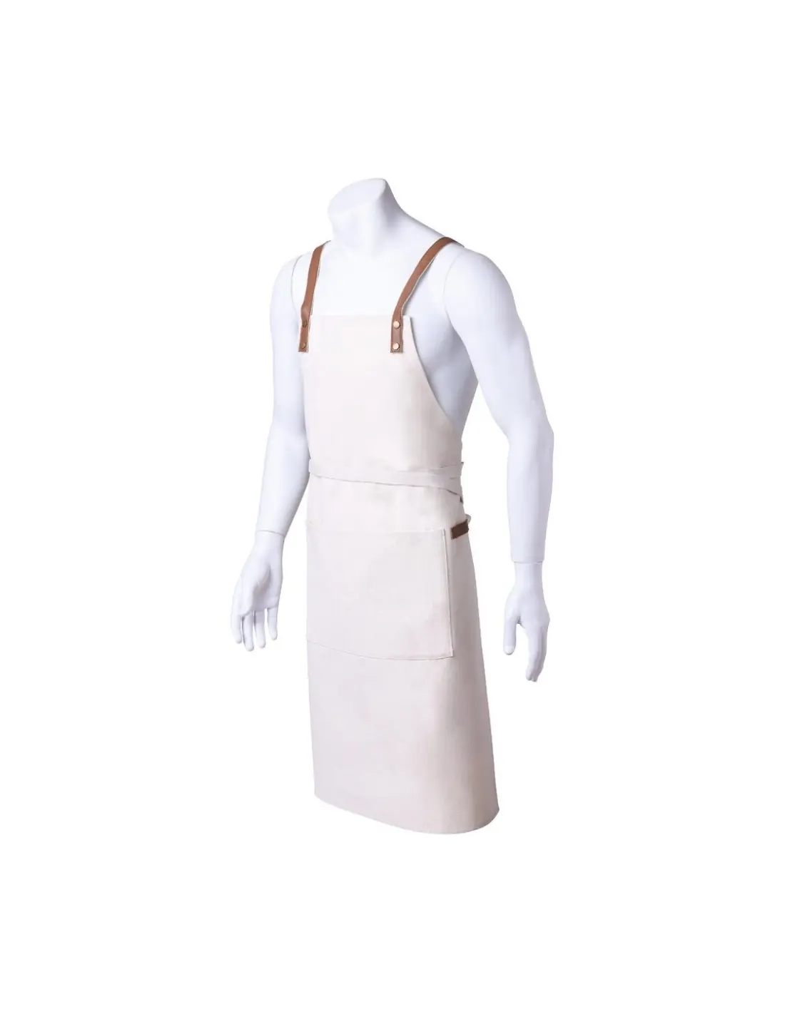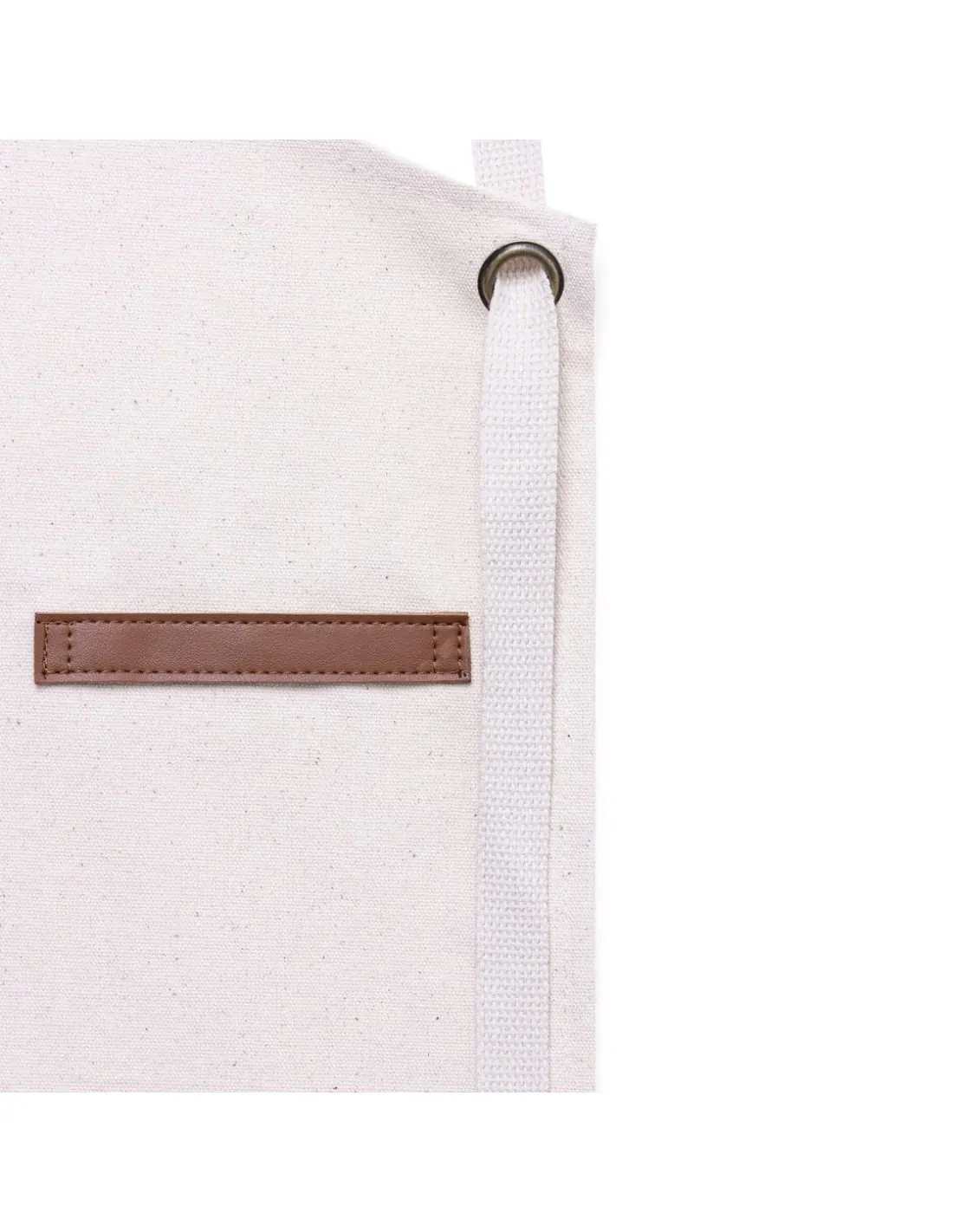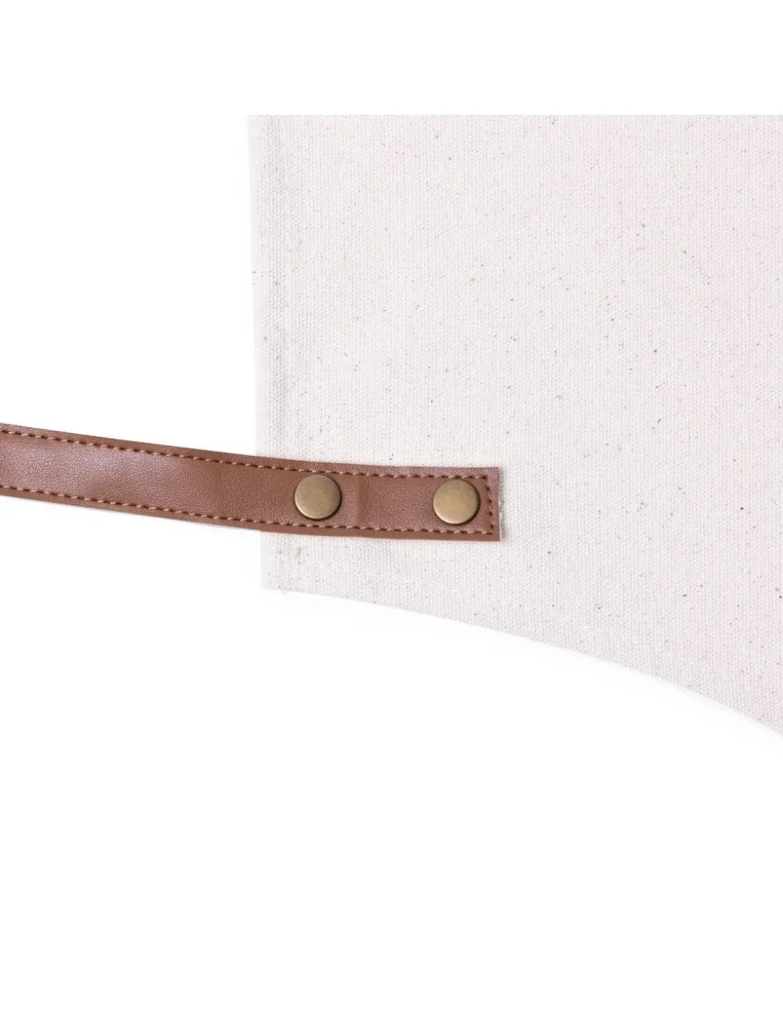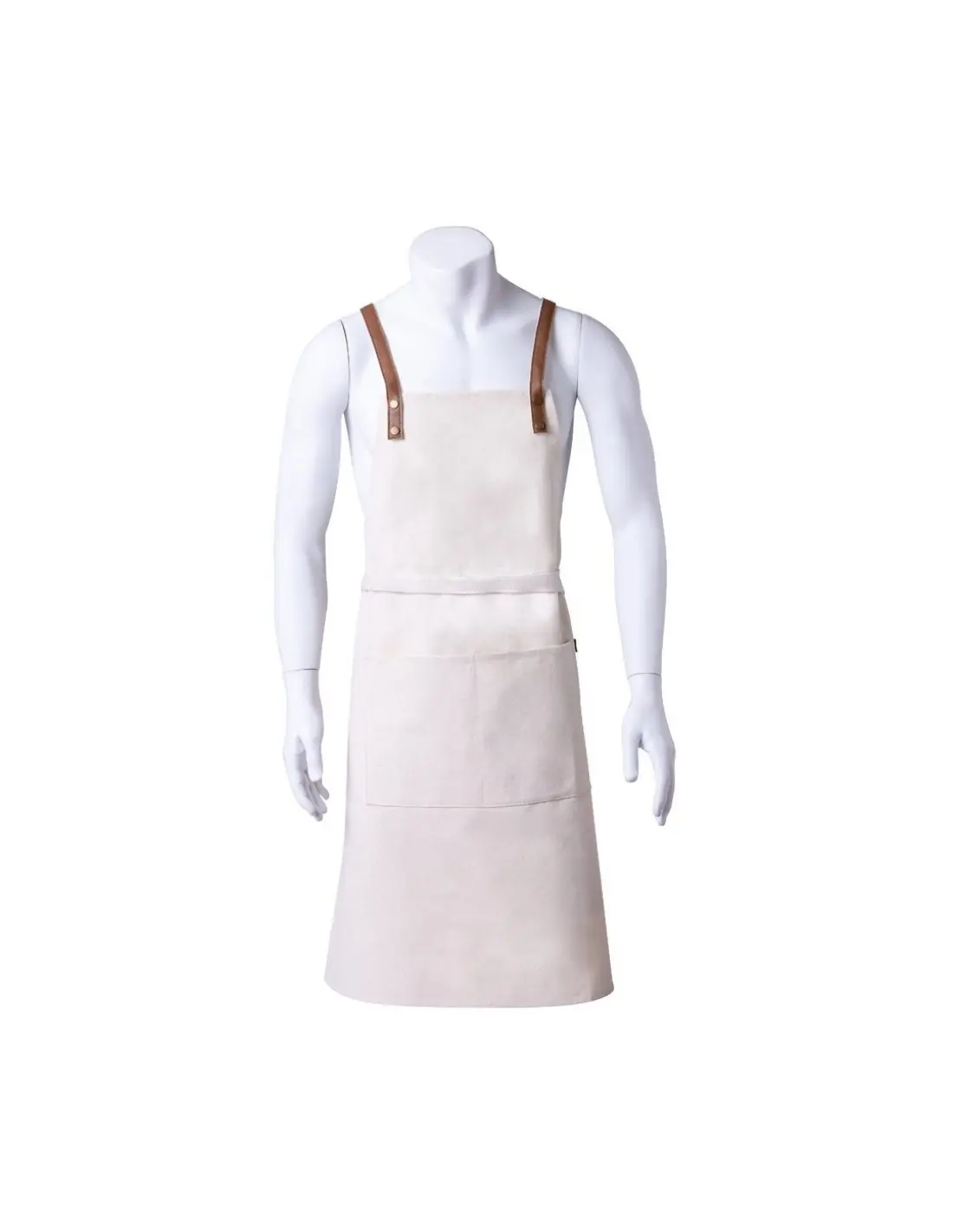 Delantal de alta calidad en resistente material 100% algodón canvas de 340g/m2, con costuras reforzadas. De corte por debajo de la rodilla, con cintas en resistente polipiel y triple ajuste: cuello, espalda y cintura. Con bolsillo frontal, accesorio en polipiel y remaches metálicos de refuerzo.