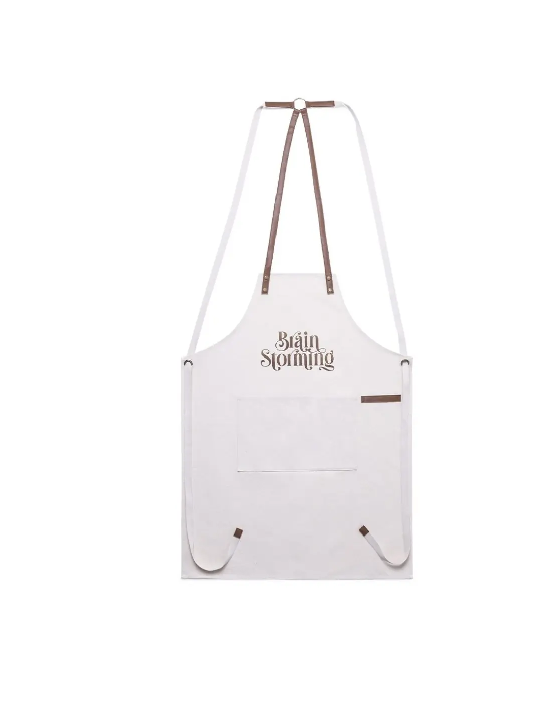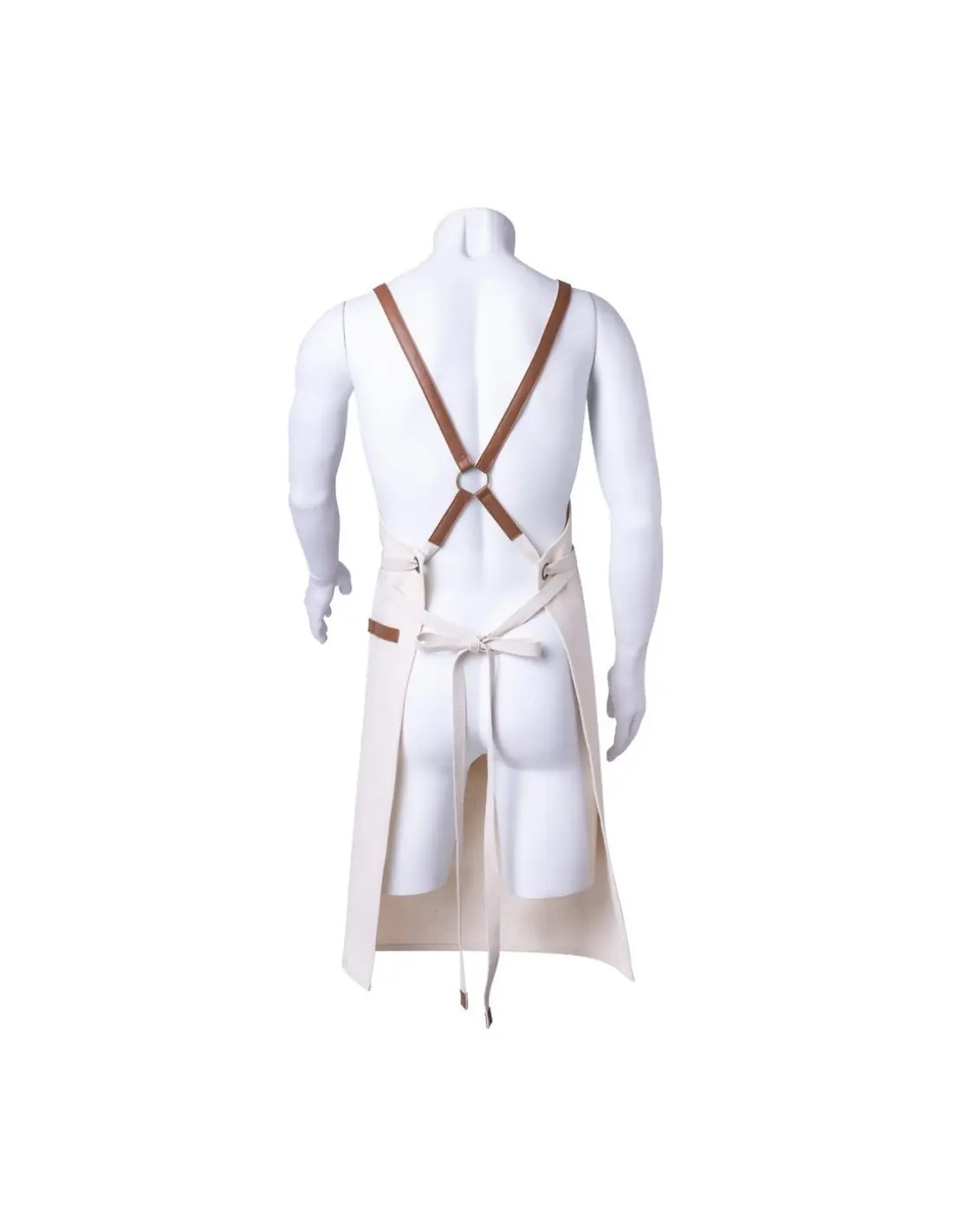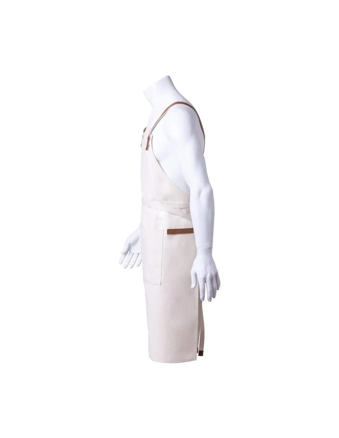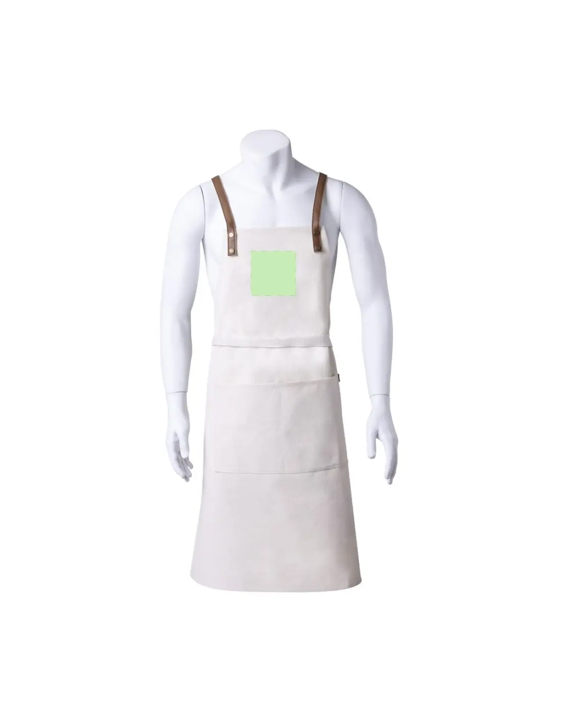 Delantal de alta calidad en resistente material 100% algodón canvas de 340g/m2, con costuras reforzadas. De corte por debajo de la rodilla, con cintas en resistente polipiel y triple ajuste: cuello, espalda y cintura. Con bolsillo frontal, accesorio en polipiel y remaches metálicos de refuerzo.