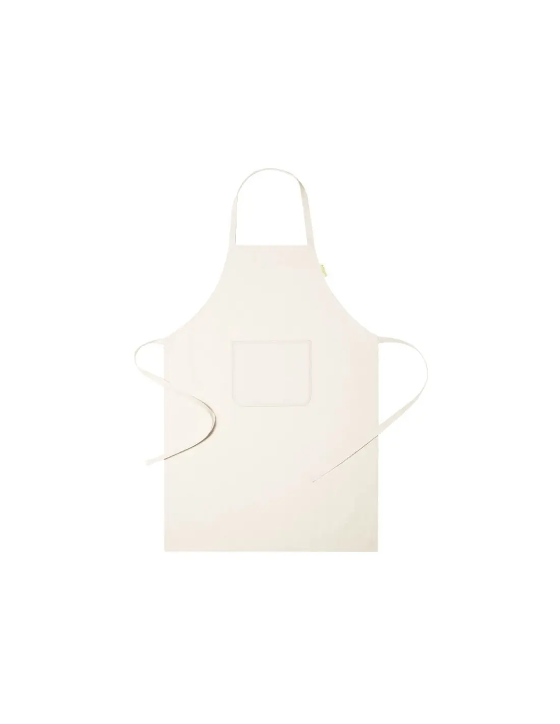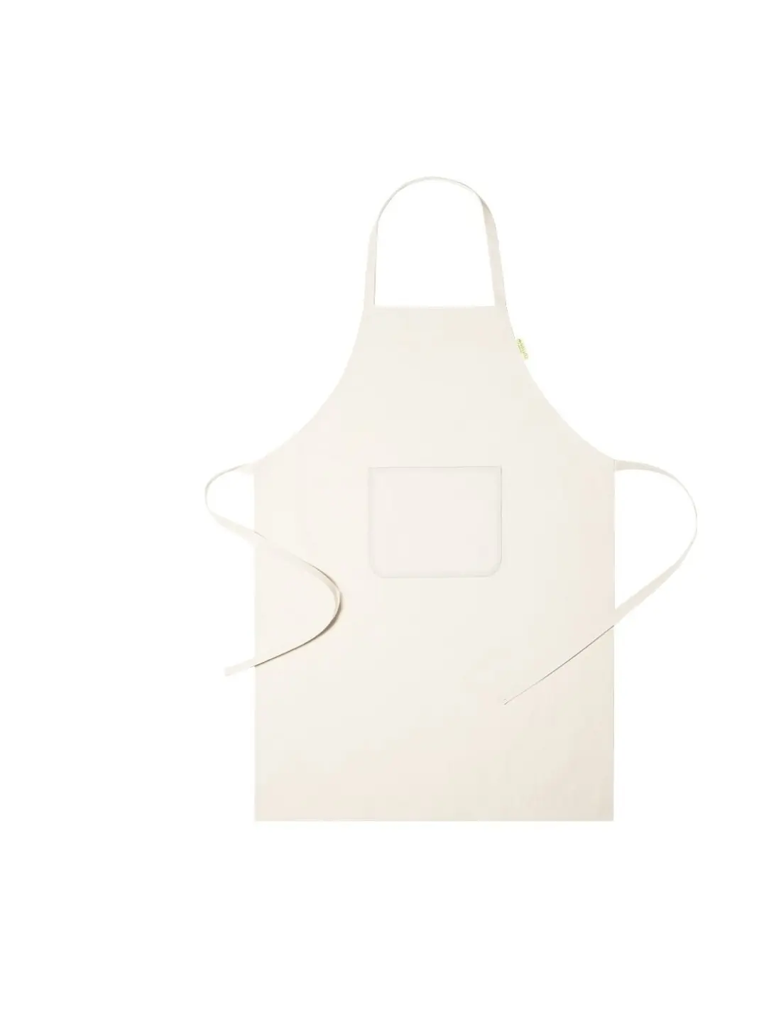 Delantal de línea nature, elaborado en material 100% algodón orgánico. Con bolsillo frontal y cintas de ajuste, de corte por debajo de la rodilla. Distintivo algodón orgánico en etiqueta.