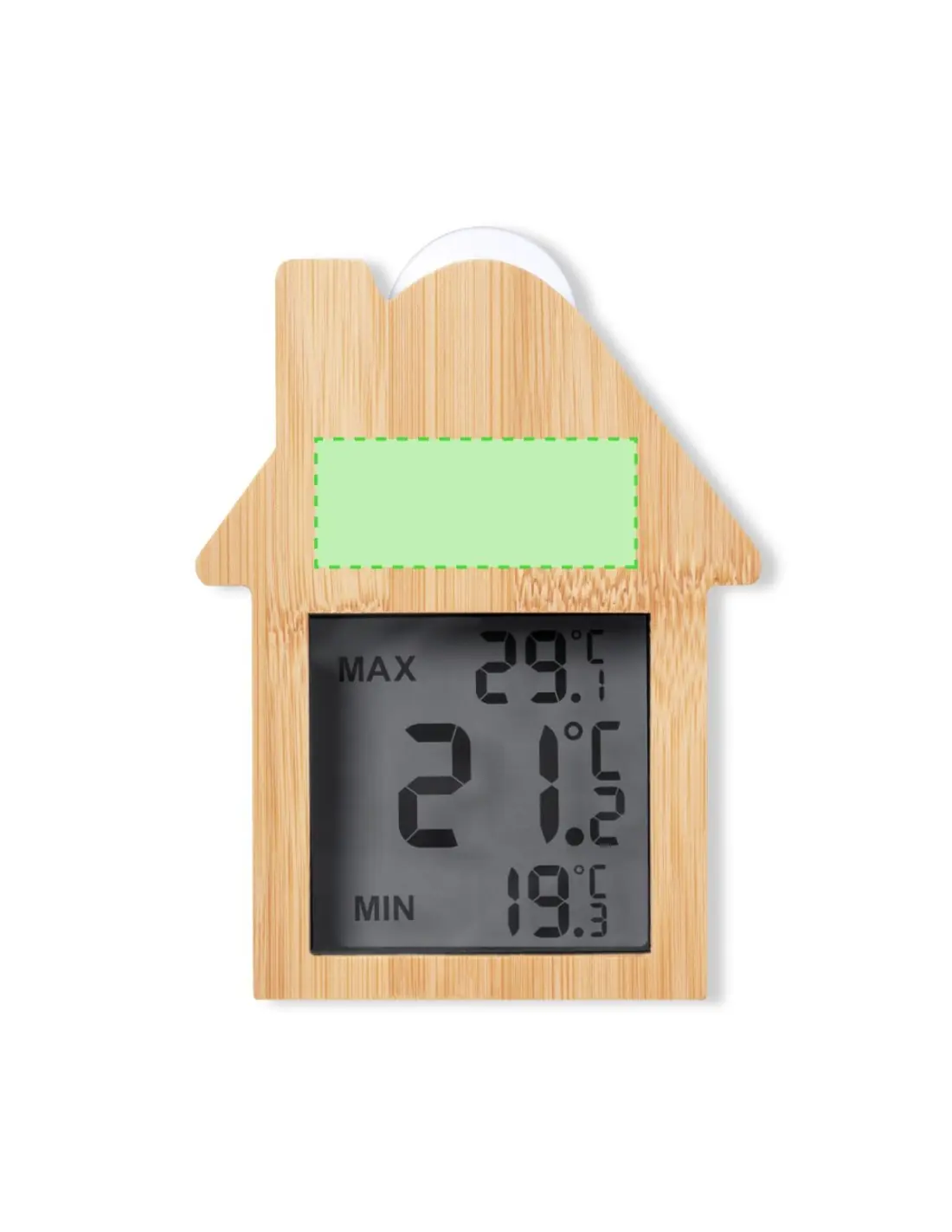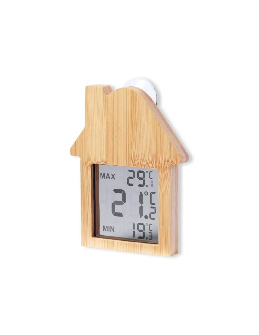 Estación meteorológica fabricada en bambú y con fijación por ventosa. Pantalla LCD de fácil lectura con termómetro, registro de temperaturas máximas/mínima, y reloj. Alimentación con pila (de botón incluida). Presentada en caja individual de diseño kraft, con manual de instrucciones en español e inglés.