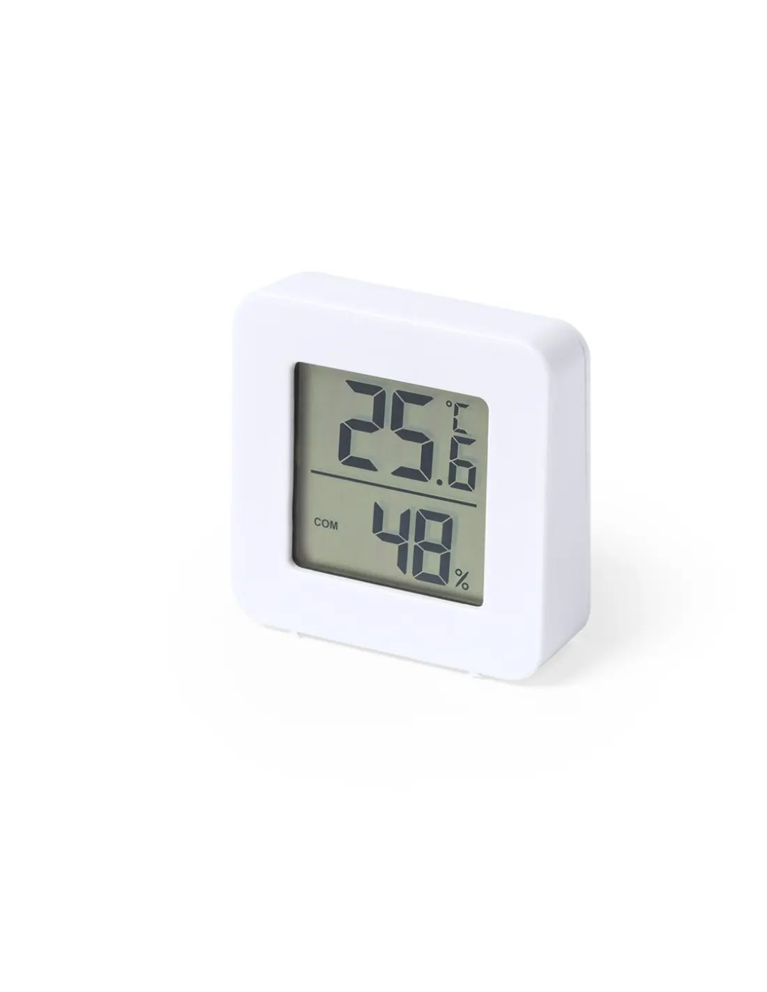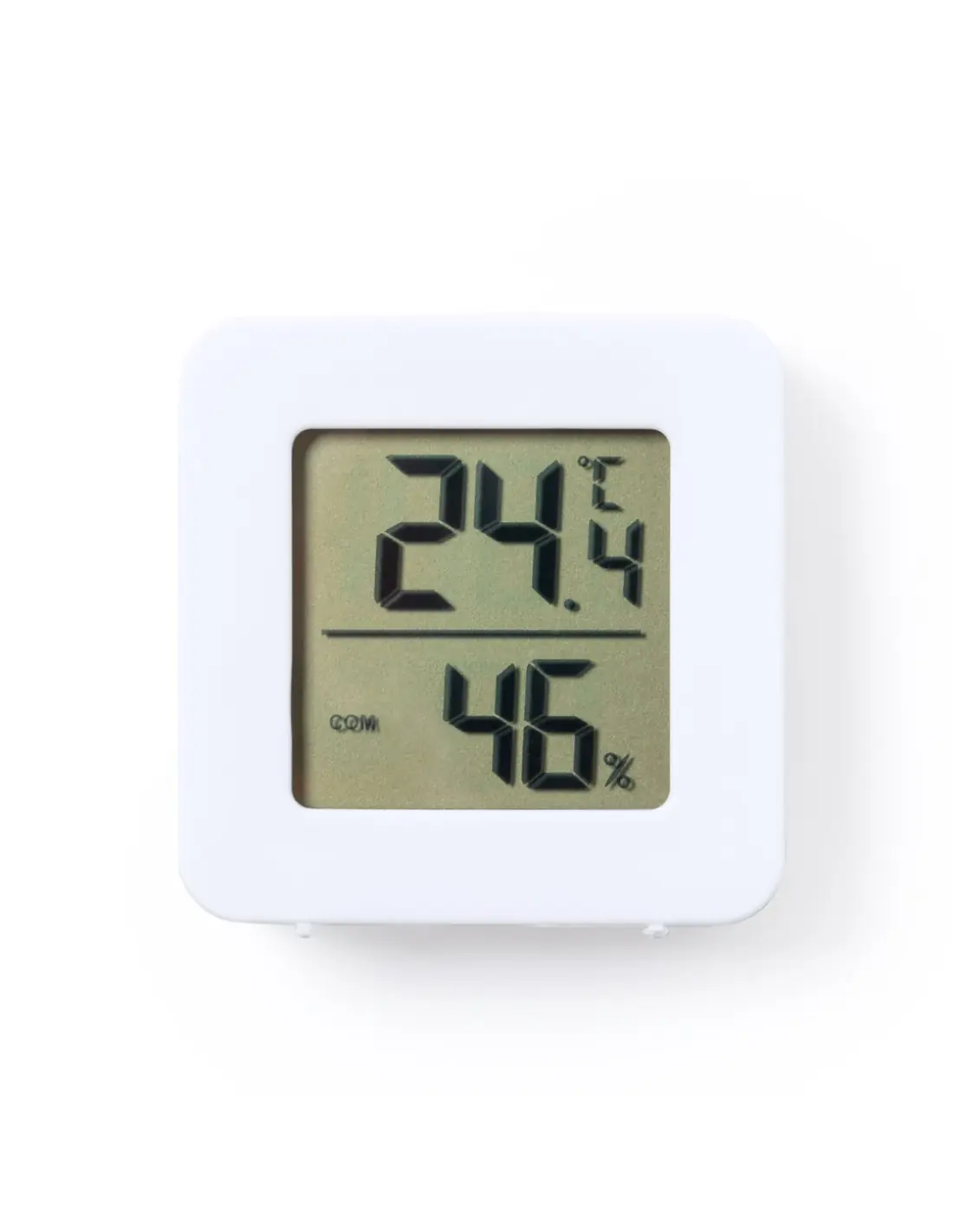 Estación meteorológica fabricada en resistente ABS de acabado blanco. Pantalla LCD de fácil lectura con termómetro y medidor de humedad. Fijación magnética y alimentación con pila (de botón incluida, con film protector). Presentada en caja individual de diseño kraft, con manual de instrucciones en español e inglés.