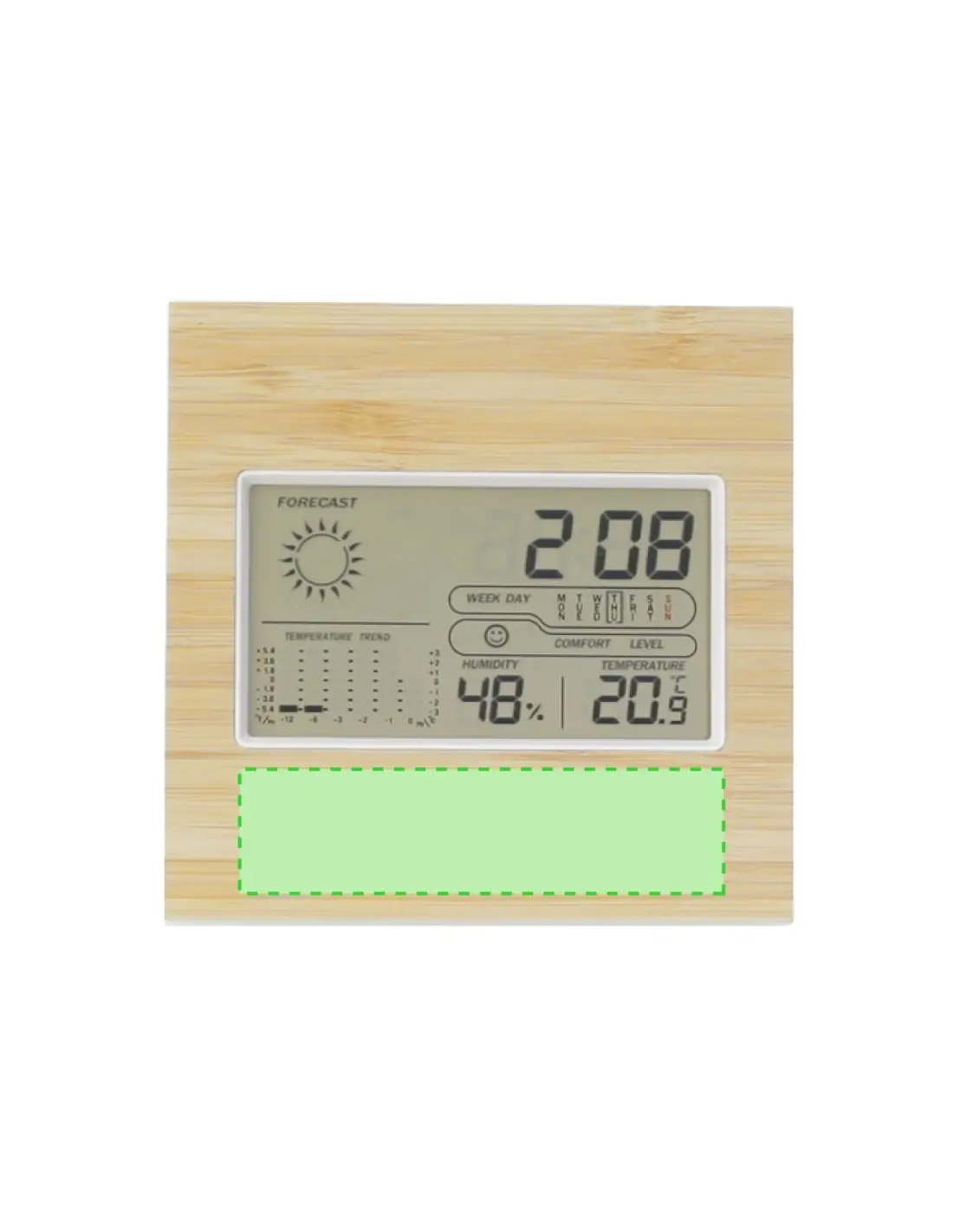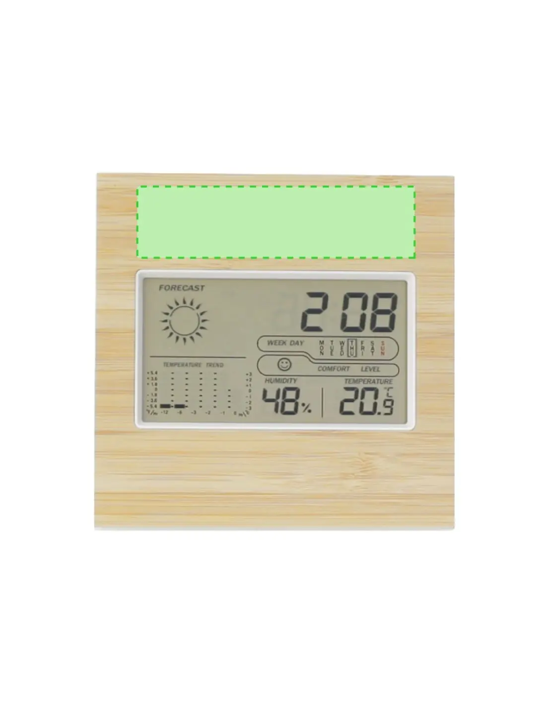Estación meteorológica de línea nature con frontal en bambú. Con sensor de temperatura y humedad. Función calendario y alarma. Soporte trasero...