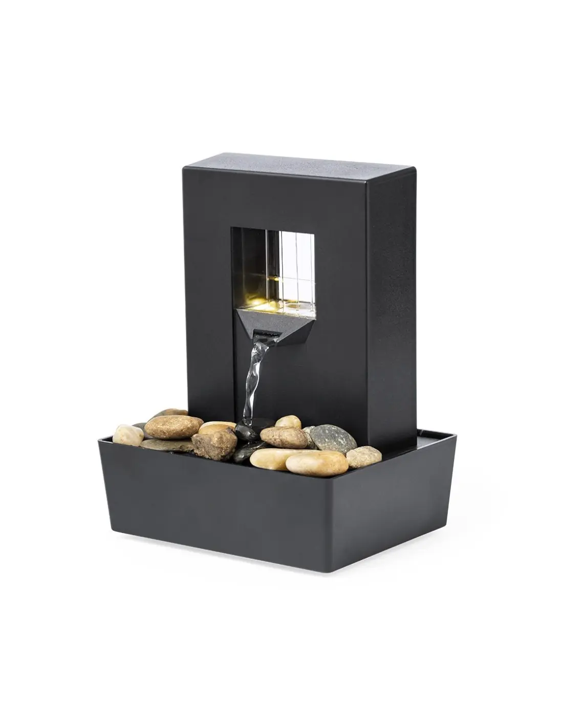 Fuente portátil de agua infinita con luces LED. Cascada de agua sobre piedras naturales, ideal para decoración o momentos de relajación. Incluye un depósito para el agua y una estructura iluminada por LEDs de tonos naturales, a través de la que fluye el agua. Alimentada por 3 pilas AA (no incluidas). Presentada en caja de diseño kraft.