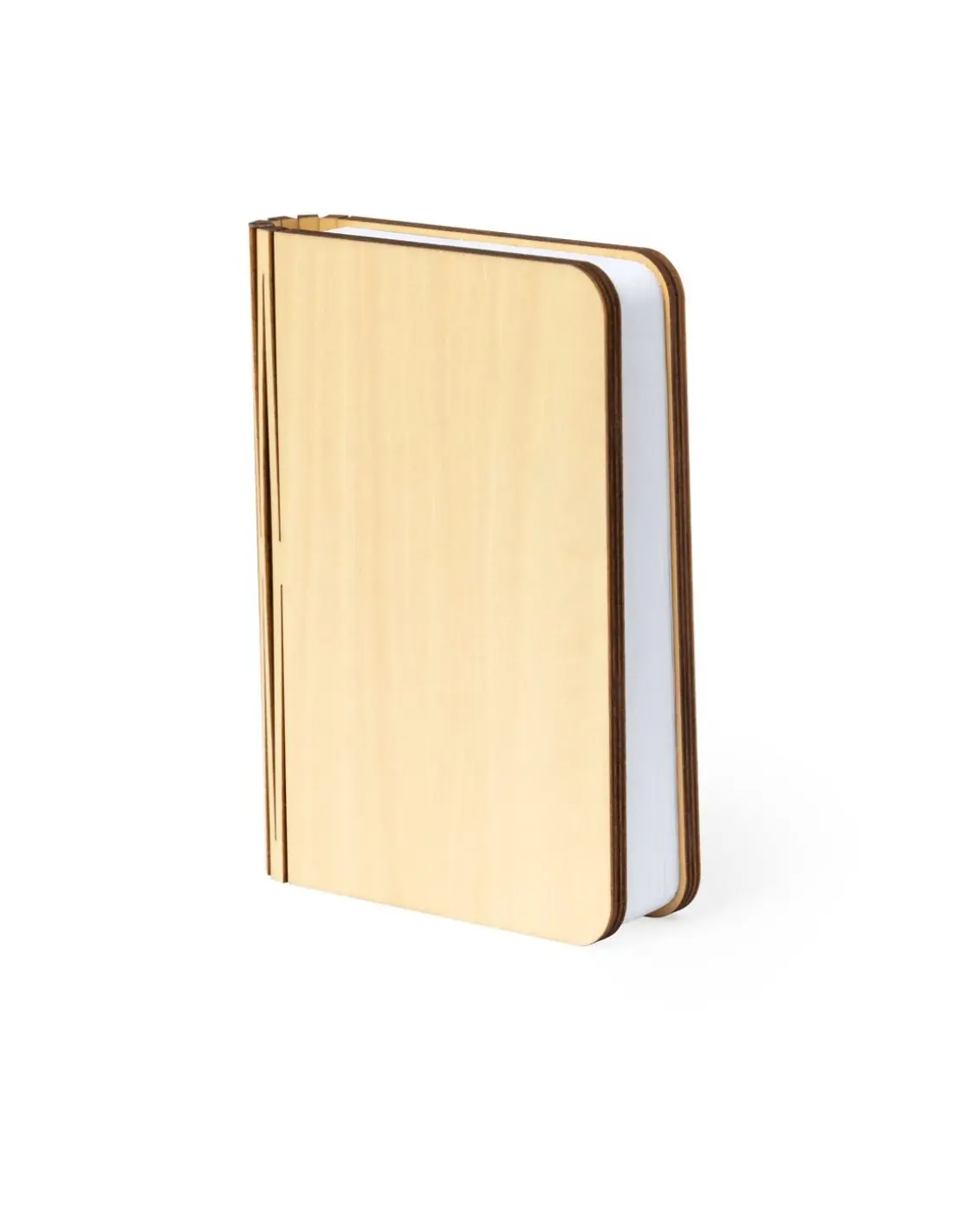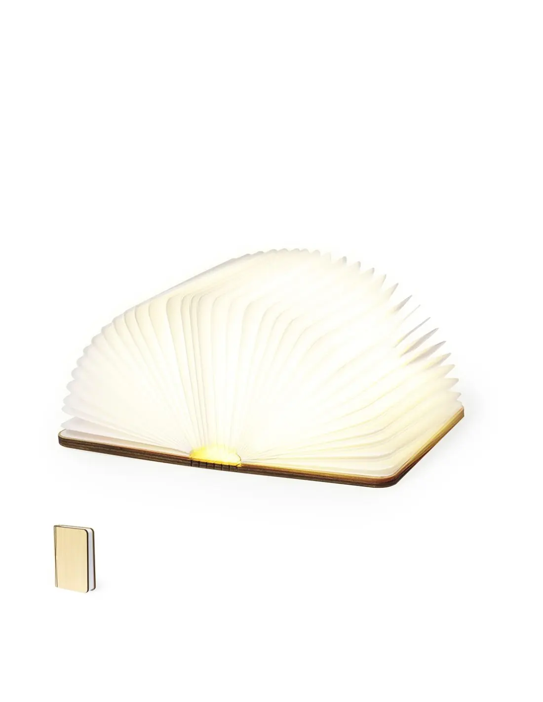 Original lámpara portátil LED con forma de libro. Fabricada en madera, cuenta con un interior que simula hojas de papel, iluminadas por 16 LEDs. Recargable mediante batería de 700mAh, con cable cargador USB incluido. Presentado en caja de diseño kraft.