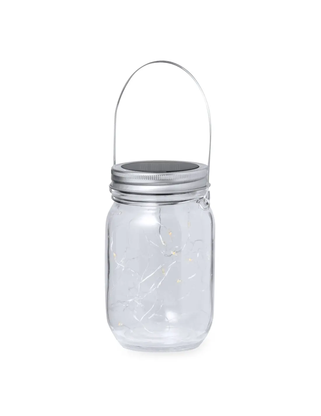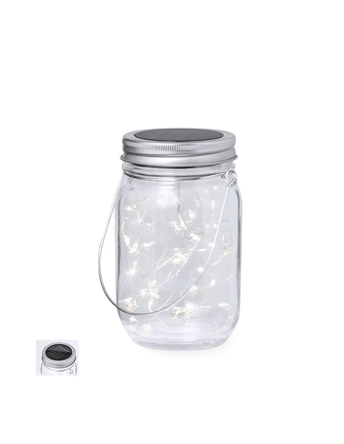 Original lámpara tarro solar, fabricada en resistente material cristal y con una tira interior decorativa de 20 LEDs. Incluye tapadera a rosca...