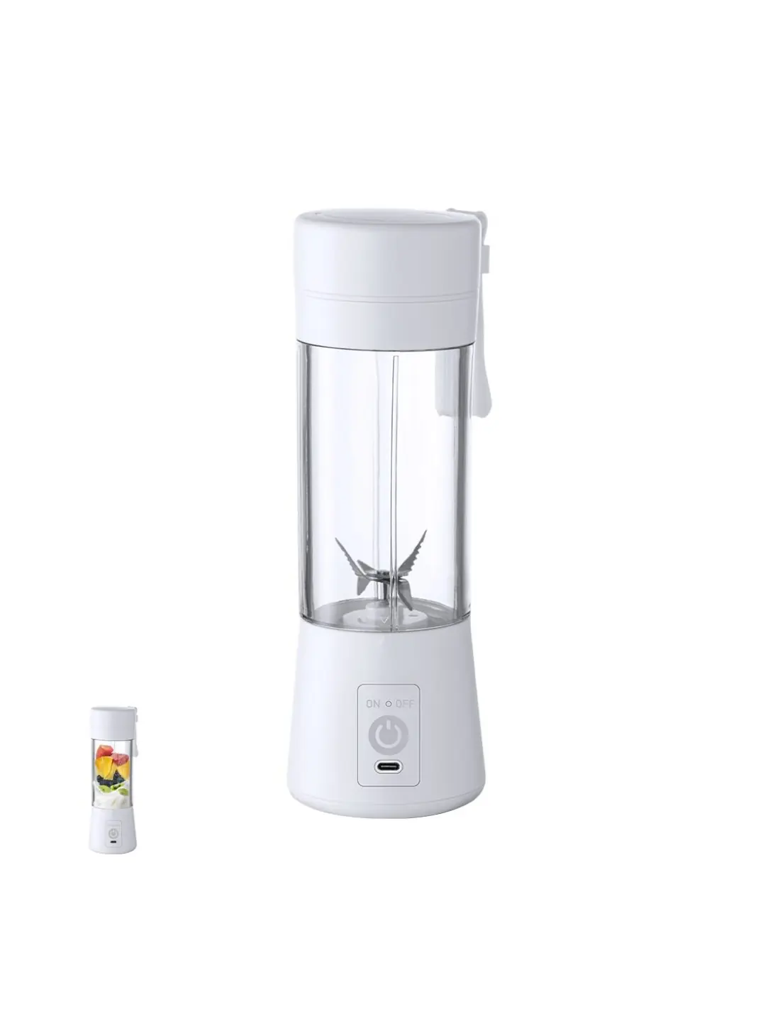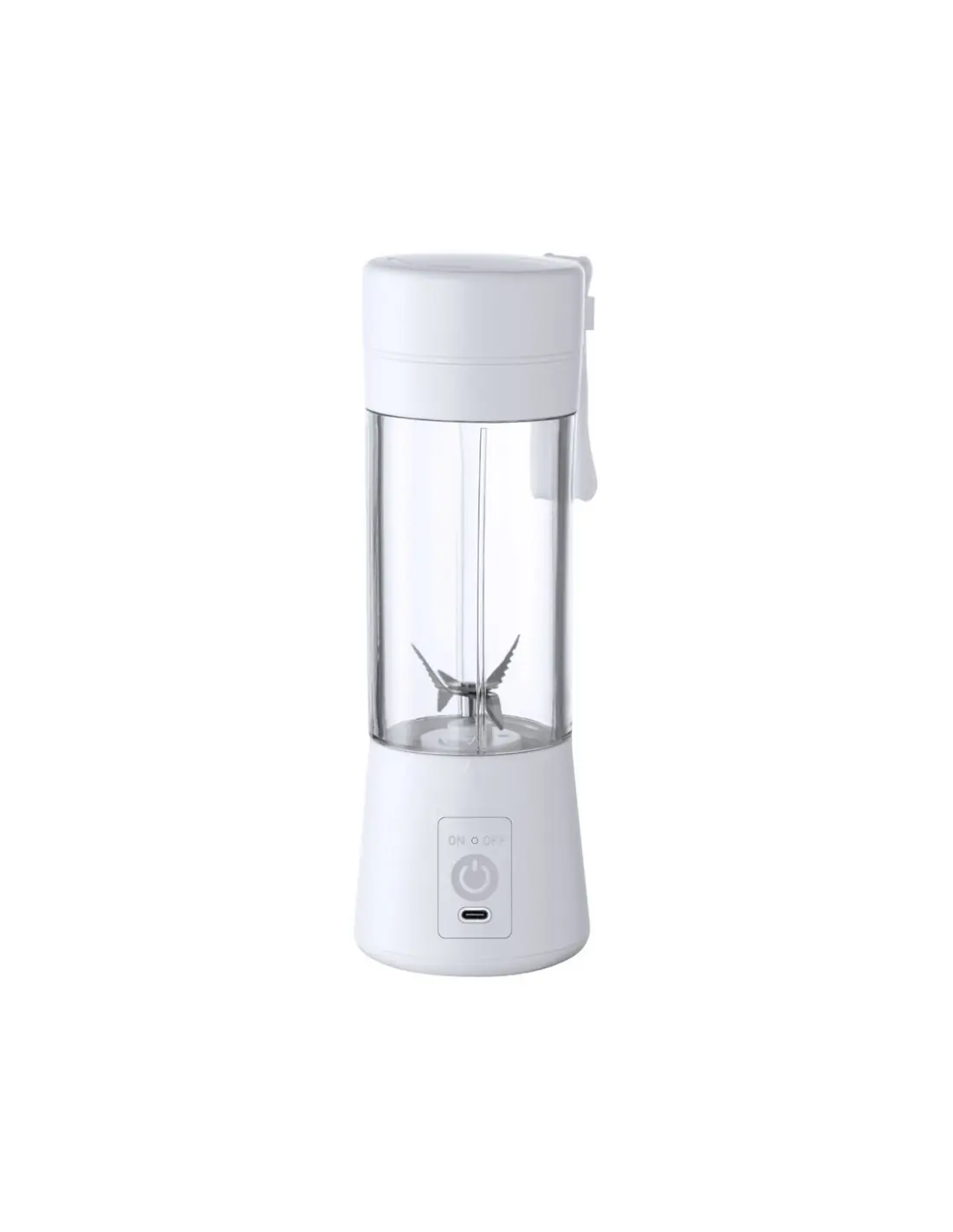 Licuadora fabricada en resistente material ABS de acabado blanco. De 380ml de capacidad y 150W de potencia, con limpiador y pinza incluidos. Batería de 2.000 mAh de capacidad, con conexión Tipo C (cable incluido). Presentada en caja individual de diseño kraft, con manual de instrucciones en español e inglés.