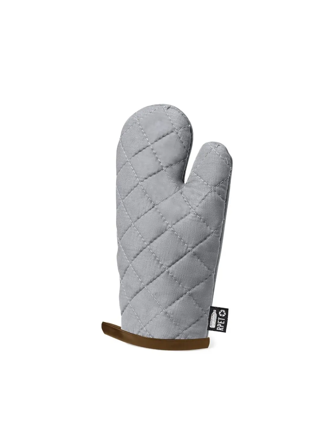 Manopla de cocina de línea nature. Fabricada en poliéster RPET, elaborado a partir de plástico reciclado, para así fomentar la reutilización de residuos plásticos y ayudar a la sostenibilidad del planeta. Con una cara lisa para impresión y cinta para colgar en contraste. Etiqueta exterior con distintivo RPET.