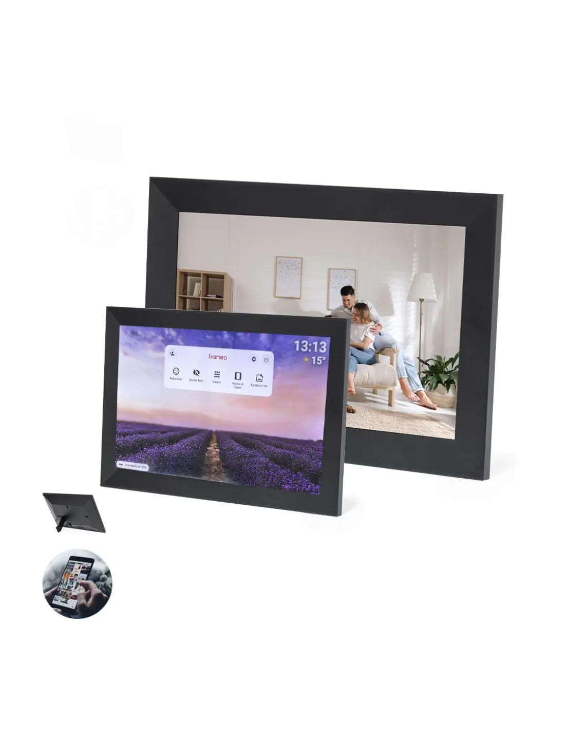 Marco de fotos digital de 10,1 pulgadas. Con pantalla táctil IPS de alta resolución de 1280x800 píxeles, conectividad WiFi, y equipado con funciones inteligentes como visualización del tiempo, alarma y reloj. Ademas incorpora un menú para explorar un mundo de posibilidades al ver videos, fotos y escuchar música, con opción de visualización en formato horizontal y vertical. Con soporte en la parte trasera y ranuras para colgar en la pared. Alimentación CA 220V-240V, con cargador incluido. Presentado en caja de diseño kraft y disponible manual de instrucciones en español e inglés.