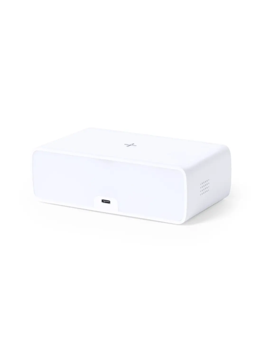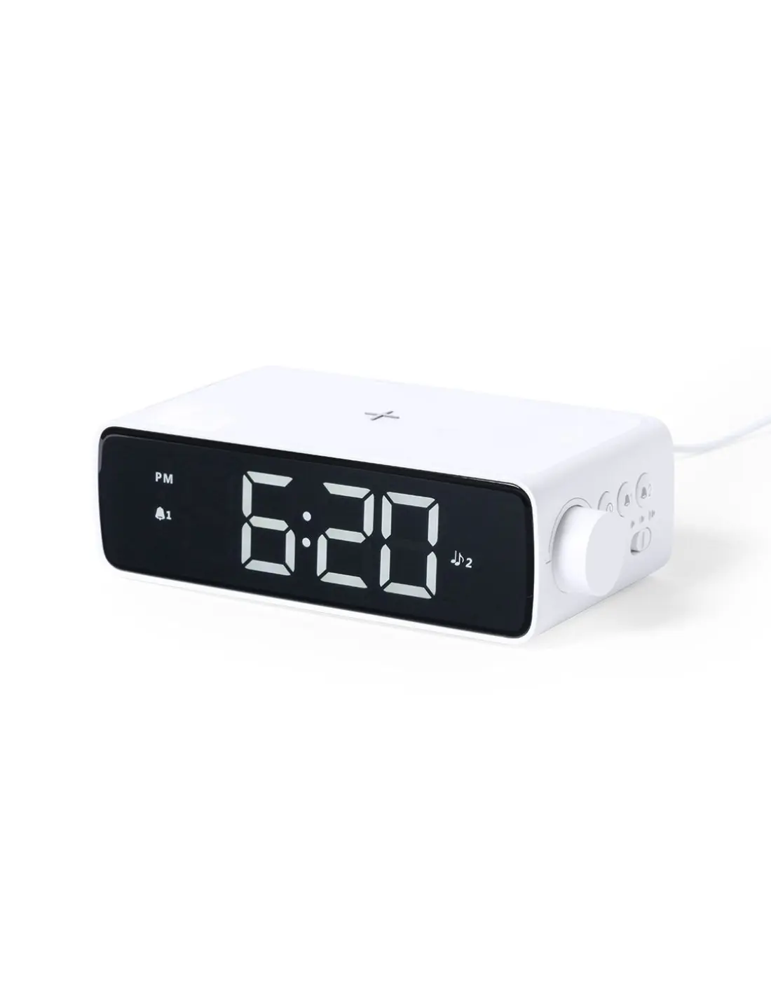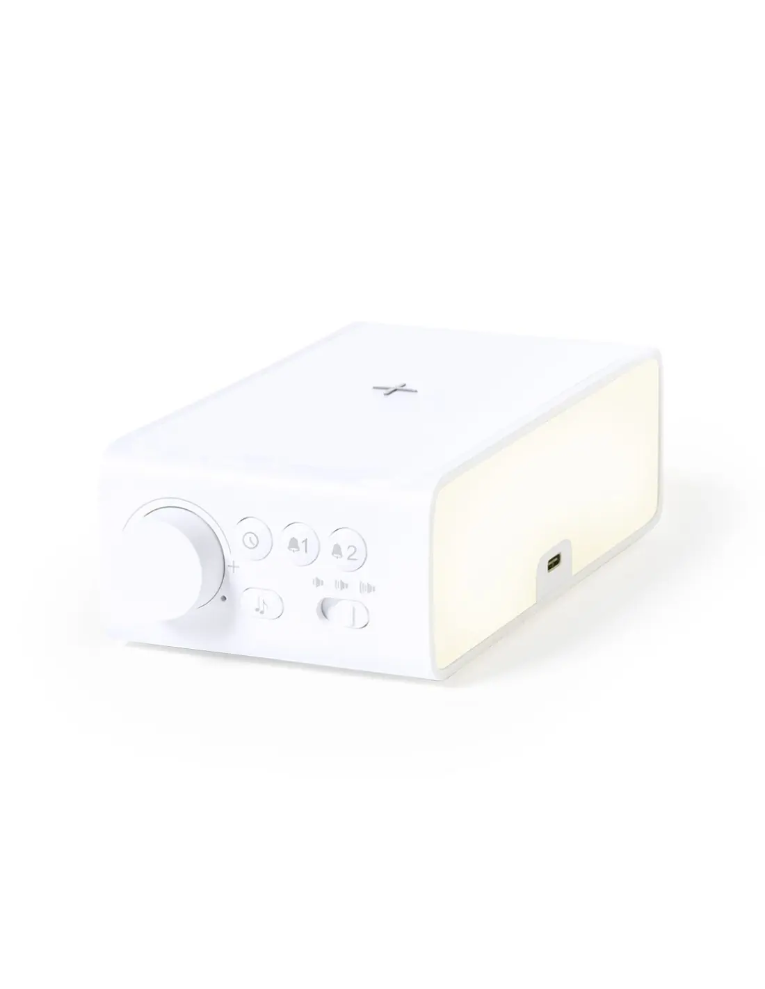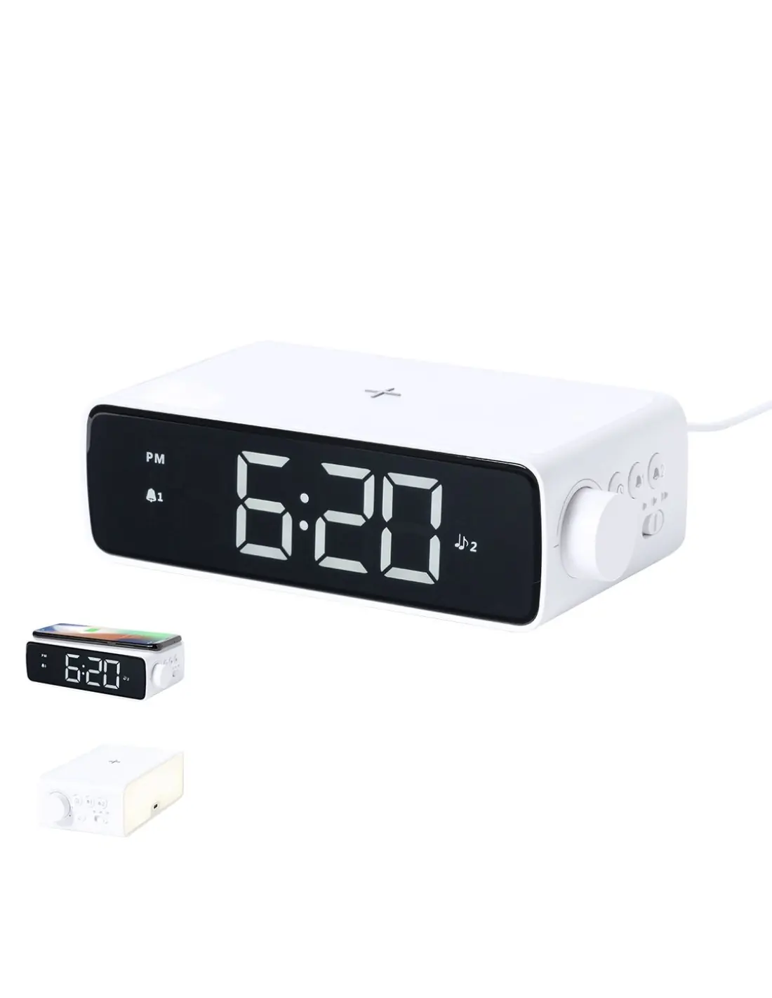 Reloj multifunción de elegante diseño en color blanco con cargador inalámbrico de 10W integrado y lámpara led integrada. Con función fecha/hora,...