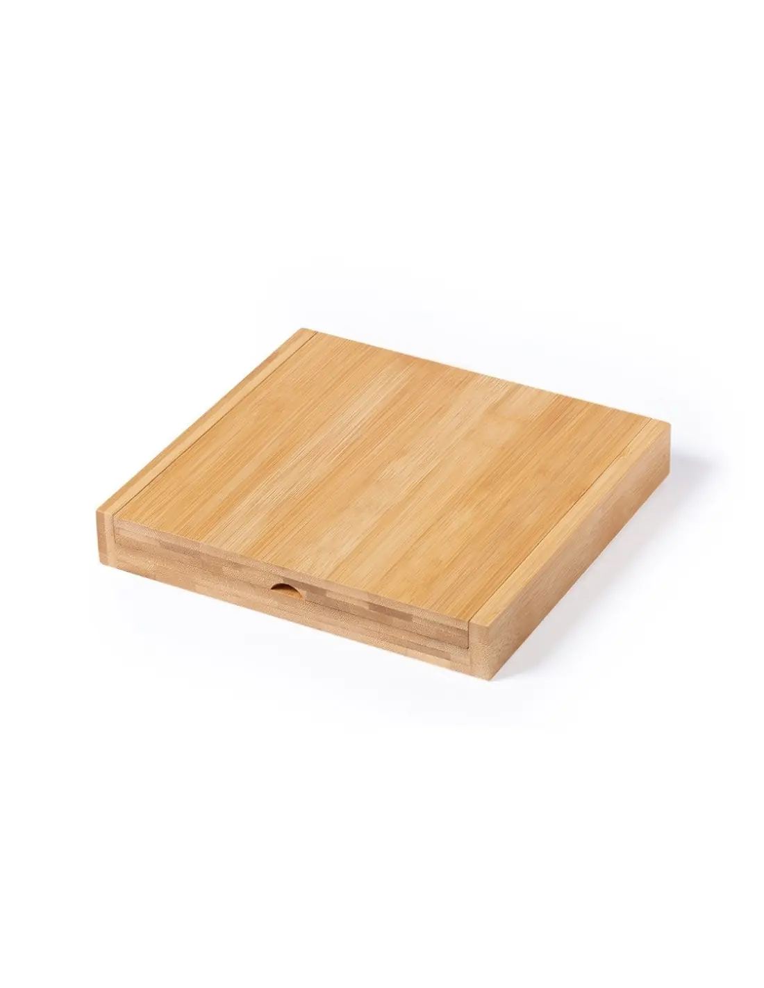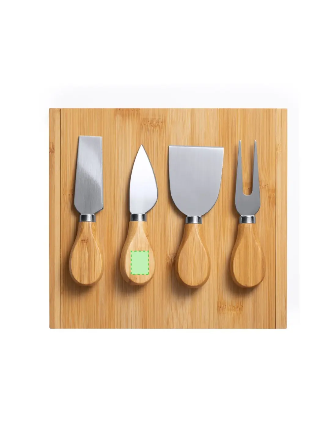 Original set de quesos en caja plegable con troquelado interior para cada accesorio y en formato rectangular. Accesorios en acero inox con mango en bambú. Presentado en caja individual de diseño kraft.