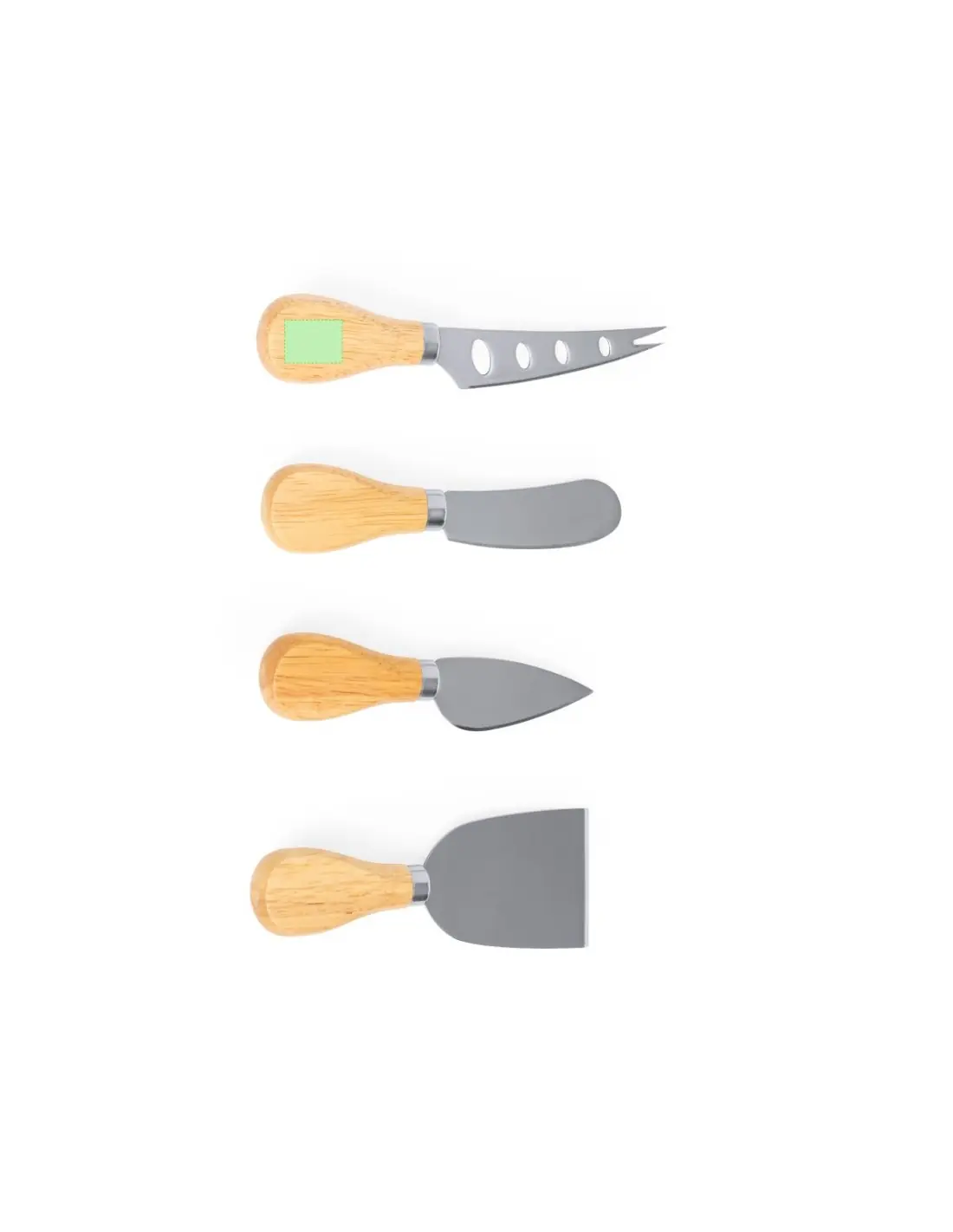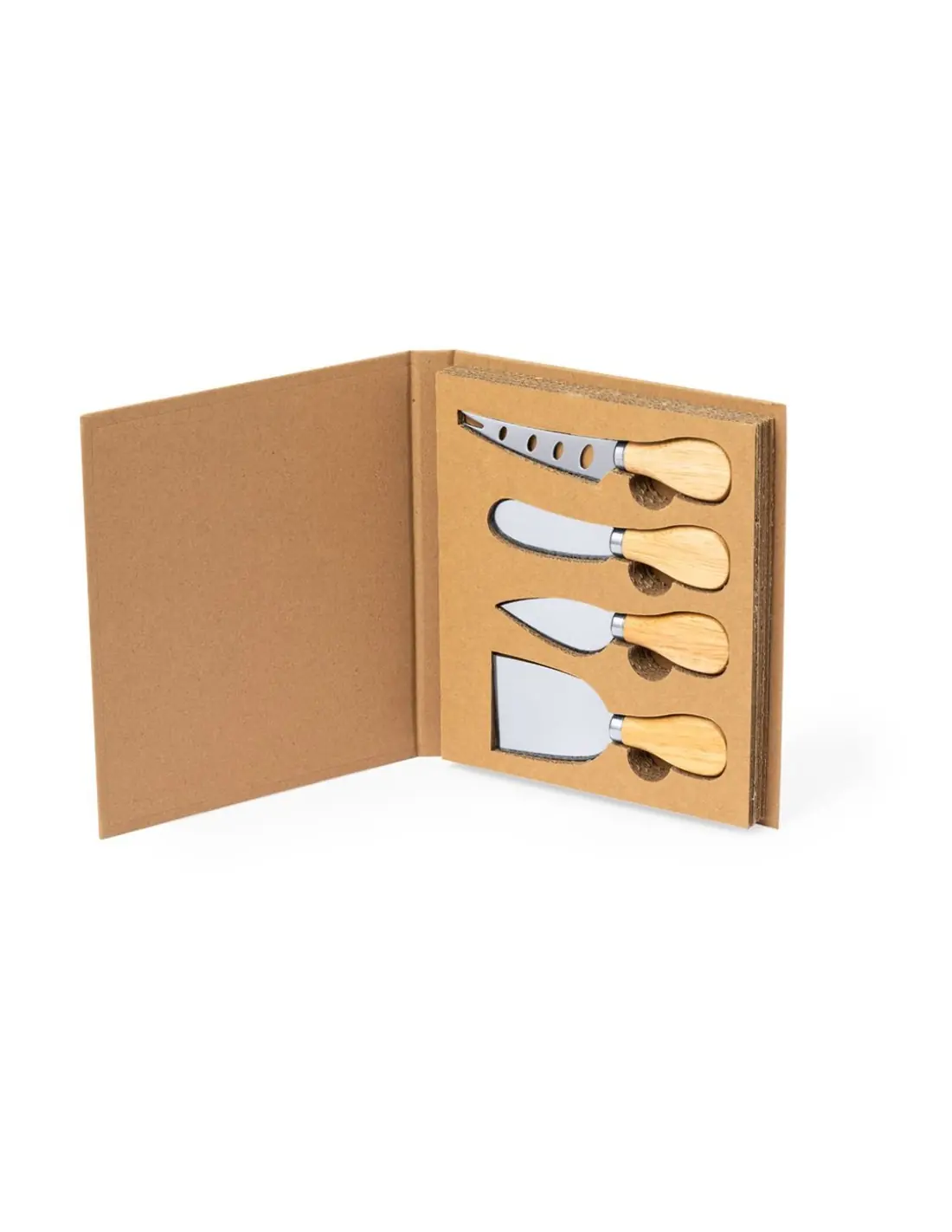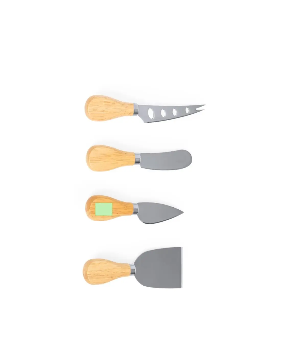 Set de quesos fabricado en madera. Utensilios fabricados en acero inox y mango de madera, con cuatro modelos diferentes: para quesos duros, quesos blandos, quesos semiduros y quesos en trozos. Presentados en original estuche de cartón reciclado, con interior troquelado para cada accesorio.