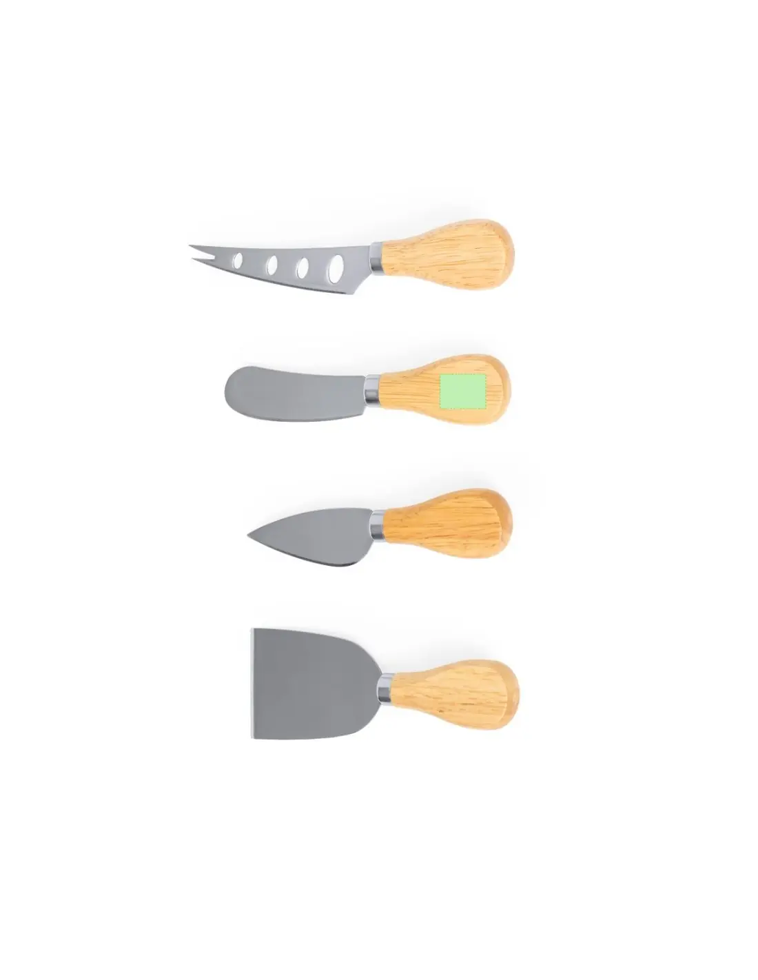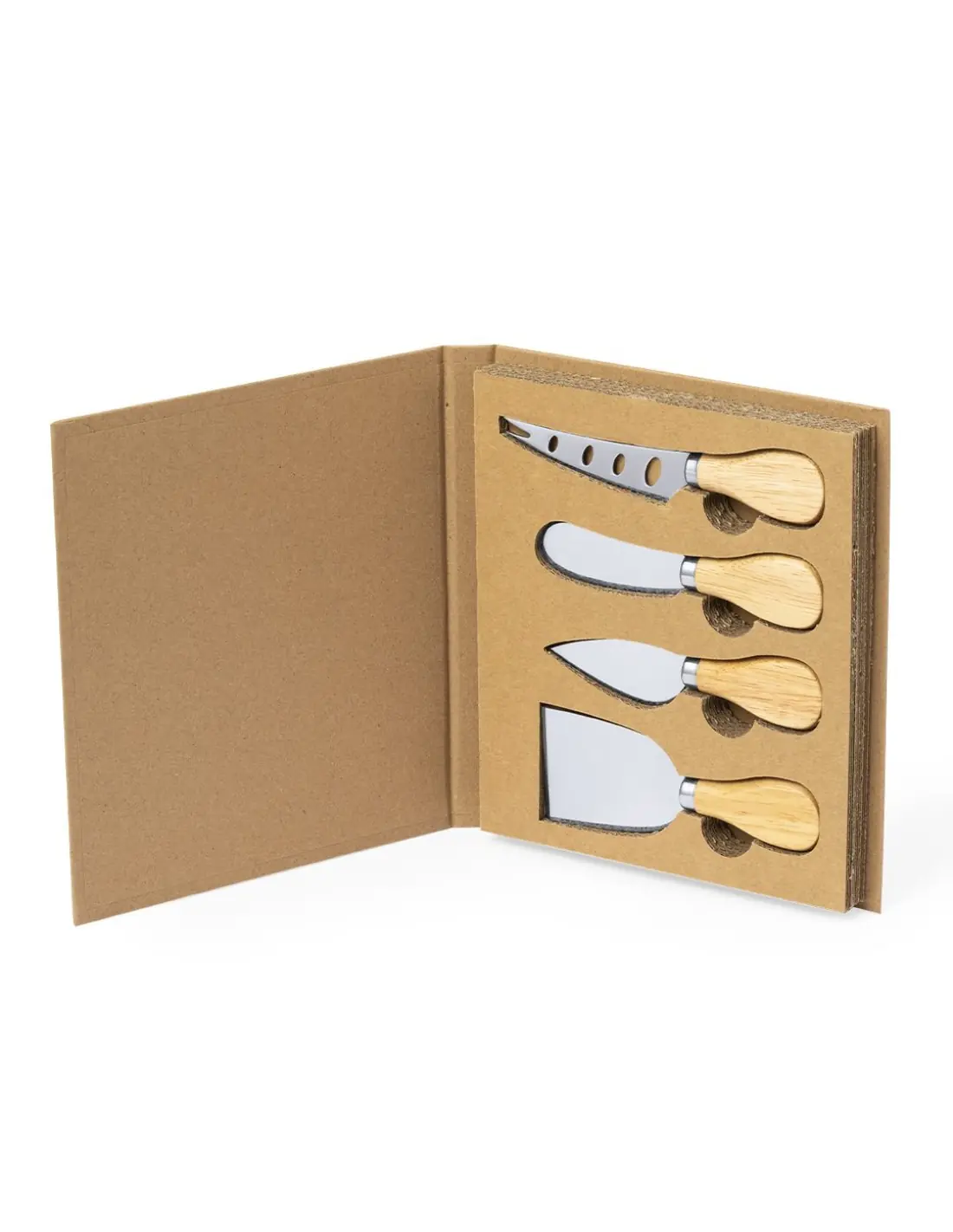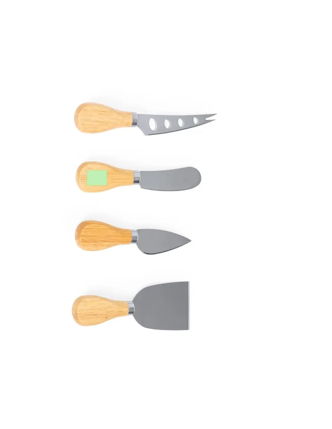 Set de quesos fabricado en madera. Utensilios fabricados en acero inox y mango de madera, con cuatro modelos diferentes: para quesos duros, quesos blandos, quesos semiduros y quesos en trozos. Presentados en original estuche de cartón reciclado, con interior troquelado para cada accesorio.