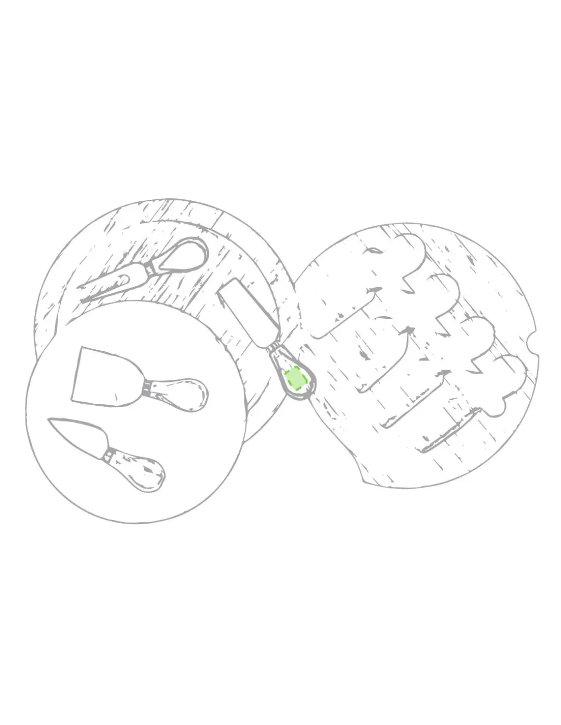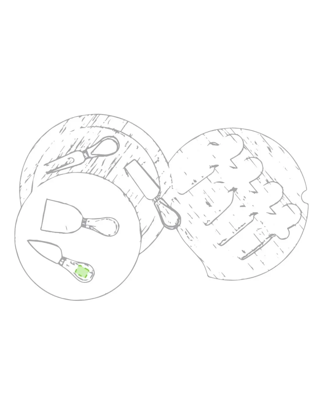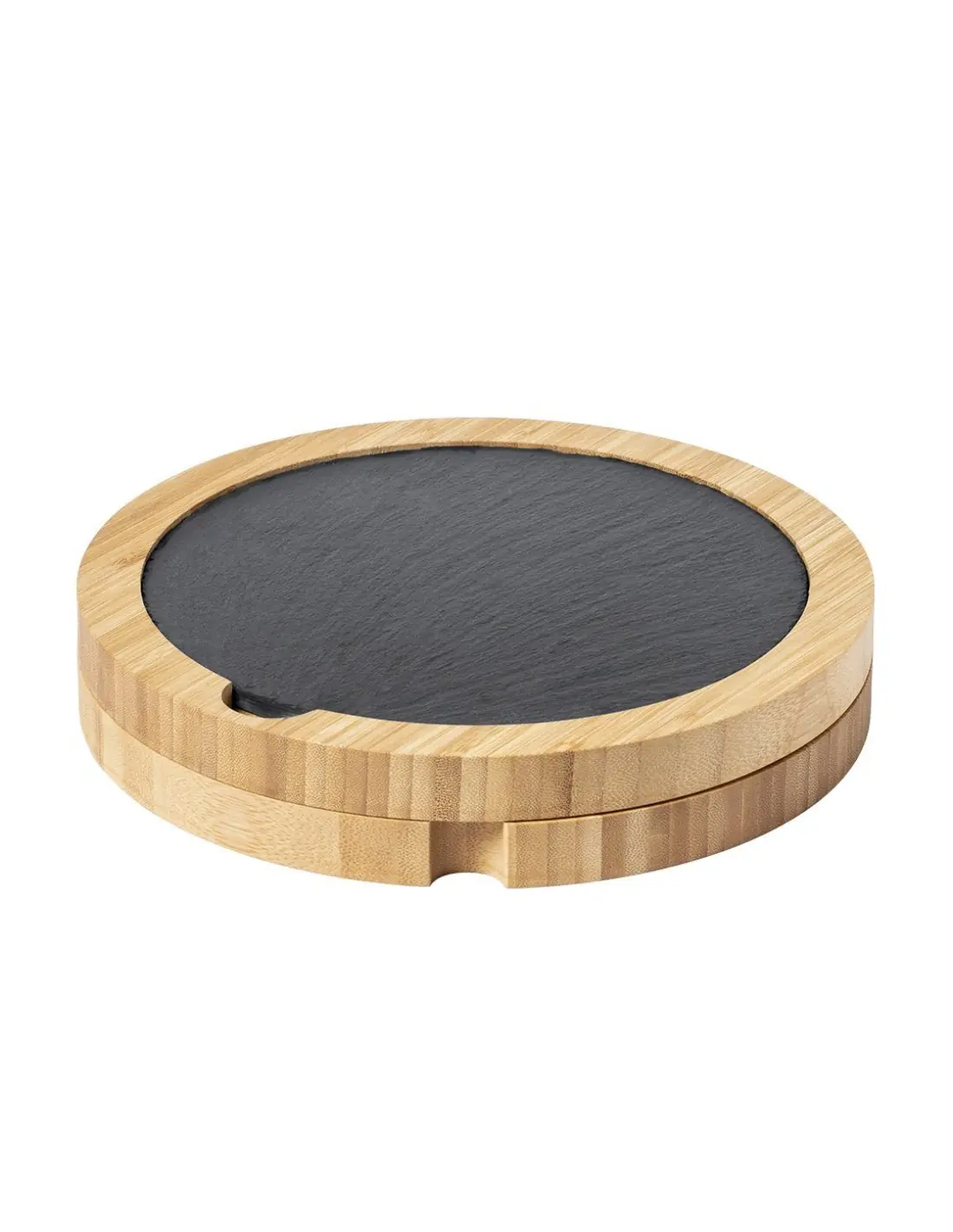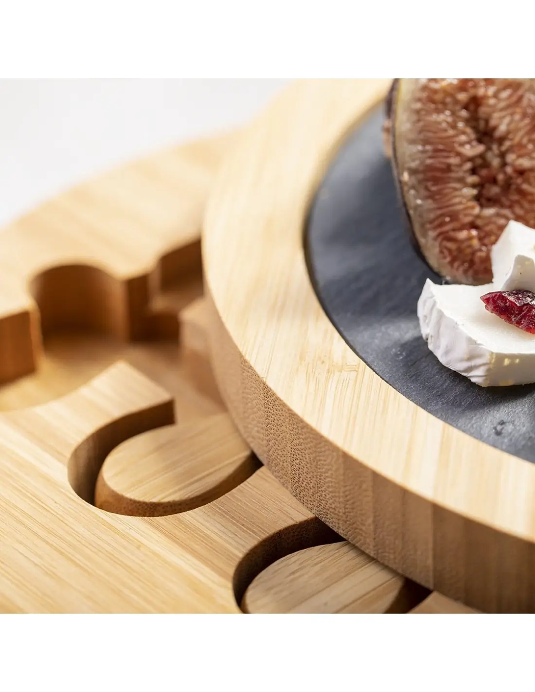 Completo set de quesos de 4 piezas. Con tabla de corte y presentación fabricada en pizarra y utensilios en acero inox y mango de bambú. Tabla de pizarra extraíble para fácil limpieza. Presentado en estuche individual troquelado de bambú y atractiva caja individual de diseño eco.