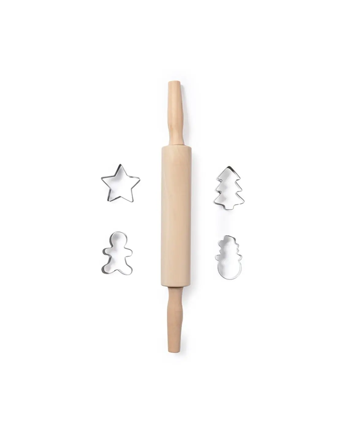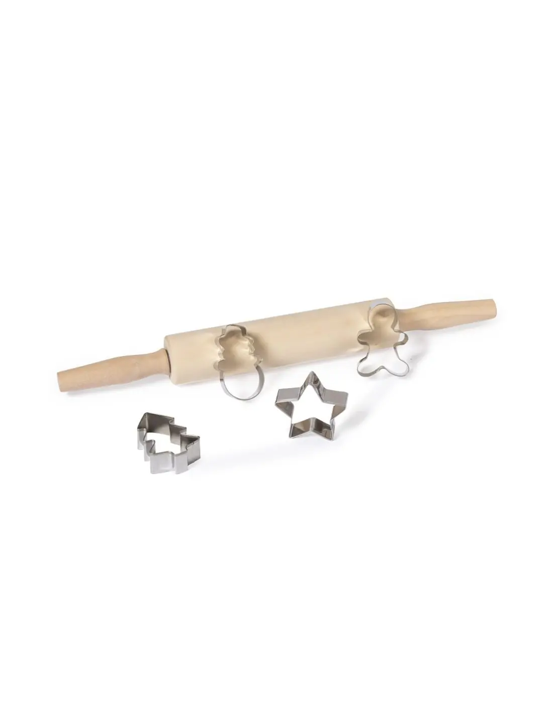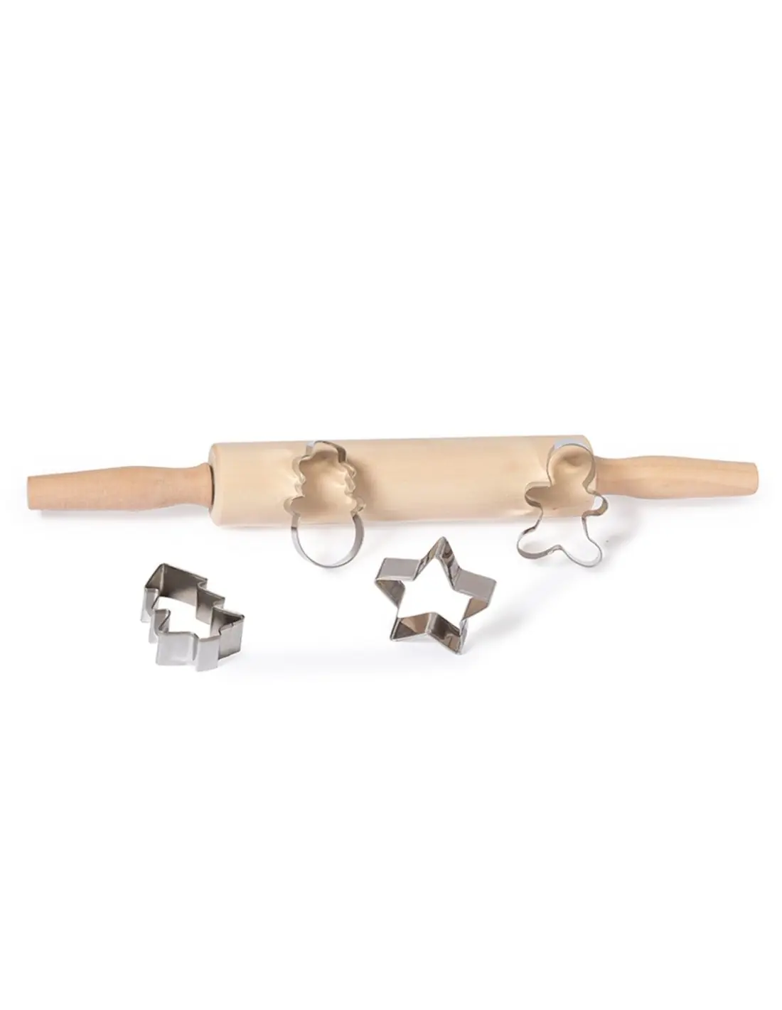 Set de repostería con moldes navideños en acero inoxidable y rodillo fabricado en resistente madera natural. Incluye rodillo amasador y 4 moldes en forma de Árbol de Navidad, Estrella, Muñeco de Nieve y Hombre Jenjibre. Presentado en caja kraft.