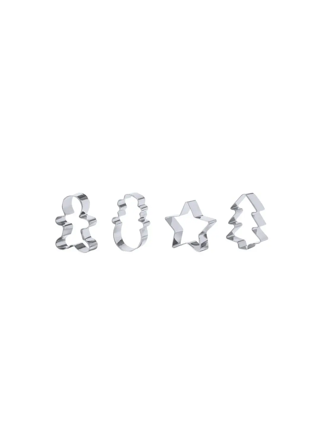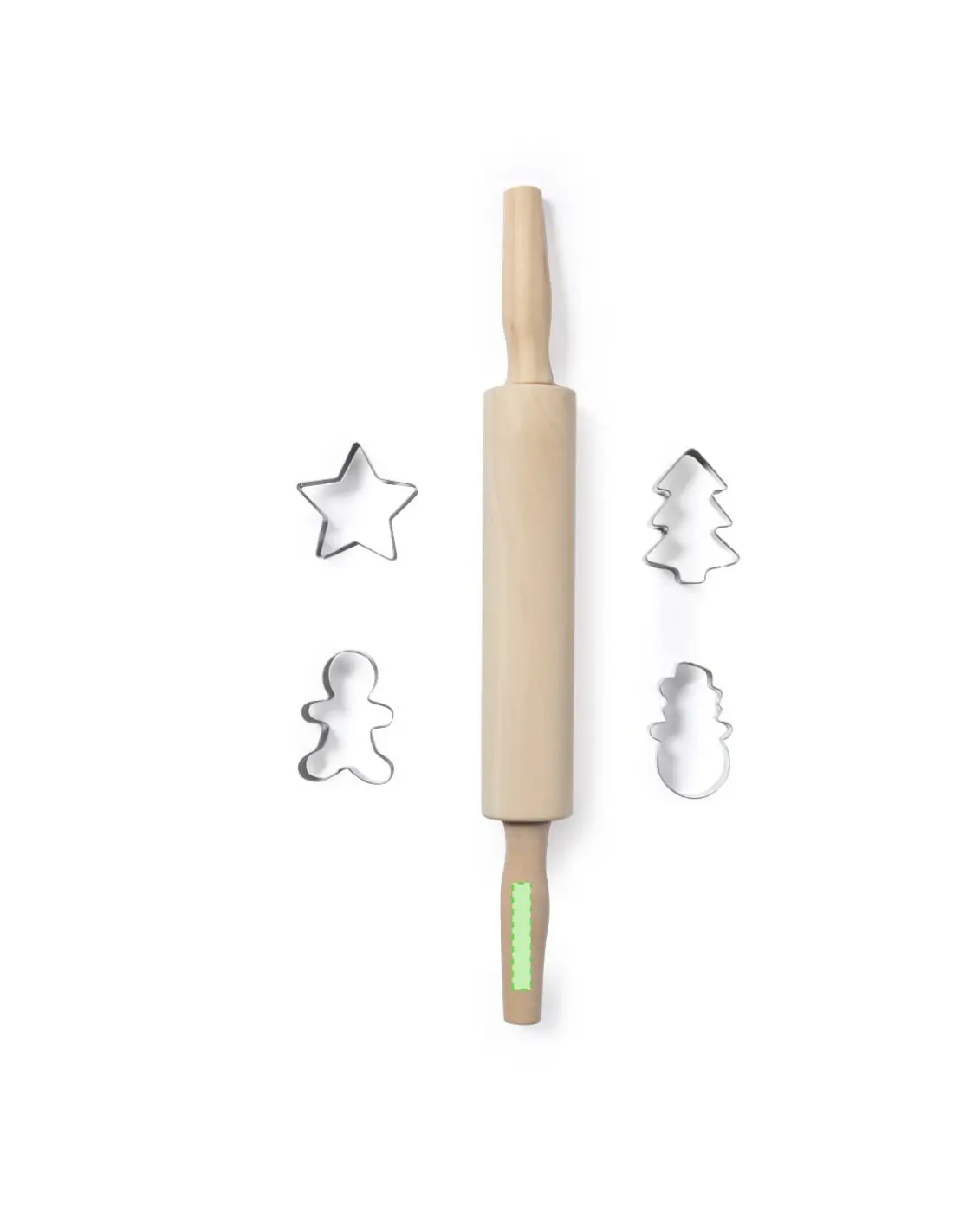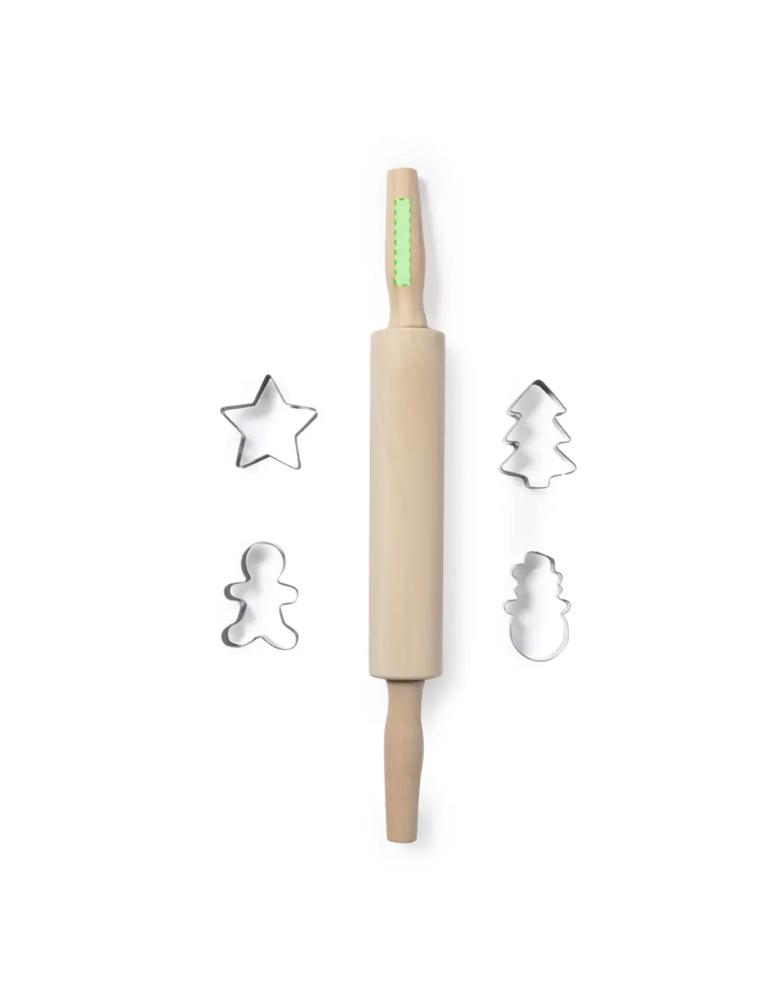 Set de repostería con moldes navideños en acero inoxidable y rodillo fabricado en resistente madera natural. Incluye rodillo amasador y 4 moldes en forma de Árbol de Navidad, Estrella, Muñeco de Nieve y Hombre Jenjibre. Presentado en caja kraft.