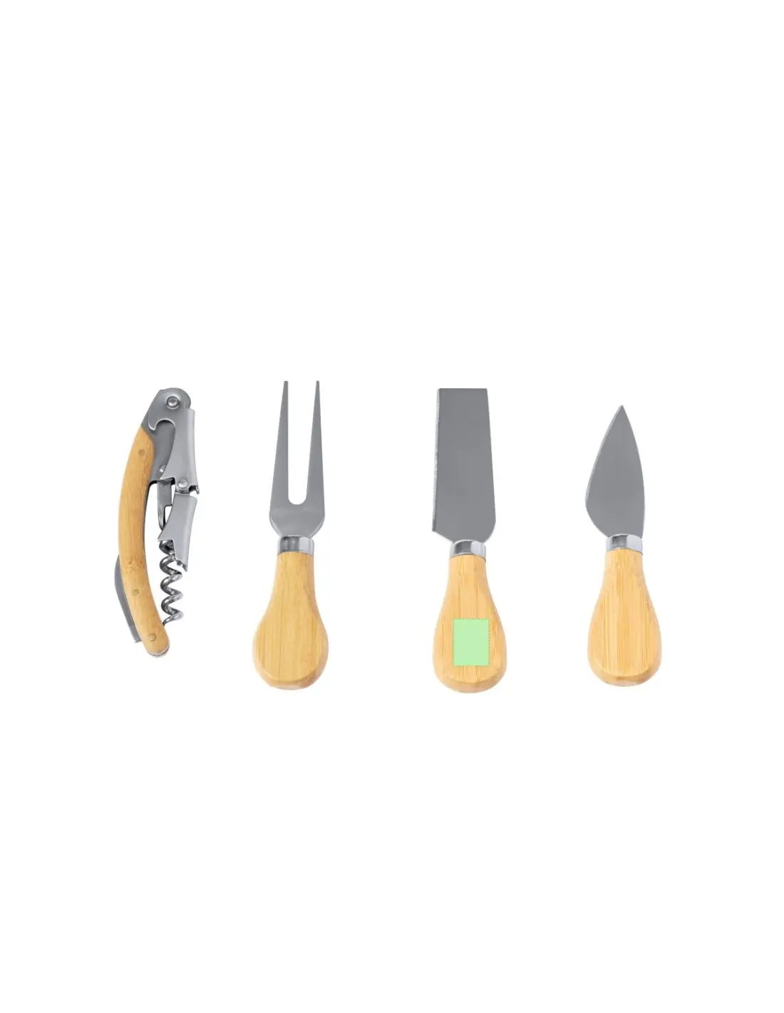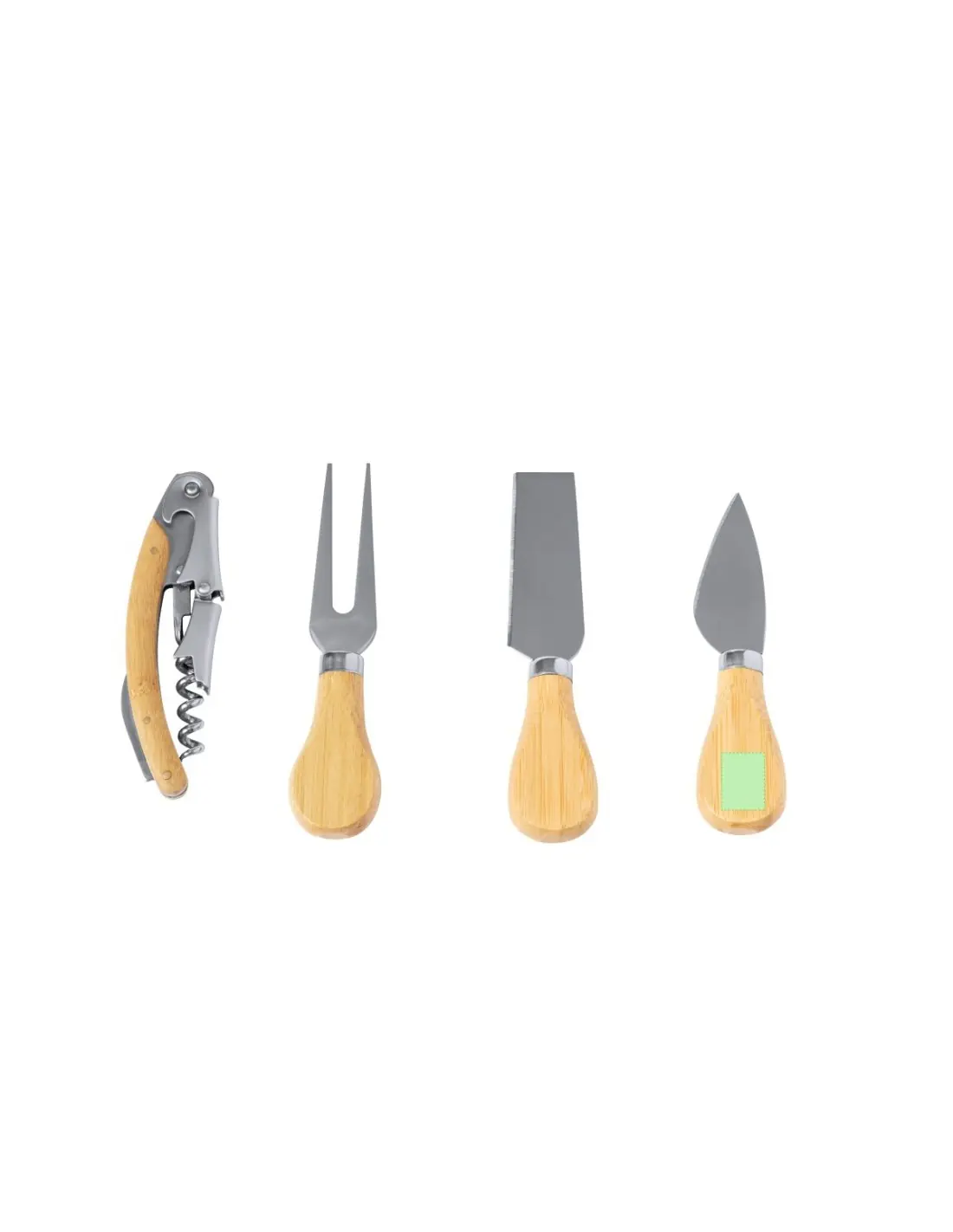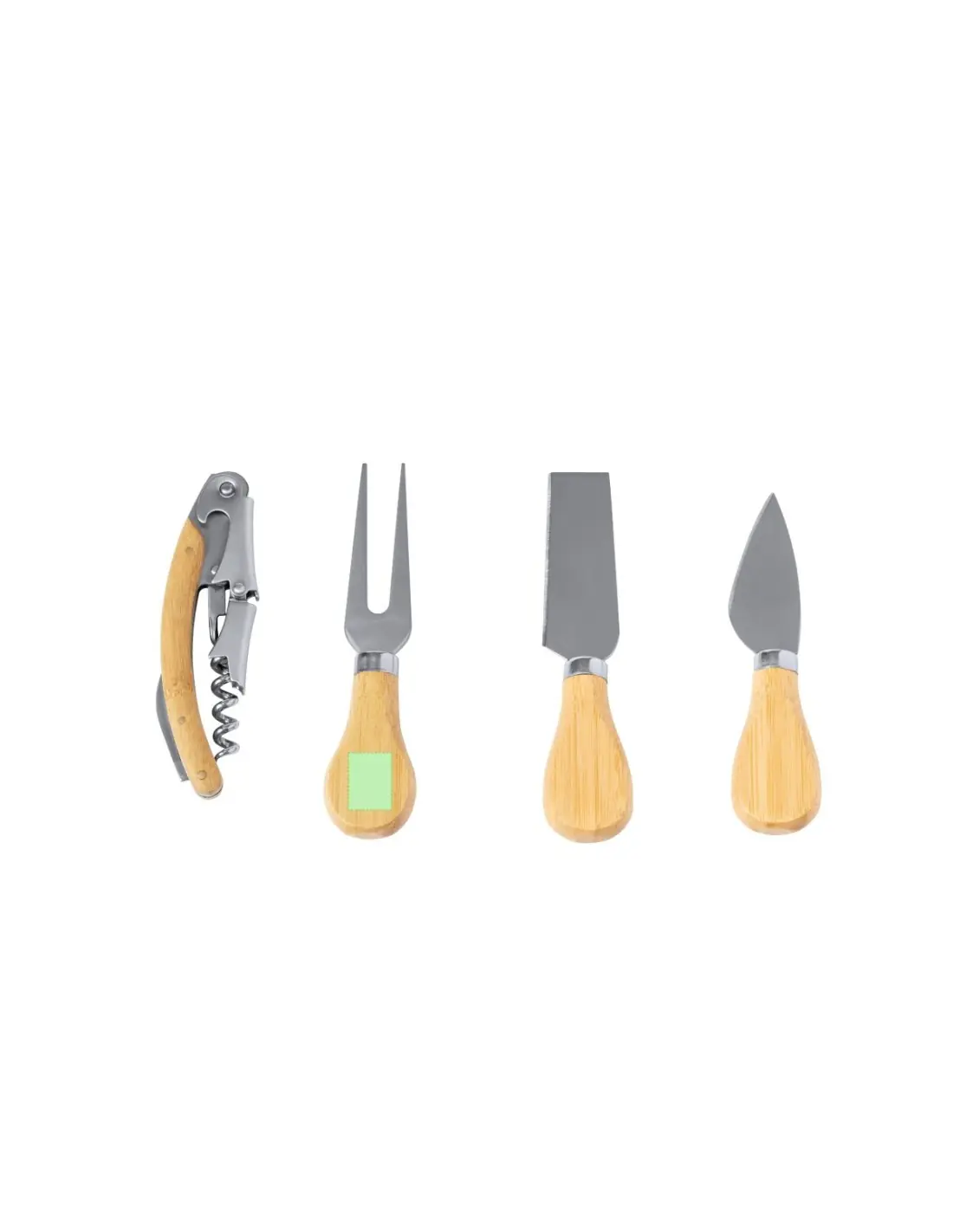 Set de quesos y vino con accesorios fabricados en resistente acero inox, con mango en bambú. Accesorios presentados en un original estuche de cartón corrugado, con interior troquelado para cada uno. Incluye utensilios para quesos duros, blandos y troceados; y un abridor de dos tiempos con cuchilla cortacápsulas.Materiales como el bambú fomentan la utilización de materias primas naturales, reduciendo las emisiones contaminantes. Proviene de una planta de gran resistencia y versatilidad, con crecimiento y regeneración rápidos, siendo una excelente alternativa al uso de madera tradicional.