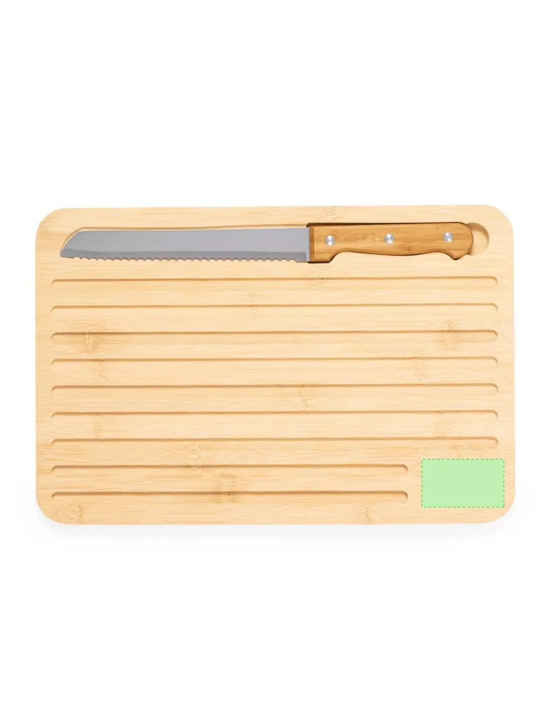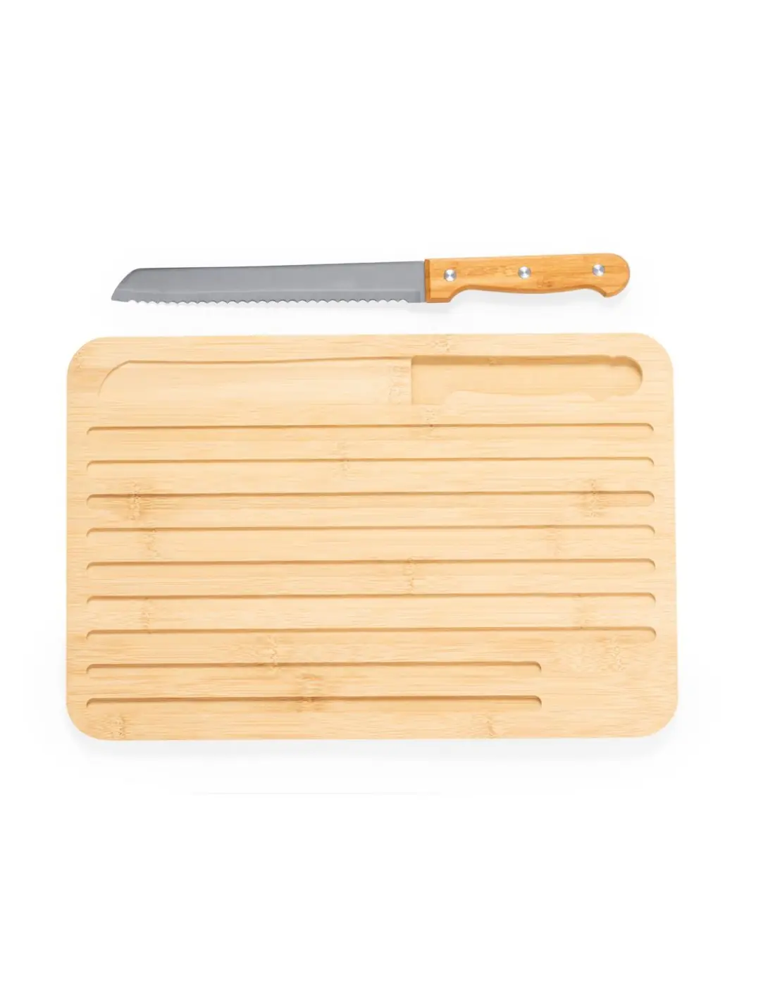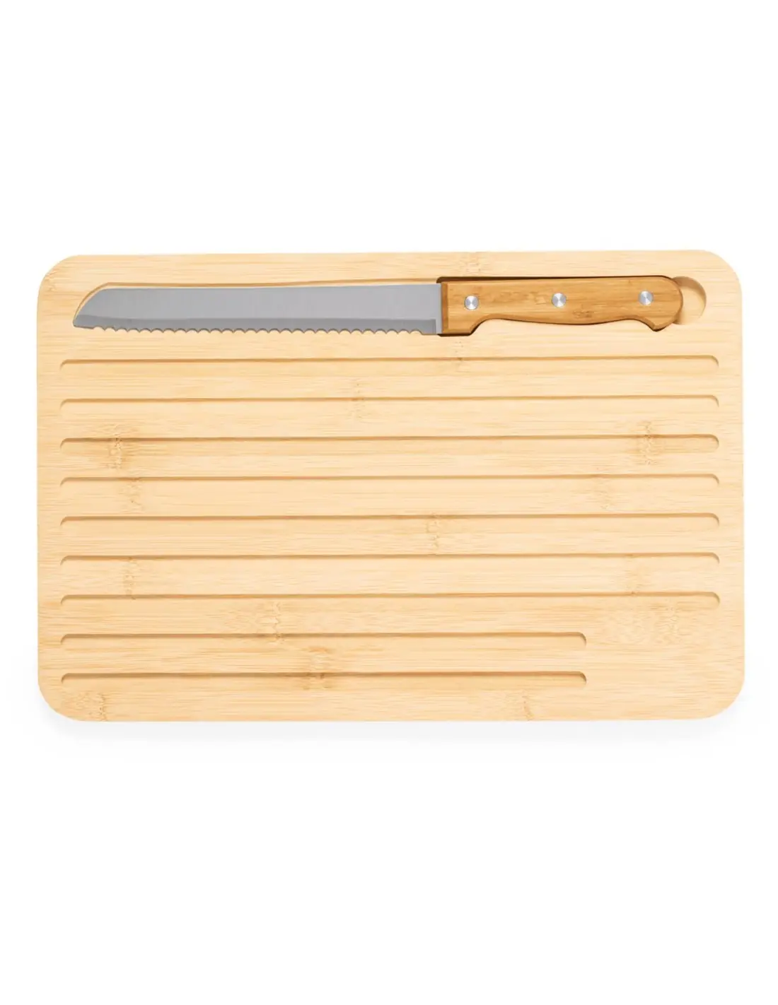 Tabla de cocina fabricada en bambú, acompañada de un cuchillo. Su cara lisa permite diversas aplicaciones, mientras que la otra presenta surcos grabados en la madera, ideal para cortar pan o alimentos jugosos. Incluye un compartimento con un cuchillo de sierra de hoja de acero y mango en bambú. Materiales como el bambú fomentan la utilización de materias primas naturales, reduciendo las emisiones contaminantes. Proviene de una planta de gran resistencia y versatilidad, con crecimiento y regeneración rápidos, siendo una excelente alternativa al uso de madera tradicional.