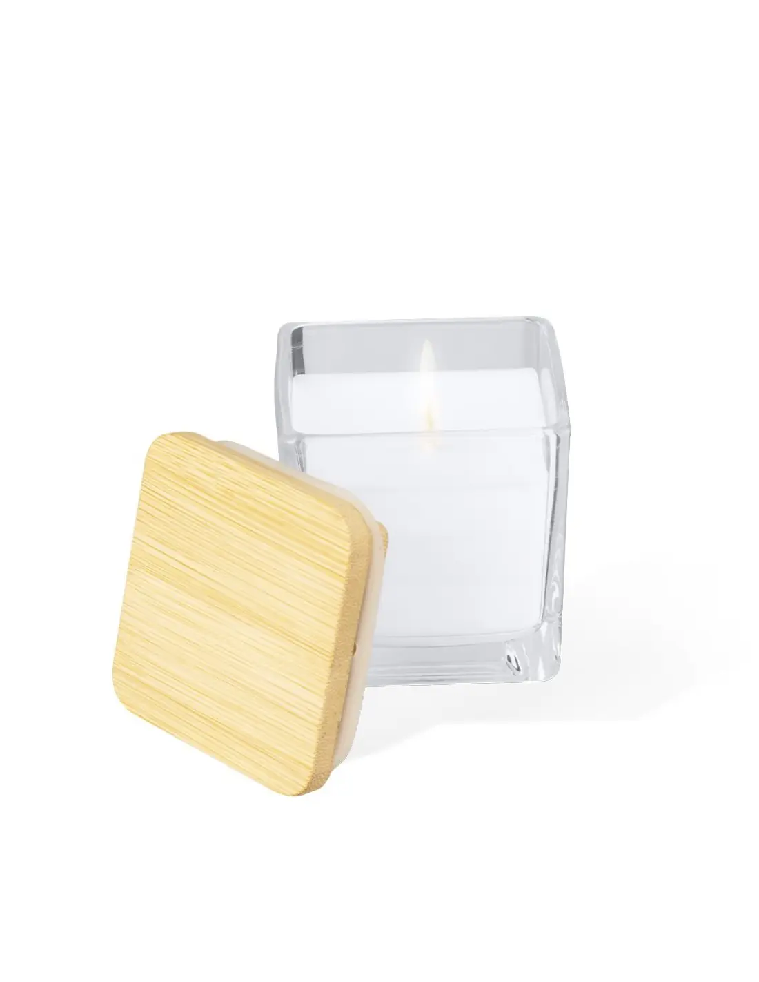 Vela aromática con perfume vainilla. Viene en tarro de cristal transparente, de forma cuadrada y con tapadera en bambú. Presentada en caja individual de diseño kraft. Materiales como el bambú fomentan la utilización de materias primas naturales, reduciendo las emisiones contaminantes. Proviene de una planta de gran resistencia y versatilidad, con crecimiento y regeneración rápidos, siendo una excelente alternativa al uso de madera tradicional.