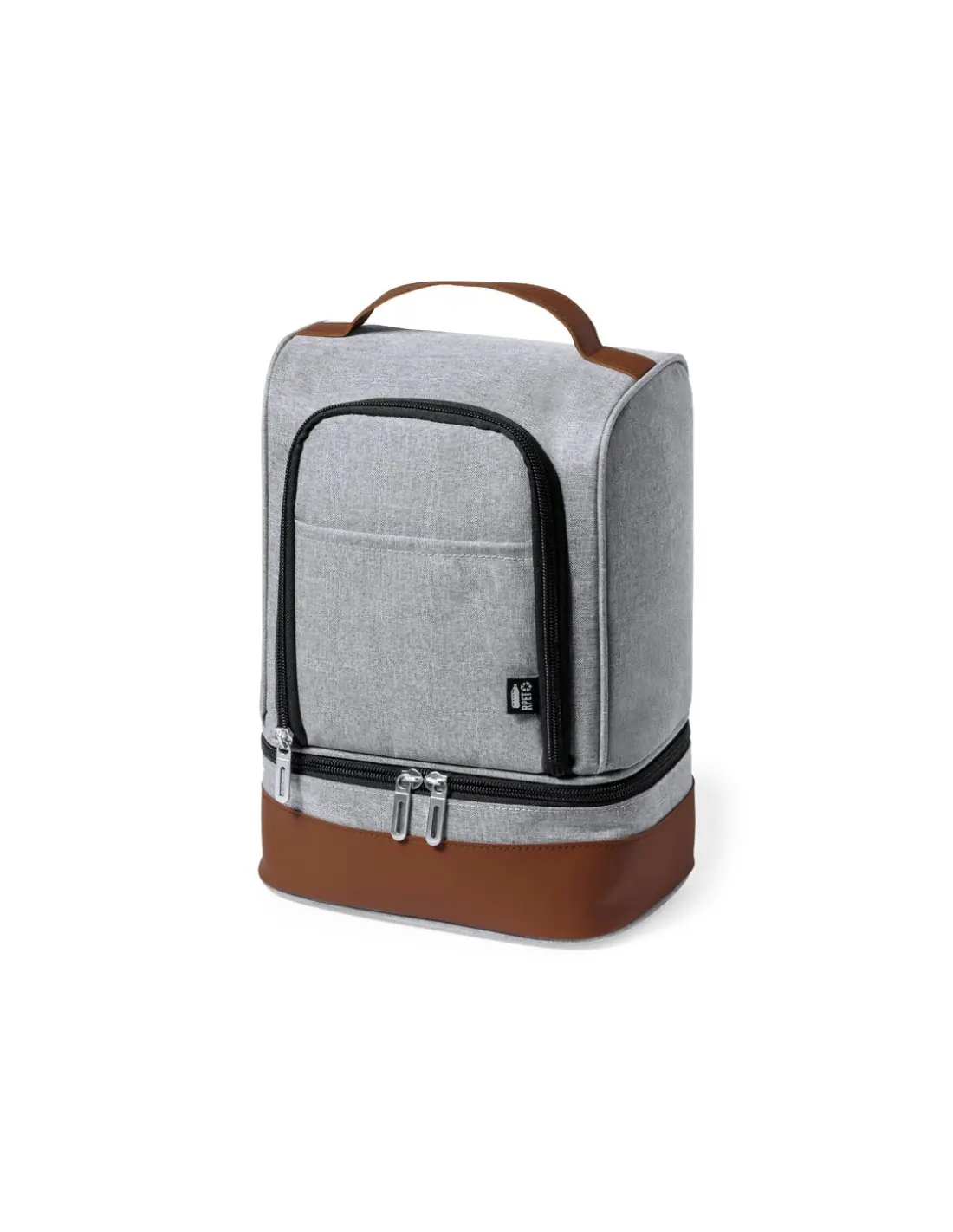 Nevera fabricada en resistente 600D RPET. Acabado en color gris, con base y asa de transporte en polipiel marrón. Incluye 2 compartimentos...