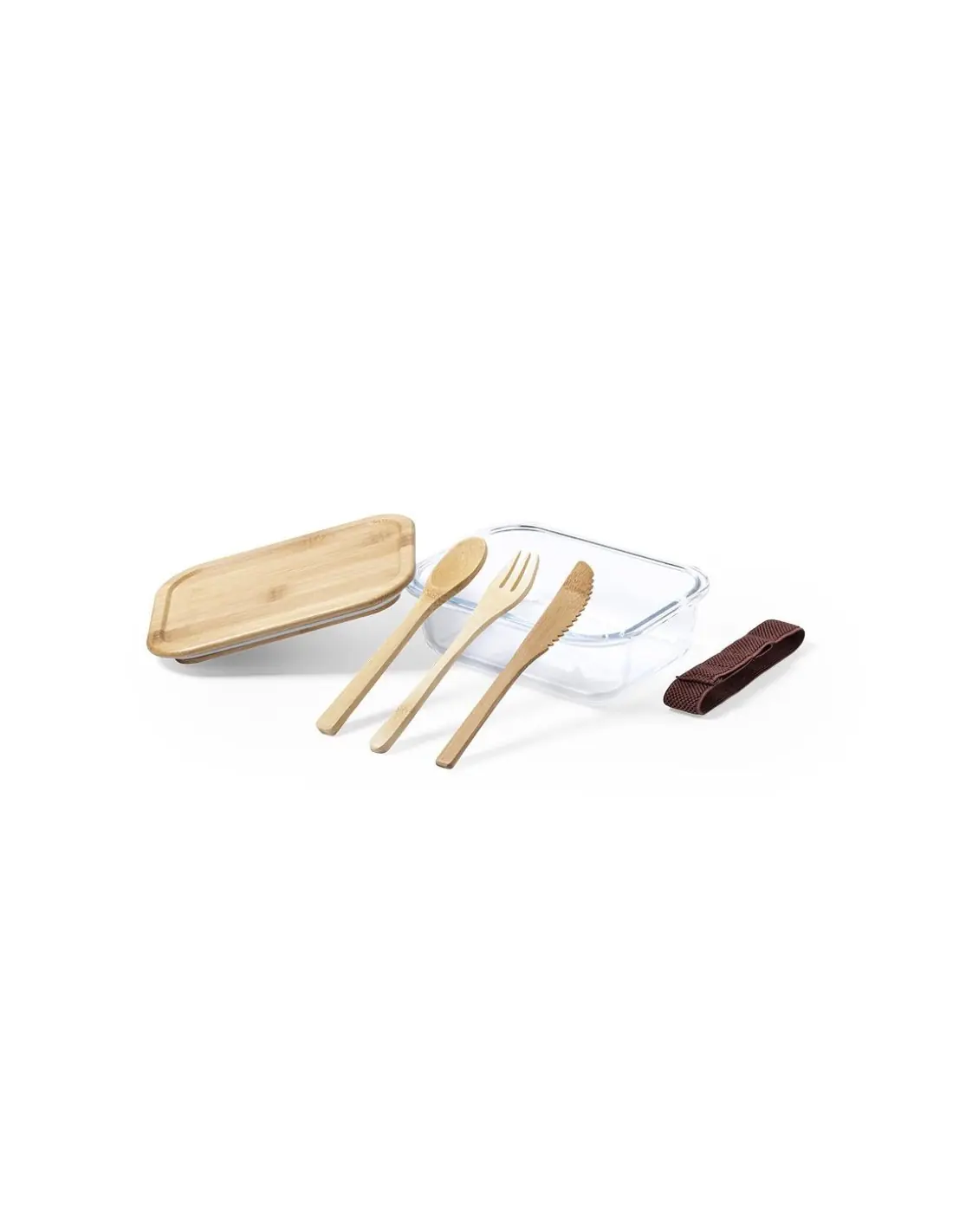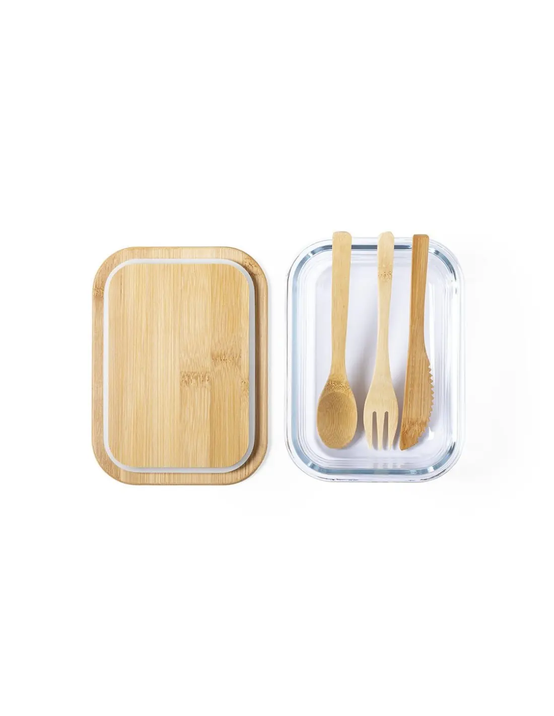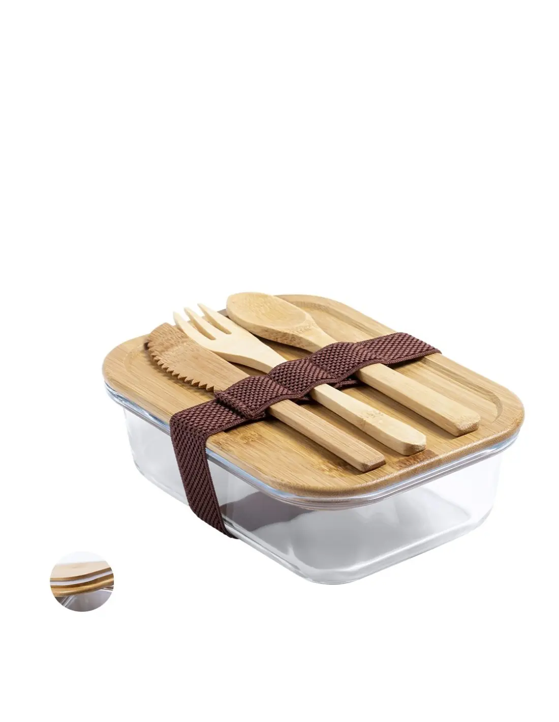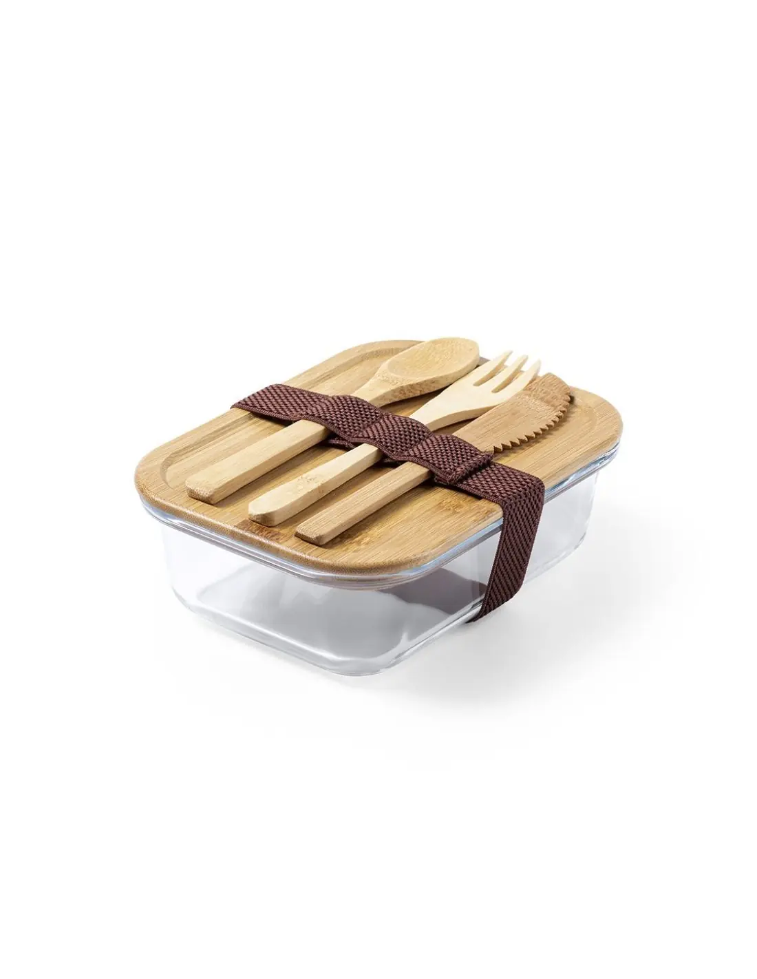 Fiambrera de línea nature de 700 ml de capacidad. Fabricada en cristal, con tapa hermética de bambú pulido, con banda de goma para evitar derrames y rebaje para usarla como bandeja. Incluye cinta de seguridad con tenedor, cuchara y cuchillo. Presentada en atractiva caja individual de diseño eco.