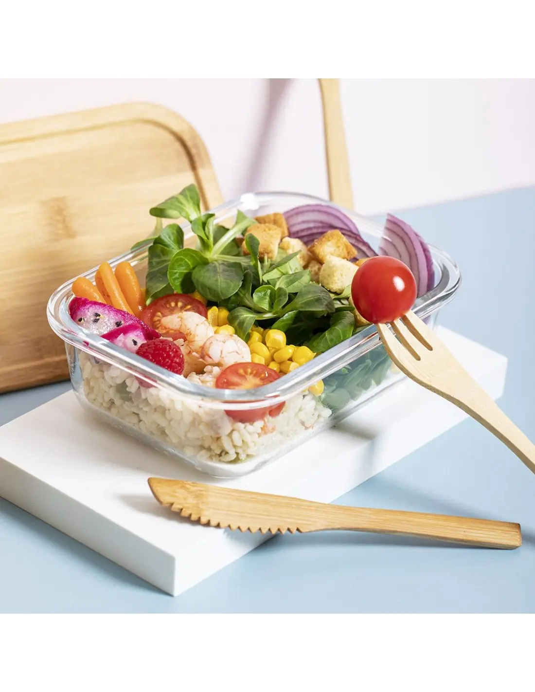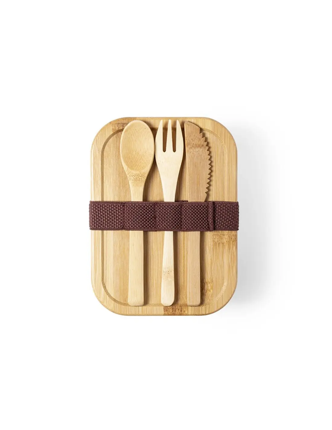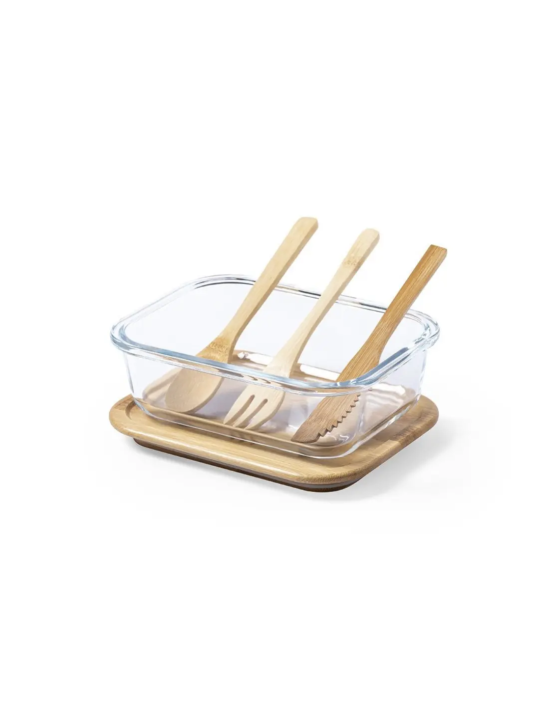Fiambrera de línea nature de 700 ml de capacidad. Fabricada en cristal, con tapa hermética de bambú pulido, con banda de goma para evitar derrames y rebaje para usarla como bandeja. Incluye cinta de seguridad con tenedor, cuchara y cuchillo. Presentada en atractiva caja individual de diseño eco.
