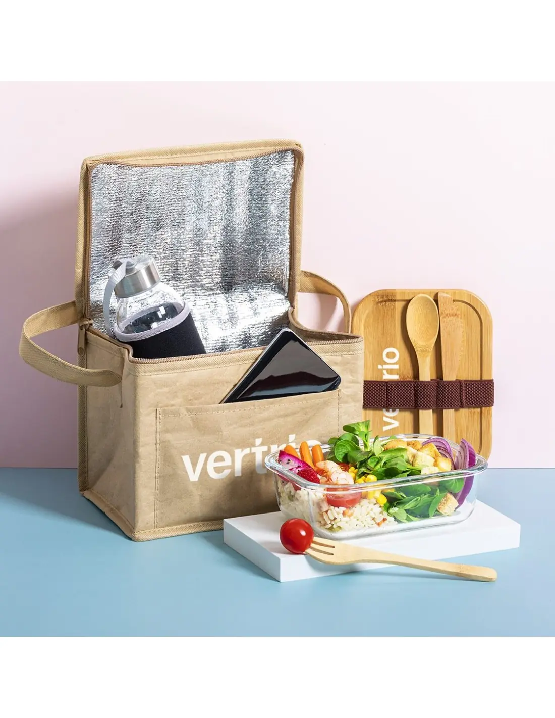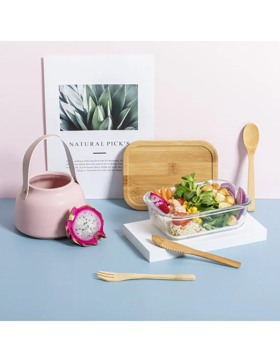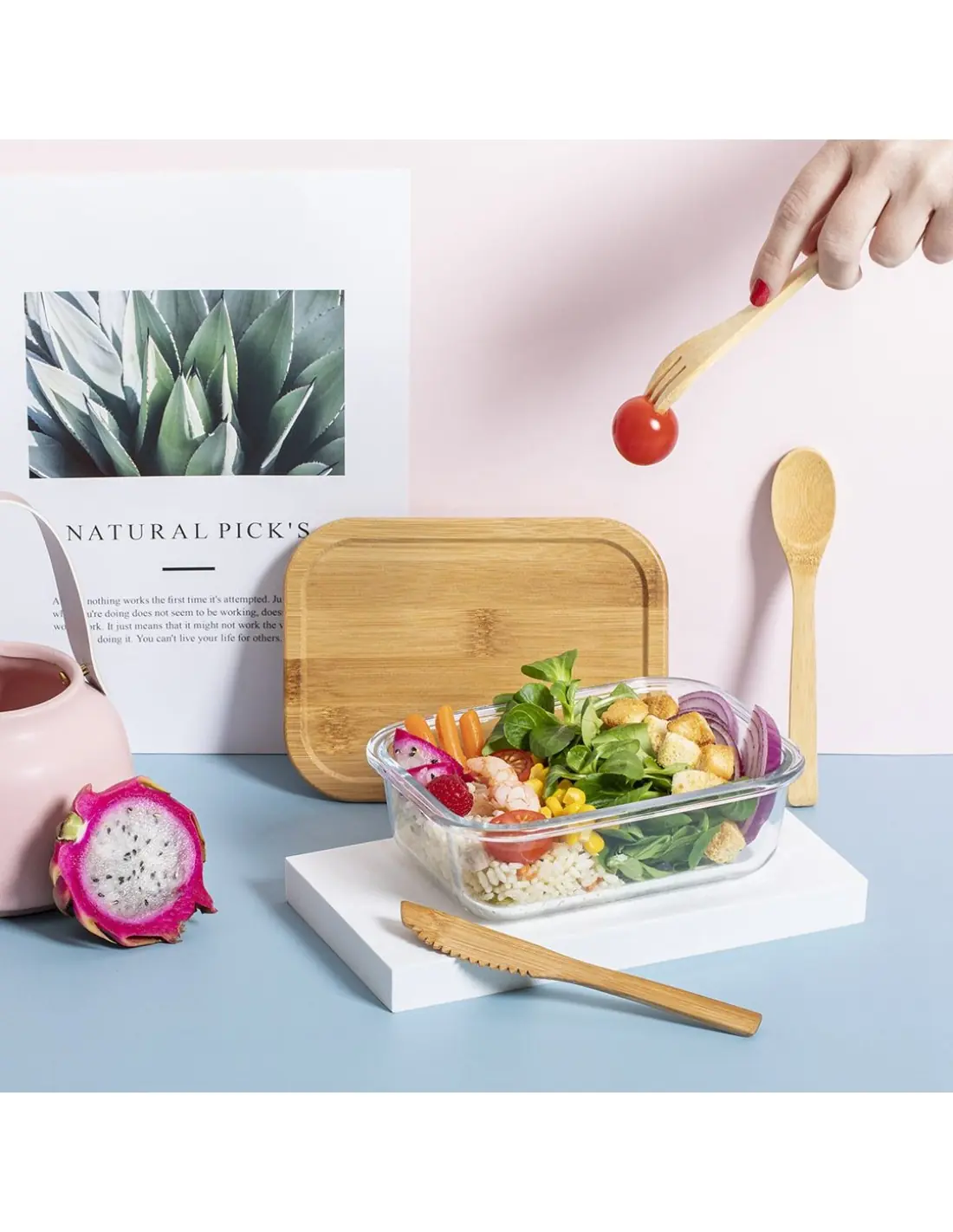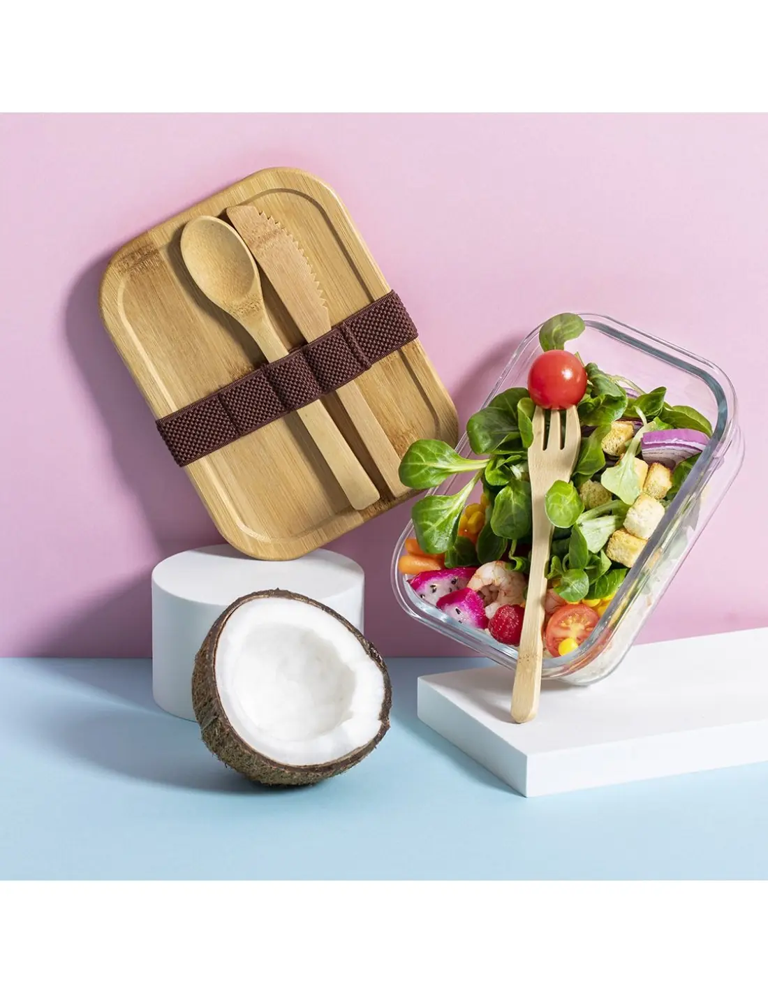 Fiambrera de línea nature de 700 ml de capacidad. Fabricada en cristal, con tapa hermética de bambú pulido, con banda de goma para evitar derrames y rebaje para usarla como bandeja. Incluye cinta de seguridad con tenedor, cuchara y cuchillo. Presentada en atractiva caja individual de diseño eco.