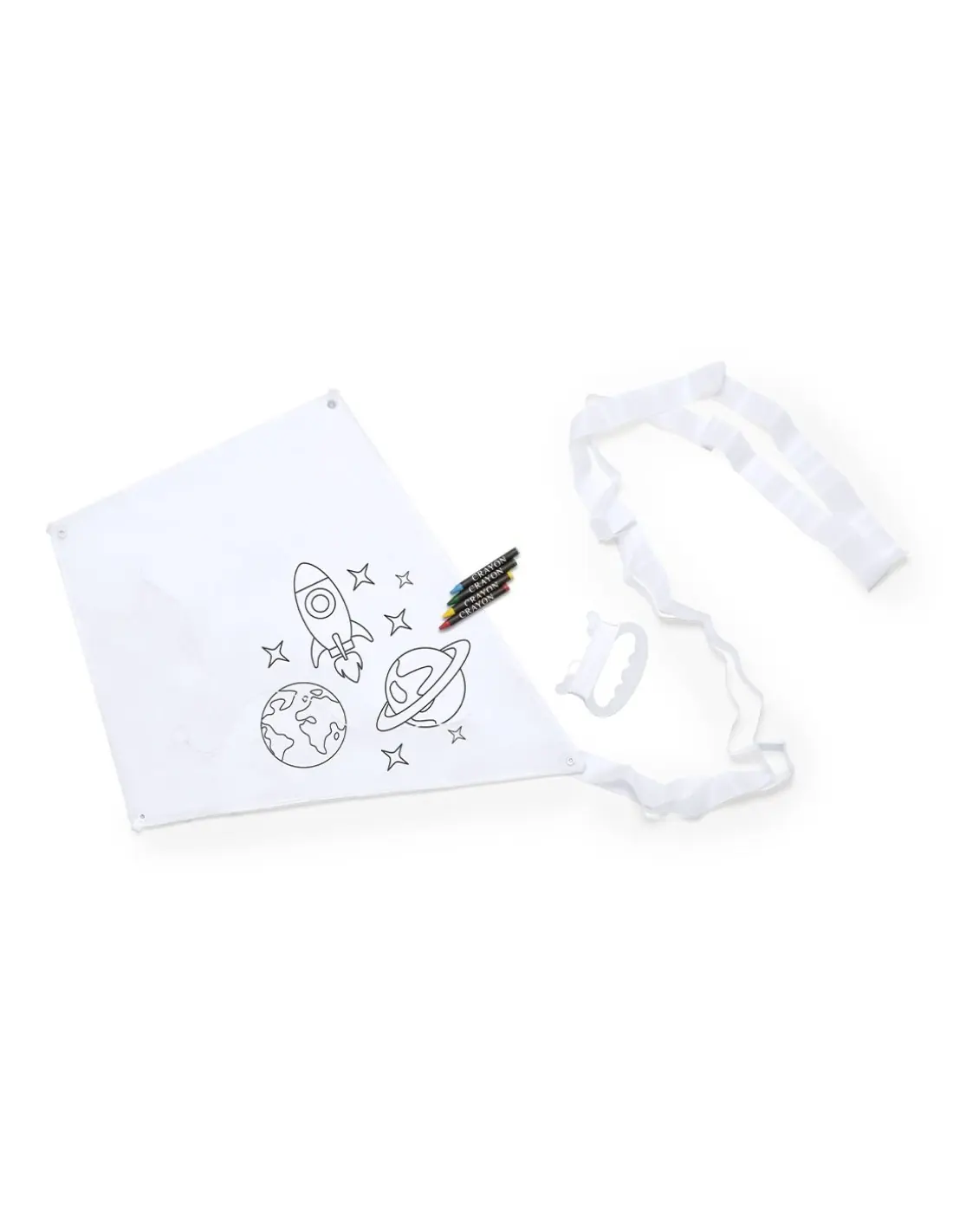 Divertida cometa para montar y pintar en resistente poliéster 190T, con 4 ceras incluidas.