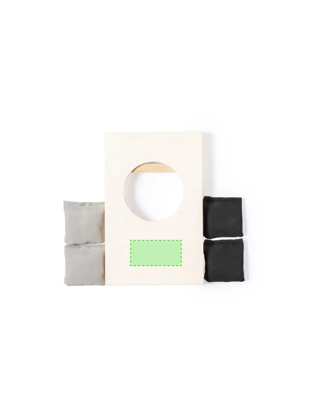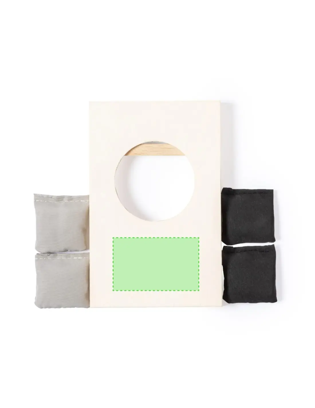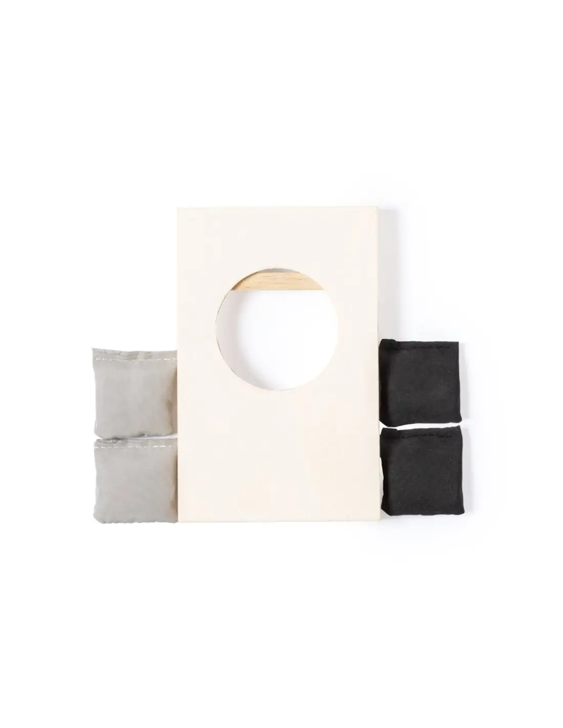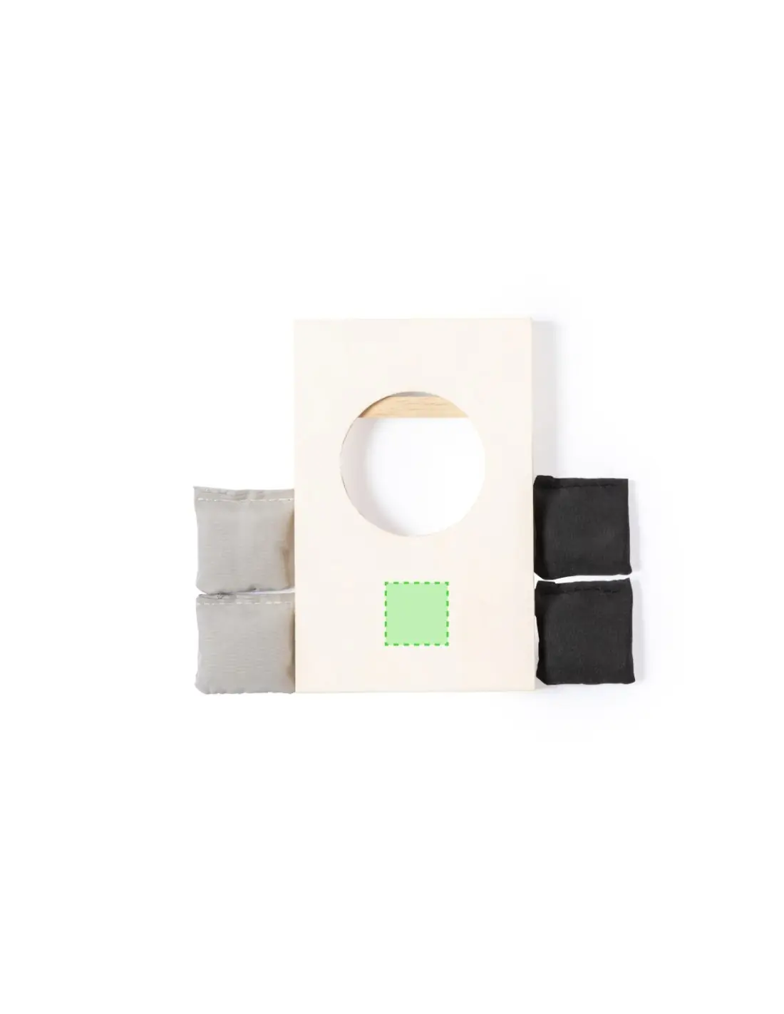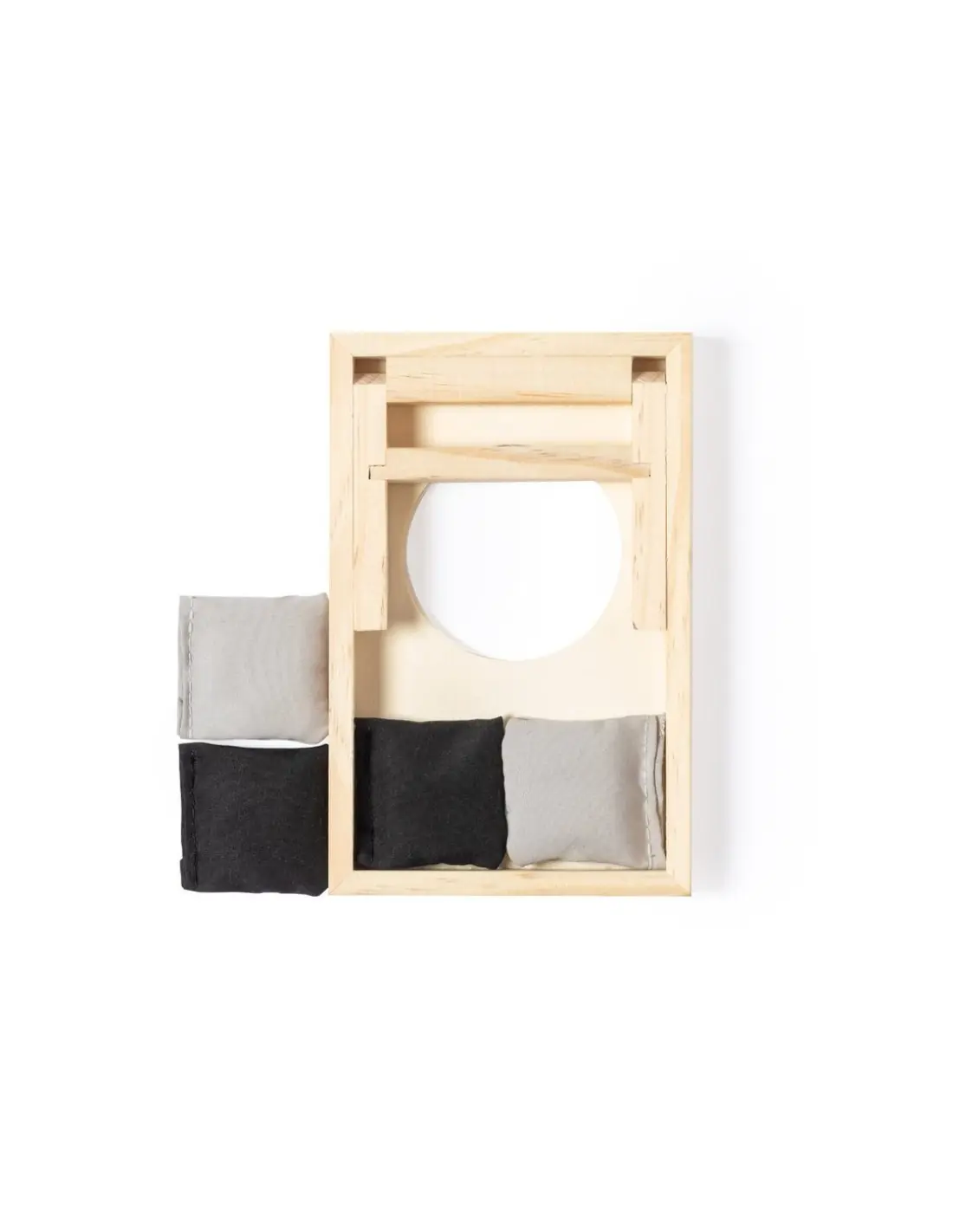 Juego de habilidad fabricado en resistente madera de pino. Base con agujero y 4 saquitos rellenos arena en 2 colores. Presentación en caja individual de diseño kraft.