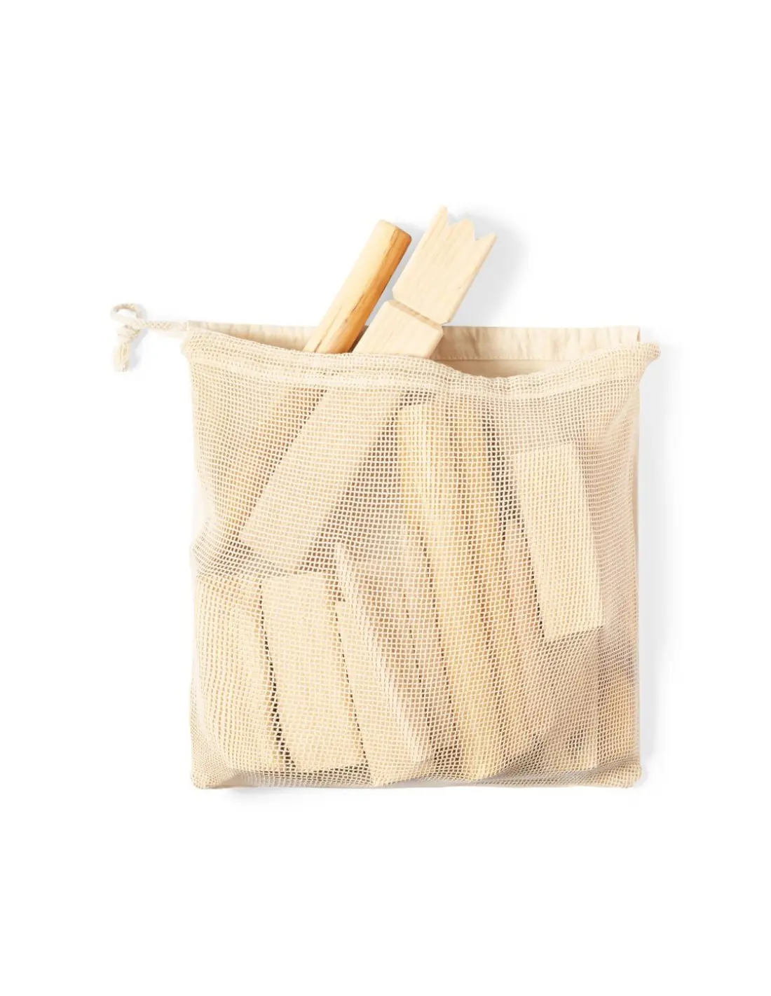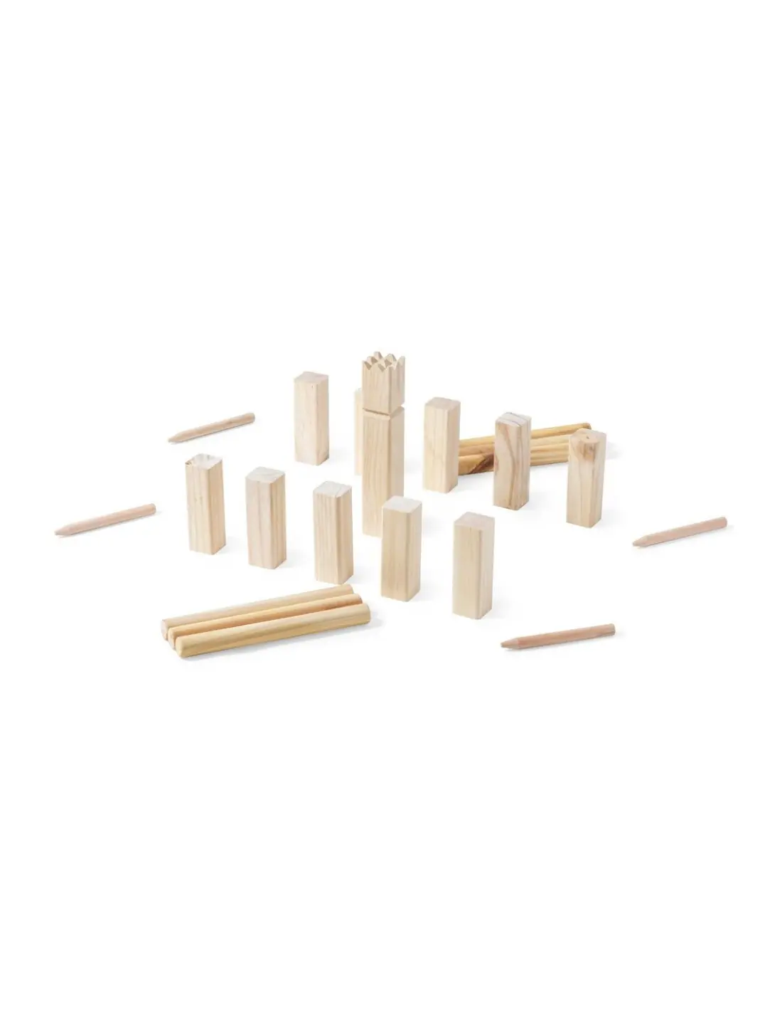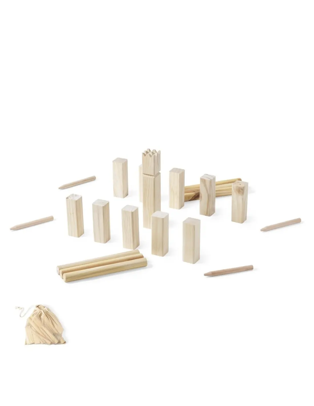 Juego ancestral de kubb fabricado en resistente madera natural de pino. Set de 21 piezas, en bolsa de transporte 100% algodón con cordón de cierre a juego. Presentación en caja individual de diseño kraft, con manual de instrucciones en español e inglés.
