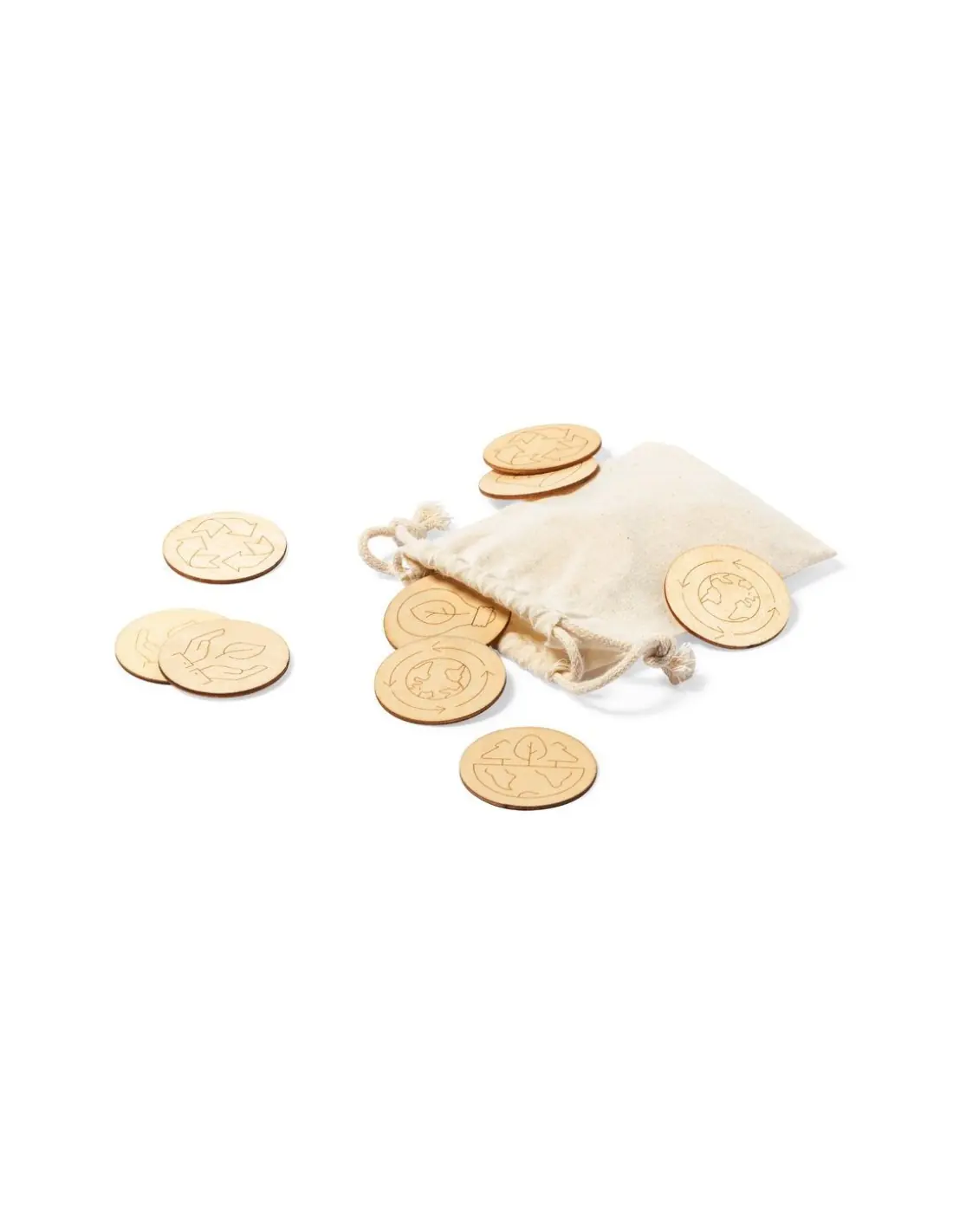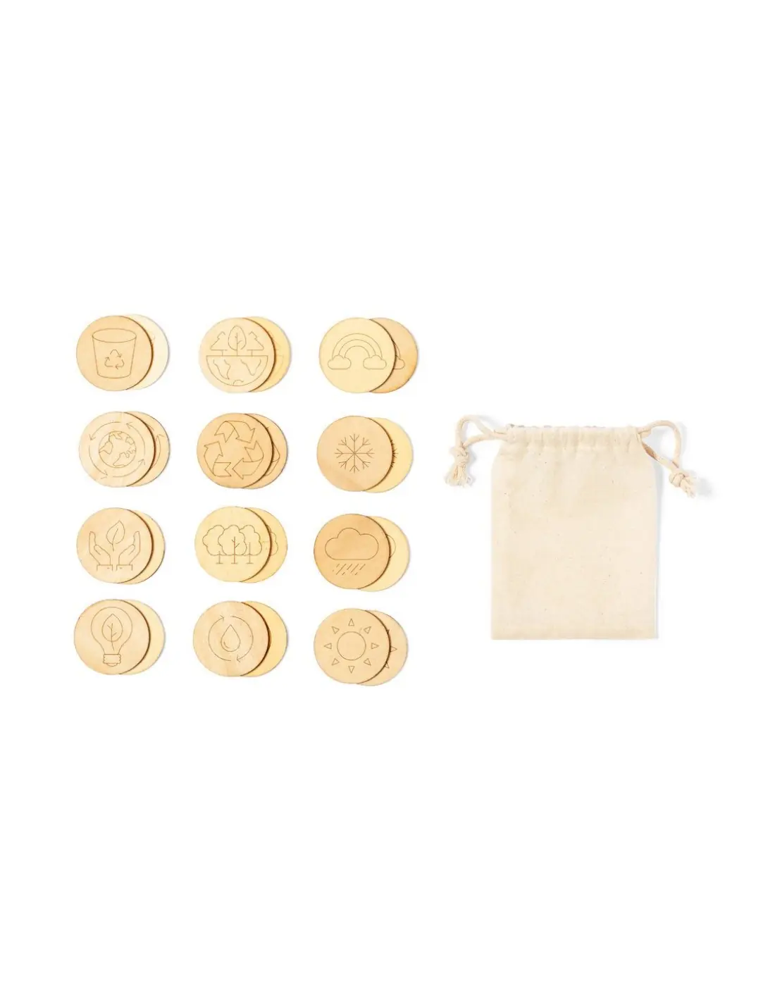 Juego de concienciación ecológica fabricado en madera. Set de 24 piezas en bolsa de transporte 100% algodón con cordones de cierre a juego.