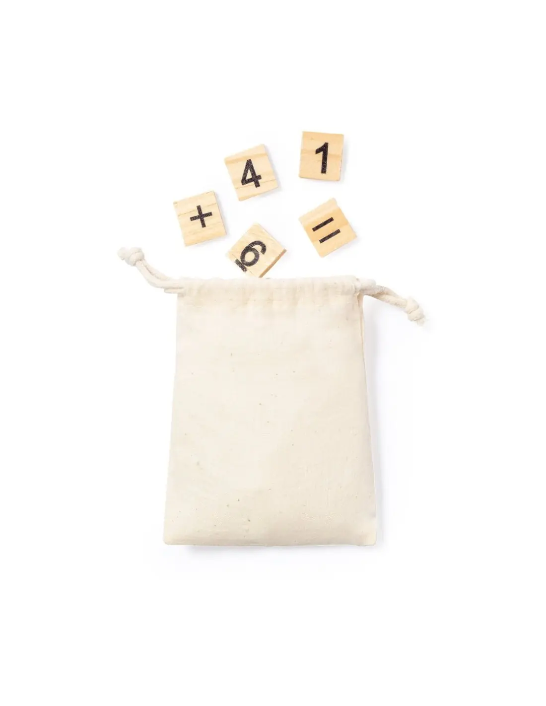 Juego de calculo fabricado en resistente madera natural de pino. Set de 32 piezas en bolsa de transporte 100% algodón con cordones de cierre a juego.