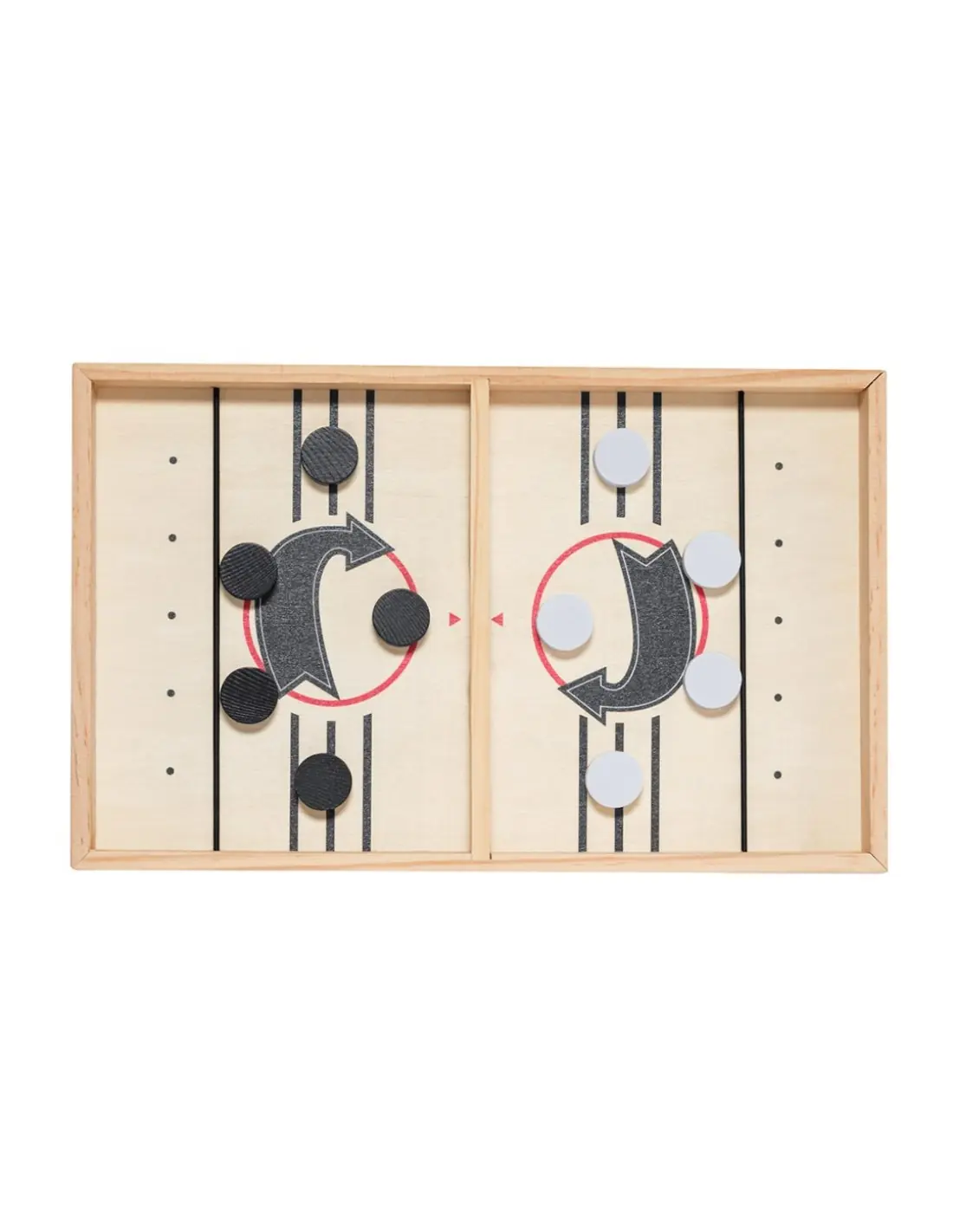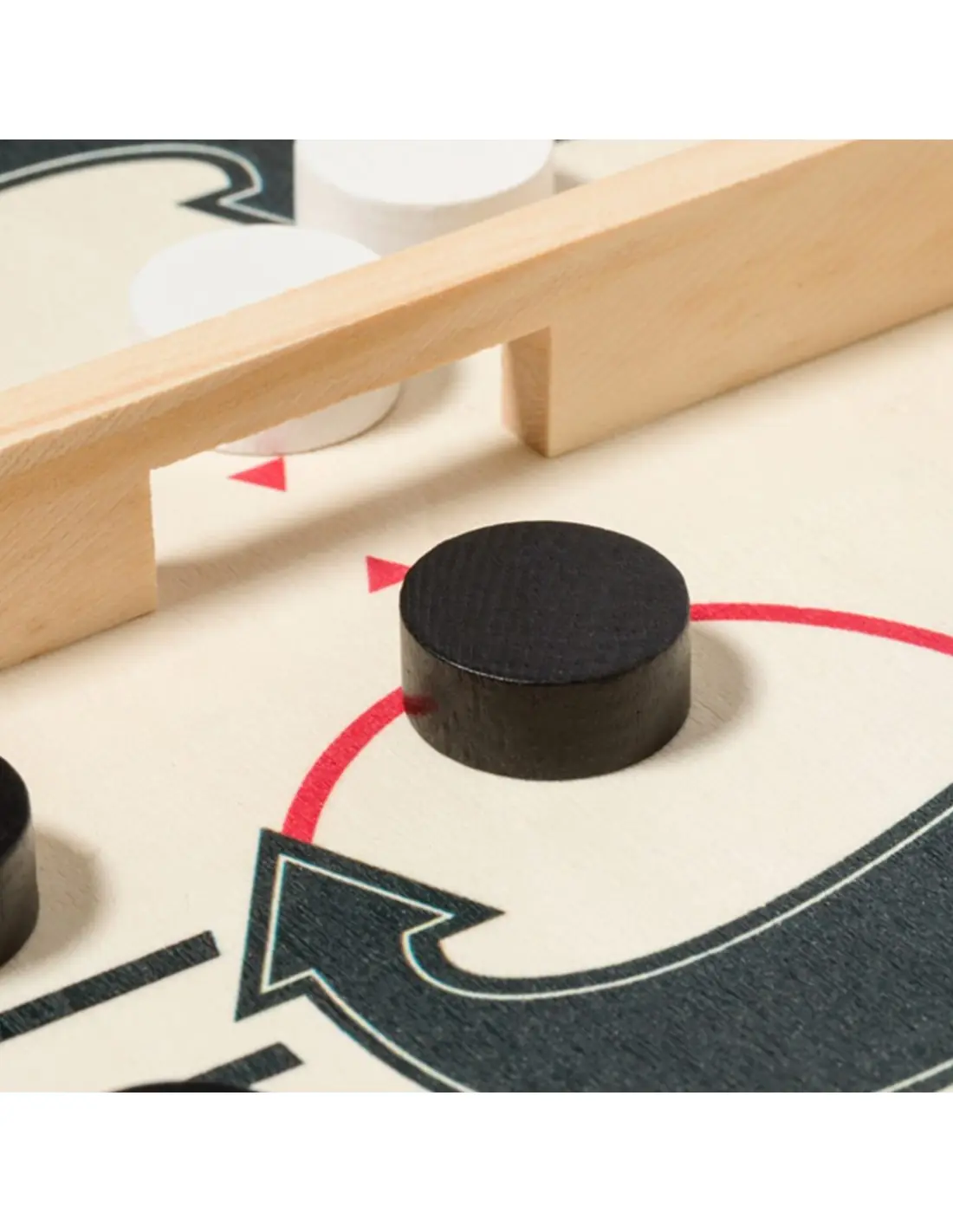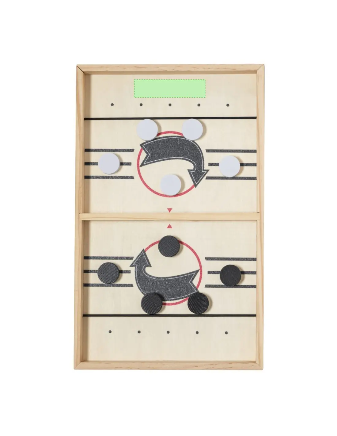 Divertido juego de mesa fabricado en madera e ideal para los más competitivos. El juego consiste en lanzar las fichas desde cada campo al capo contrario usando el elástico. Gana el que más fichas cuele por la ranura del oponente. Tablero con 5 fichas blancas y 5 negras, presentado en una caja individual de diseño kraft.