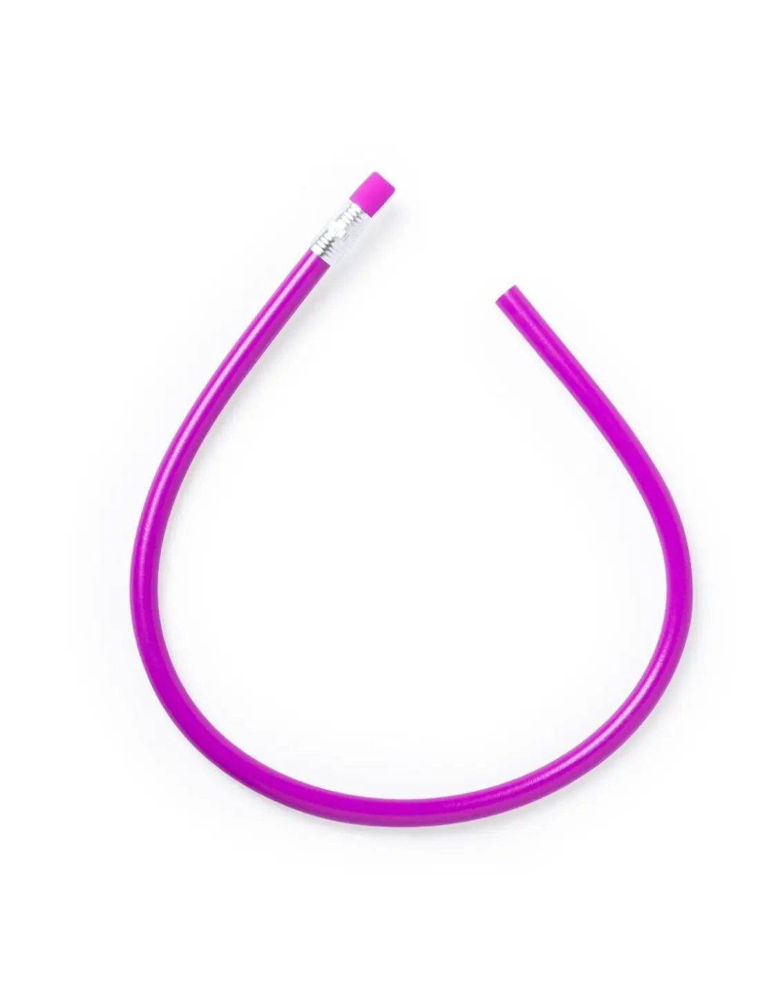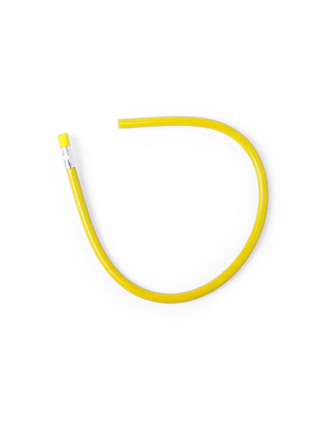 Lápiz flexible extra largo, de acabado brillo. Con cuerpo redondo y goma de borrar a juego. Disponible en variada gama de colores, con mina negra y punta sin afilar.