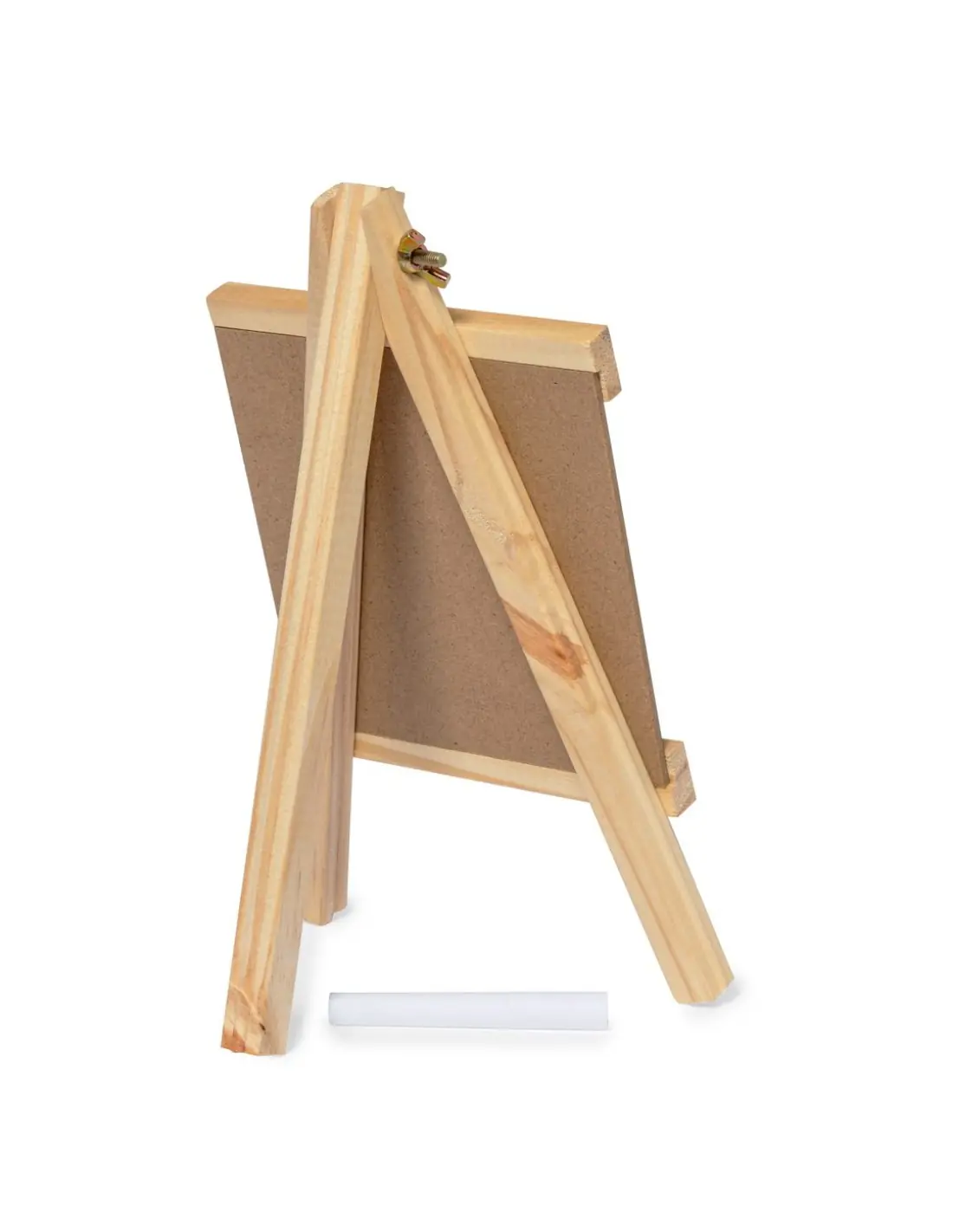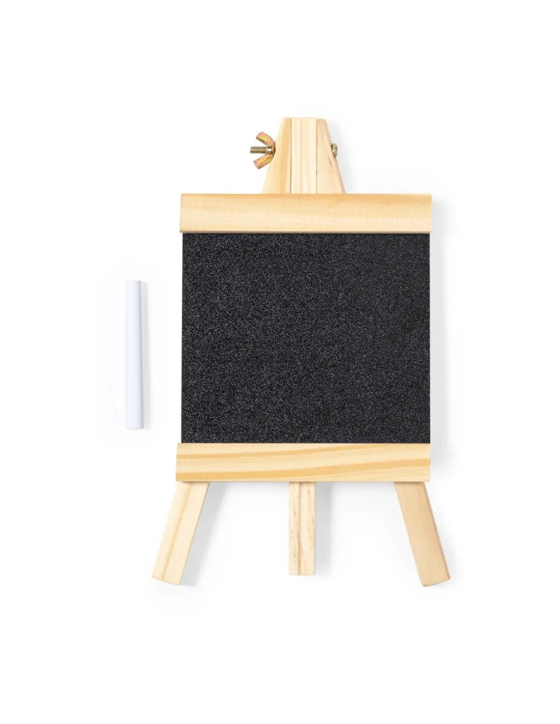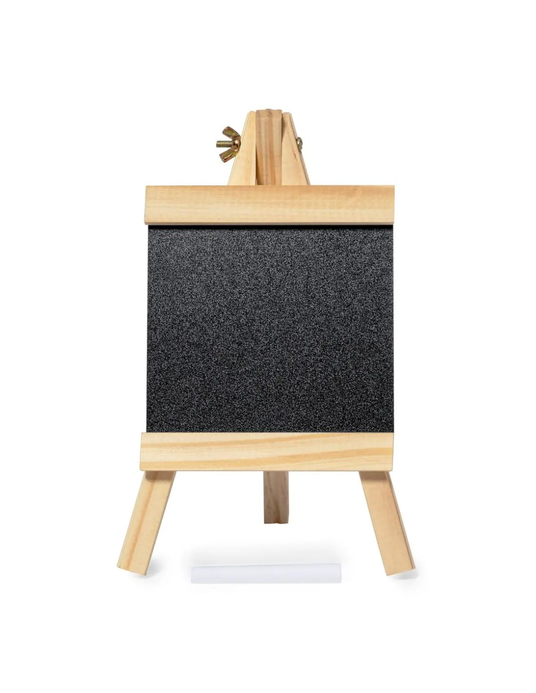 Original atril con pizarra hecha en madera, con tiza incluida. Presentado individualmente en caja de diseño kraft.