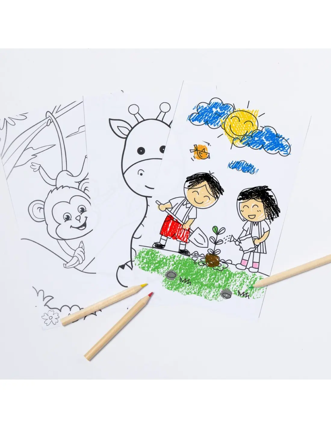 Set para colorear hecho en cartón reciclado. Divertido conjunto de dibujos y lápices de colores en una práctica carpeta con asas. Incluye:Bloc de 20 hojas con dibujos de naturaleza para colorear.Caja con 6 lápices de madera con minas en multitud de colores.Sacapuntas.Goma de borrar.