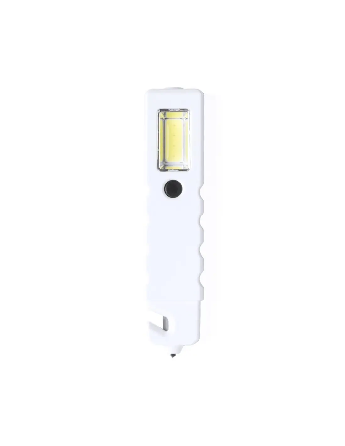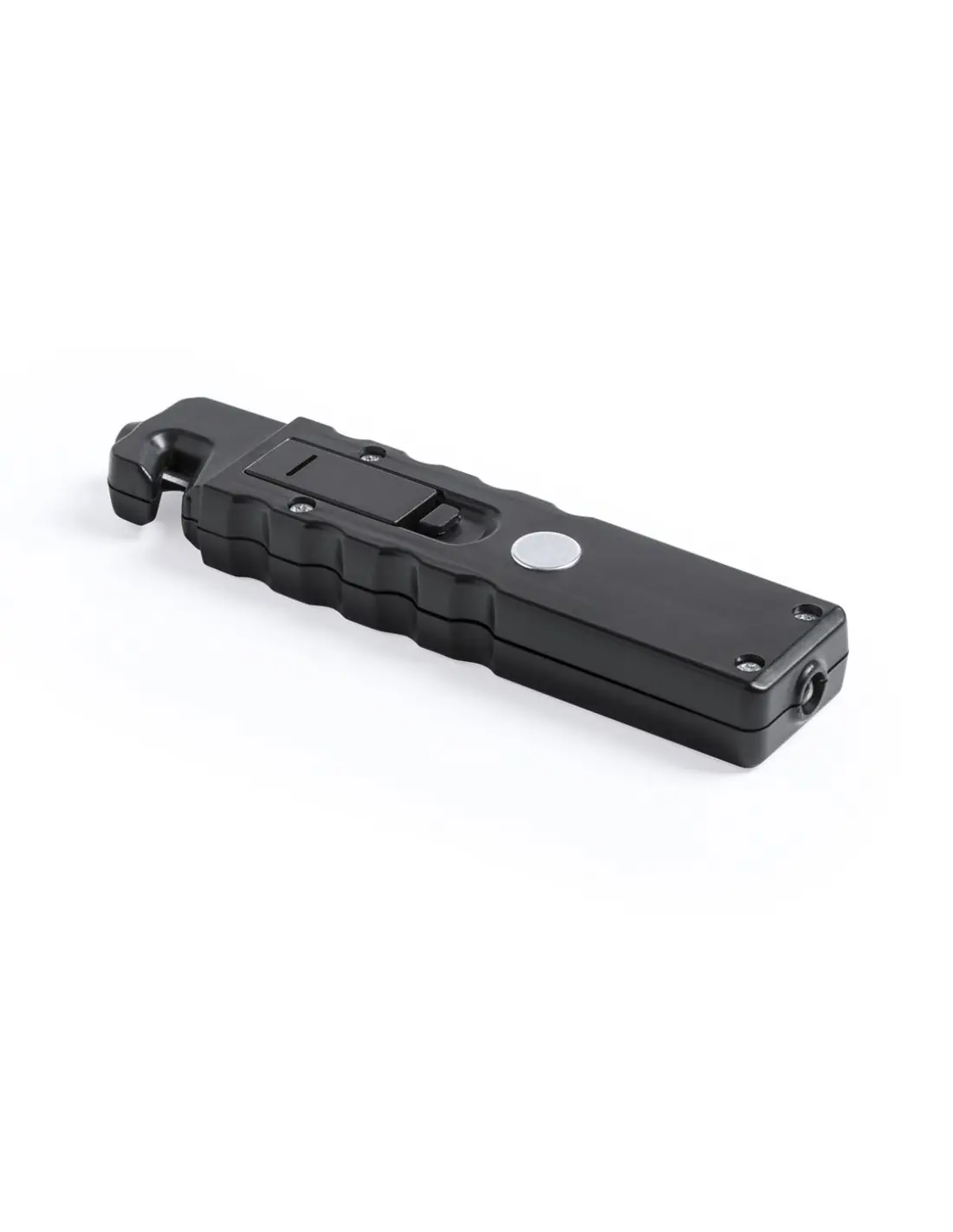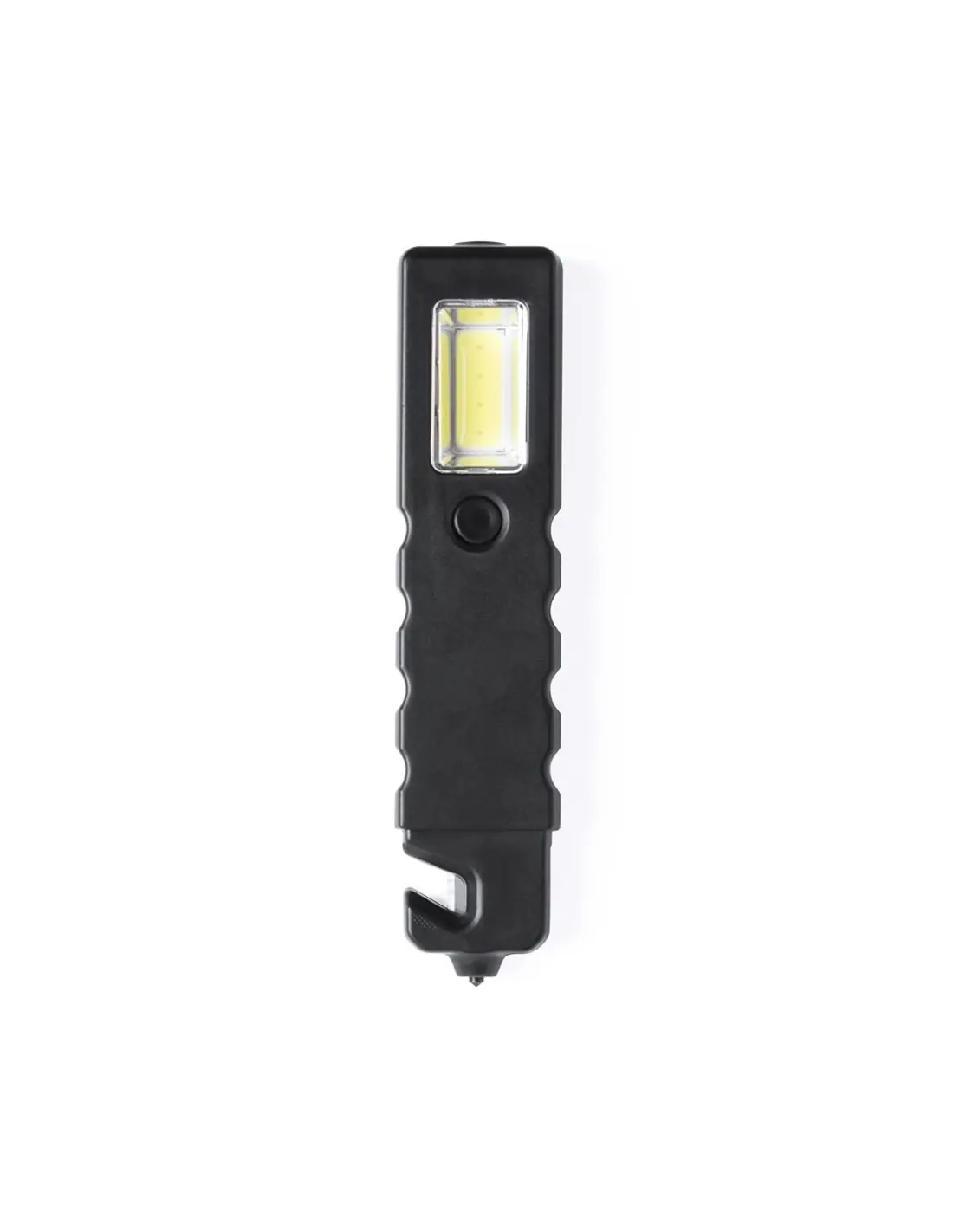Martillo de emergencia 3 en 1 con linterna led y 4 luces COB con 3 modos de iluminación. Con superficie imantada y cuchilla corta cinturones.